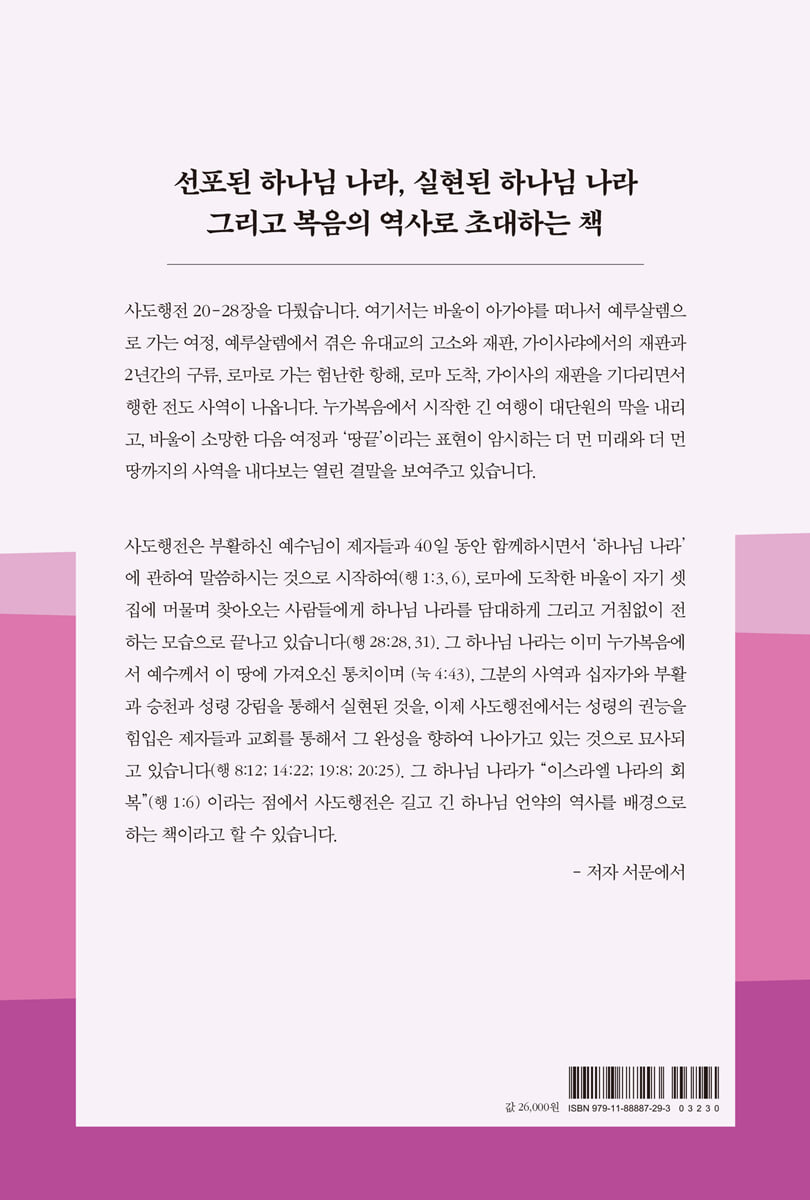 사명을 마칠 수만 있다면 | 20:1-38 들어가는 말·바울이 마게도냐와 헬라의 성도들을 돌아보다·아시아의 교회들을 돌아보다·바울이 에베소 장로들에게 고별설교를 하다·바울과 장로들의 눈물의 이별·나가는 말 주의 뜻대로 이루어지리이다 | 21:1-16 들어가는 말·밀레도에서 두로까지·두로에서 가이사랴까지의 여정·나가는 말 예루살렘의 불신과 불의 앞에서 | 21:17-36 들어가는 말·예루살렘 유대인 형제들의 불신 앞에서·예루살렘 유대인의 불의 앞에서·나가는 말 주께 붙들리고, 주께서 보내시고 | 21:37-22:29 들어가는 말·구조·변론할 기회를 얻는 바울·나가는 말 로마에서도 증언하리라 | 22:30-23:35 들어가는 말·구조·공회 앞에 서다·바울의 변증과 대제사장의 폭행 지시·바 리새인의 도움을 받다·천부장이 바울을 보호하다·주께서 바울의 로마행을 예고하시다·유대인들이 바울을 살해하려고 모의하다·생질의 도움으로 위기를 모면하다·바울이 가이사랴로 이송되다·총독 벨릭스 앞에 서다·나가는 말 하나님과 사람에 대하여 거리낌이 없기를 힘쓰나이다 | 24:1-27 들어가는 말·더둘로의 고발·바울의 변론·벨릭스의 반응·가이사랴 2년의 의미·가이사랴에서 쓴 서신들·나가는 말 가이사에게 심문을 받을 것이라 | 25:1-22 들어가는 말·신임총독 베스도가 예루살렘을 방문하여 유대인의 고소를 듣다·유대교의 고소와 바울의 상소·아그립바 왕과 총독·나가는 말 다 나와 같이 되기를 원하나이다 | 25:23-26:32 들어가는 말·구조·베스도가 아그립바에게 도움을 청하다·재판의 도입·유대교에 충실한 바울·그리스도에게 충실한 바울·재판의 마무리·나가는 말 구원의 여망마저 없어졌더라 | 27:1-20 들어가는 말·구조·로마로 가는 배에 오르다·힘겹게 미항에 당도하다·배가 미항에 도착하다·바울의 조언을 거절하여 광풍을 만나 표류하다·나가는 말 너와 함께 항해하는 자를 다 네게 주셨느니라 | 27:21-44 들어가는 말·1차 조언: 바울이 주의 말씀을 전하다·2차 조언: 바울이 사공들의 탈출을 막다·3차 조언: 바울이 음식을 먹도록 권하다·결과: 배를 탄 모든 사람들이 구조되다·또다시 찾아온 위기·나가는 말 구원과 환대 | 28:1-15 들어가는 말·반복되는 환대의 역사·멜리데에서의 사역·바울 일행이 로마를 향하여 떠나다·나가는 말 담대하고 거침없이, 로마에서 복음을 | 28:16-31 들어가는 말·로마 도착과 가택 연금·유대 높은 사람들과의 만남·유대인들과의 두 번째 만남·로마에서의 2년의 사역·나가는 말 미주 |