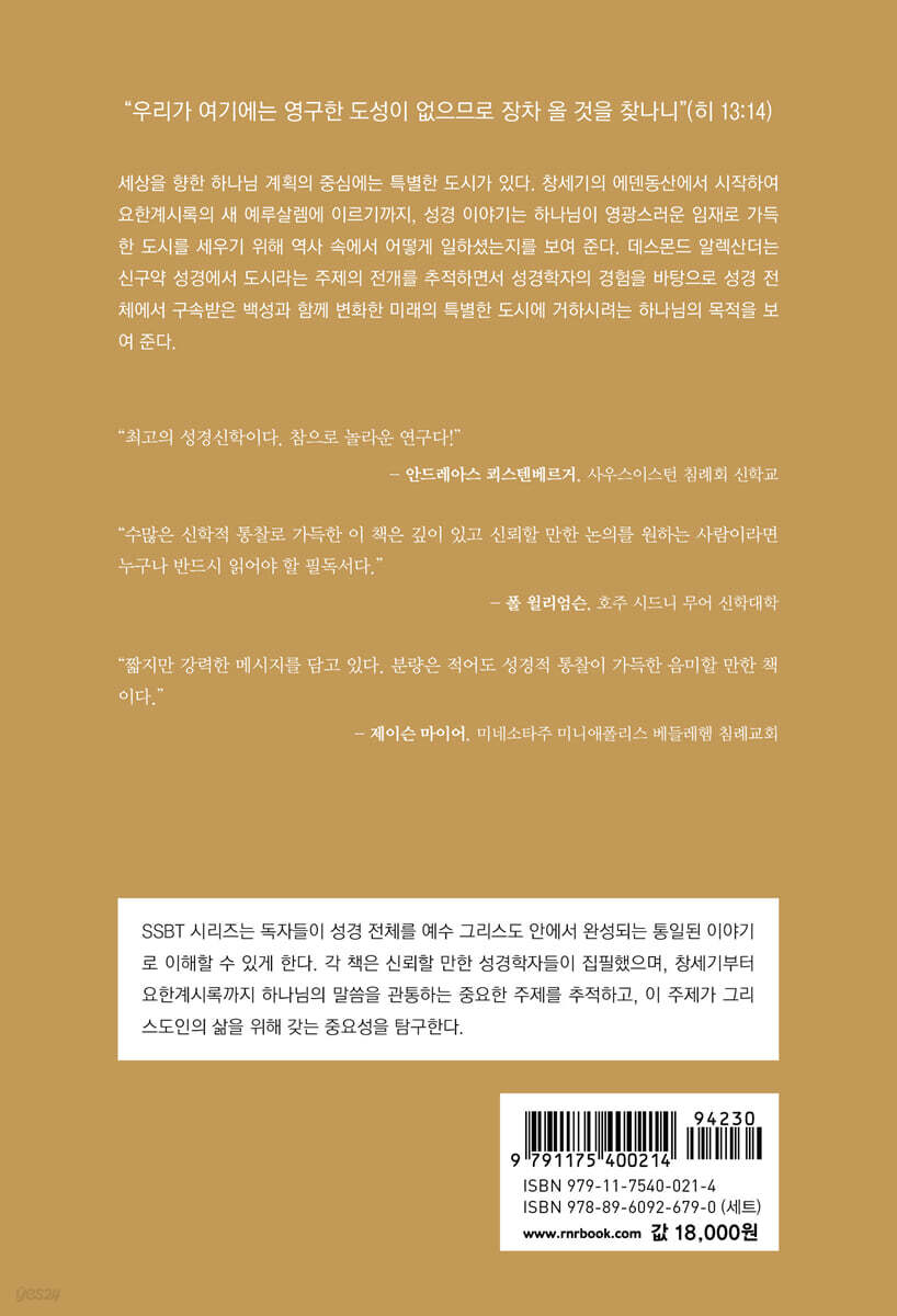 이 책은 독자가 성경의 핵심 주제인 하나님의 도시의 중요한 의미뿐 아니라 성경이 어떻게 일관된 이야기와 한결같은 메시지를 담고 있는지 파악하도록 도와준다. 수많은 신학적 통찰로 가득한 이 책은 깊이 있고 신뢰할 만한 논의를 원하는 사람이라면 누구나 반드시 읽어야 할 필독서다. - 폴 윌리엄슨 (호주 시드니 무어 신학대학 구약학 강사, 『맹세로 인친 언약』, 『죽음과 내세』 저자)