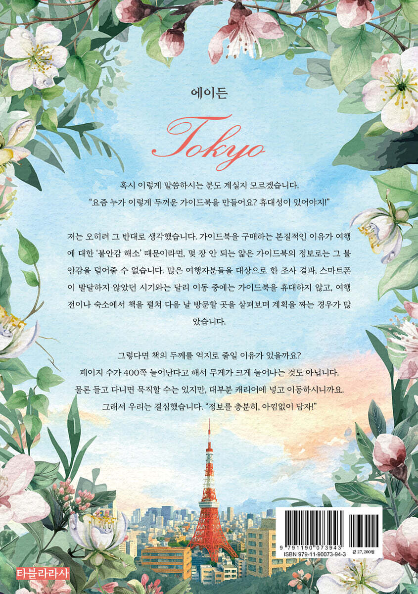 두 번째 해외 여행 가이드북!드디어 에이든 도쿄(요코하마·가마쿠라·하코네·가와구치코·사와라·가와고에 포함)로 출발합니다. 다들 그렇게 말합니다. 에이든이 만들면 신뢰할만 하다고!!! 에이든은 여러분께 단순 정보가 아닌 여행의 불안을 해소시켜 드립니다. 그냥 이책 하나면 이제 더이상 힘들게 인터넷 알아보지 않으셔도 됩니다. 타블라라사는 라틴어로 ‘빈 서판’을 뜻합니다. 아무것도 없는 백지에 그림을 그려가듯, 에이든은 아직 세상에 없는 여행 콘텐츠를 한 줄 한 줄, 하나씩 그려가고자 합니다. 마케팅에 의존해 브랜드를 키우지 않을 것이며, 오로지 콘텐츠만으로 여행자들에게 작은 빛이 될 것입니다. 타블라라사는 혁신을 지향하는 스타트업으로서 기존과는 다른 차별점을 제공할 것이며, 독자분들이 말하는 “미친 디테일”을 무기로 세계로 나아가겠습니다. ‘에이든(aiden)’은 고대 아일랜드어로 ‘작은 불빛’이라는 뜻을 지녔습니다. 여러분의 여행 준비가 막막할 때, 그 여정을 환히 비춰주는 작은 빛이 되겠습니다. 이 가이드북이 그 빛이 되어줄 수 있기를 진심으로 바랍니다. 에이든의 시작을 함께해주셔서 진심으로 감사드립니다. |