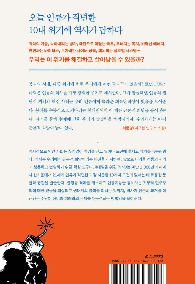 우리는 이 위기를 해결하고 살아남을 수 있을까? 역사적으로 인간 사회는 끊임없이 역경을 딛고 일어나 도전에 맞서고 위기를 극복해왔다. 《공감하는 능력》의 저자 로먼 크르즈나릭은 역사야말로 근본적 희망의 비전을 제시하며, 앞으로 다가올 격동의 시기에 생존하고 번영하기 위한 가장 중요한 도구라고 말한다. 이어서 지난 1,000년의 세계사 한가운데서 21세기 인류가 직면한 가장 시급한 10가지 도전에 맞서는 데 유용한 통찰과 영감을 발굴하고, 인류의 역사에서 얻은 통찰과 지혜가 이 도전과제들을 해결하는 데 어떻게 도움이 될지 보여준다. 위기 앞에서 우리 자신에게 던지는 10가지 질문 ㆍ화석연료 중독을 더 늦기 전에 끊을 수 있을까? ㆍ전 지구적 대량이주 시대, 모두 함께 사는 방법은? ㆍ우리는 소비주의를 버리고 쓰레기를 줄일 수 있을까? ㆍ소셜미디어를 길들이는 방법은 무엇일까? ㆍ어떻게 하면 모두를 위한 물을 얻을 수 있을까? ㆍ우리는 민주주의에 대한 믿음을 되살릴 수 있을까? ㆍ유전공학의 위험을 억제할 수 있을까? ㆍ불평등 격차를 줄이는 방법으로 어떤 것이 있을까? ㆍ인공지능을 효과적으로 통제하려면 어떻게 해야 할까? ㆍ인류는 문명의 붕괴를 피할 수 있을까? 응용역사의 시선은 식민지 시대 이전의 인도에서 쿠바혁명까지, 청나라에서 핀란드 여성 인권투쟁까지, 역사의 시공간을 넘나들며 격동의 미래를 헤쳐나갈 희망의 근거를 탐색한다. 불평등 격차를 해소하고 인공지능을 통제하는 것에서 민주주의에 대한 믿음을 되살리고 생태계의 붕괴를 피하기까지, 이 책은 역사가 단순히 과거를 이해하는 수단이 아니라 미래와의 관계를 재구성하는 방법임을 보여준다. 우리는 지금까지 어떻게 답을 찾아왔는가? 환경 및 자원 문제에 관해 경고하는 비영리 기구 ‘로마클럽’ 회원이자 지속 가능한 미래 설계를 제안하는 ‘롱나우재단’ 연구위원인 로먼 크르즈나릭은 기후위기, 불평등 심화, 민주주의 위기, 기술 독점 등 오늘날 인류가 직면한 난제들에 대한 해답을 지나간 문명의 지혜 속에서 찾아왔다. 그리고 이 사례들은 인류 문명의 지속 가능성을 보여주는 역사적 청사진이 된다. 저자의 문제의식은 ‘점진주의’라는 약한 불꽃으로는 시급하고도 복합적인 위기를 해결할 수 없으며, 화석연료 중독을 끊기 위한 ‘멸종반란’ 운동 같은 급진파 저항 운동의 파괴적인 잠재력을 재발견해야 한다(1장)는 데서 출발한다. 이는 곧이어 다양한 분야에서 고정관념을 깨는 역사적 사례들로 이어진다. 대량이주 시대의 필수 요소인 사회적 관용의 문제에서는 중세 에스파냐의 알안달루스 왕국에서 무슬림, 유대인, 기독교인이 평화롭게 공존했던 ‘콘비벤시아’ 문화를 소개하고(2장), 경제 분야에서는 무한 소비주의를 벗어나는 방안으로 산업화 이전 일본 에도시대의 완벽한 순환경제 모델을 제시한다(3장). 소셜미디어가 빚어낸 정치적 양극화와 가짜 뉴스 문제를 극복하기 위해서는 18세기 런던에서 평등하고 숙의적인 공론장을 형성했던 커피하우스의 문화를 소환해 디지털 공론장을 재설계할 방법을 제시한다(4장). 이미 지구 곳곳에서 경보를 울리는 물 부족과 분쟁의 위기에는 중세 에스파냐 발렌시아 지역의 ‘물의 법정’이 수백 년간 지켜온 민주적 ‘공유지’ 관리 시스템을 대안으로 제시하며(5장), 오늘날 극우 정권의 대두와 엘리트 정치에 대한 신뢰 상실에 따른 대의민주주의의 한계 앞에서는 16~18세기 대규모 지역의회 공동체 정부를 운영한 라에티아 자유국, 공동체 민주주의를 표방한 쿠르드족의 로자바 자치정부 등을 소개하며 시민의회(숙의민주주의)를 도입하여 권력을 민중에게 돌려줄 것을 촉구한다(6장). 우리는 누구이고 무엇을 할 수 있는가? 이러한 역사적 사례들을 관통하는 메시지는 ‘집단 연대’의 힘과 ‘변혁적 행동’의 중요성이다. 인도 케랄라주의 하위 카스트 봉기나 핀란드의 여성 참정권 운동을 필두로 한 평등주의 운동 사례가 보여주듯(8장), 평화적 수단을 통한 ‘집단 연대(아사비야)’의 힘이야말로 불평등과 위기를 극복하는 핵심 동력이다. 저자는 과거의 지혜를 AI 플랫폼 협동조합 같은 오늘의 혁신(9장)과 결합함으로써, 우리 문명이 위기 앞에서 ‘부러지지 않고’ ‘구부러질 수 있는’ 회복력을 선택하고 지속 가능한 생태 문명으로 전환할 수 있다는 ‘근본적 희망’을 제시한다. 책의 마지막 장에서 저자는 대격변을 막아내고 인류의 회복력을 구축하는 근본적인 기둥으로 ‘집단 연대(아사비야asabiya)’ ‘생명애(바이오필리아biophilia)’ 그리고 끝으로 ‘위기 대응’ 역량을 꼽는다. 그리고 대규모의 신속하고 변혁적인 사회 변화가 일어나는 조건을 설명하기 위해 ‘파괴적 변화의 연결고리(Disruption Nexus)’라는 독자적인 모델을 제시한다. 역사적으로 위기는 ‘전쟁’ ‘재난’ ‘혁명’ 같은 몇 가지 맥락으로 정의되는데, 오늘날 우리가 우려하는 비상사태는 이런 기준에 들어맞지 않으며 돌이킬 수 없는 재난이 벌어지기 ‘이전’에 조치를 취해 변화의 티핑 포인트를 앞당겨야 하는 종류의 위기다. 근본적인 변화를 촉발할 수 