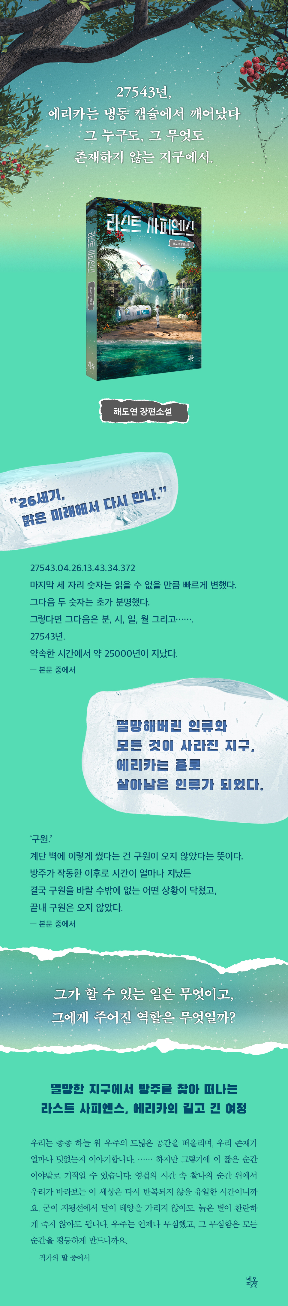 멸망한 지구에서 방주를 찾아 떠나는라스트 사피엔스, 에리카의 길고 긴 여정에리카는 냉동 캡슐에서 눈을 뜬다. 지금이 몇 년도인지, 이곳은 어디인지 도무지 알 수 없다. 지구가 분명하지만, 에리카가 살았던 지구와는 확연하게 다른 모습의 지구. 에리카는 자신이 누군지 모를 여자와 함께 찍은 사진을 발견한다. 그리고 사진 뒷면에 적힌 메시지. ‘26세기, 밝은 미래에서 다시 만나.’ 에리카는 지금이 26세기인지, 그렇다면 여자는 어디 있는 것인지 혼란을 느끼다가 시간을 표시하고 있는 듯한 장치를 발견한다. 에리카가 깨어난 지금은 바로 27543년. 사진 속 여자와 약속한 시간에서 약 25000년이 지났다.에리카의 희망은 설득력이 없었다. 그는 창틀 너머로 몸을 내밀었다. 그리고 목이 찢어질 듯한 소리로 소리를 질렀다. 상스러운 욕설에 거친 숨이 섞이며 의미 없는 단어들이 허공으로 튀어나갔다. 누구도 대답하지 않았다. 누구도 대답할 수 없었다. 누구의 대답도 바라지 않았다. 에리카 자신을 향한 절규였다. (40쪽)에리카가 할 수 있는 일은 다른 생존자를 찾는 것뿐이었다. 그리고 지난 일을 예상하는 것뿐이었다. 더 이상 살기 힘든 지구를 위해 인간들은 냉동 수면을 택했다. 26세기에 열린 방주에서 냉동 수면을 하던 인간들이 깨어날 예정이었다. 하지만 어떠한 이유로 방주는 열리지 않았다. 그렇게 약 25000년이 넘는 시간이 흘렀다. 그제야 에리카가 잠들어 있는 냉동 캡슐이 열렸다.에리카는 끊임없는 고독감과 두려움을 느끼며 살아간다. 또다른 캡슐 안에 웅크리고 죽어 있는 사람을 발견하기도 하고, 주변의 현대적인 건축물과 ‘구원’이라고 써 있는 글자를 통해 이미 방주가 열렸던 것이 아닐지 유추하기도 한다. 에리카는 이 모든 사실을 확인하는 역할이 자신에게 주어진 것만 같다고 생각한다.다르지만 같고, 같지만 다른21세기와 276세기의 지구에리카가 멸망한 지구의 숲속에서 살아가는데 익숙해졌을 무렵, 에리카는 켄티펀트를 마주한다. 조랑말을 닮은 몸에 코끼리를 닮은 얼굴을 한 켄티퍼트들의 귀에는 모두 귀걸이가 걸려있다. 에리카는 귀걸이의 의미가 무엇인지 의문을 품으며, 유일하게 귀걸이가 걸려있지 않은 어린 켄티펀트에게 ‘켄티’라는 이름을 지어주고 유대감을 형성한다.켄티와 함께 방주를 향해 가던 중, 에리카는 인간인 듯 인간이 아닌 듯한 ‘배드 피플’ 한 쌍의 서식지를 발견한다. 배드 피플의 서식지에 목줄에 묶인 채 웅크리고 있는 켄티펀트들을 보고, 에리카는 켄티펀트들의 귀걸이가 가축을 관리하기 위한 표식임을 깨닫는다. 유일하게 귀걸이가 걸려있지 않은 켄티는 배드 피플의 손에서 벗어난 켄티펀트들에게서 태어난 아이였다.에리카는 그 순간 깨달았다. 배드 피플은 놀이를 하고 있었다. 다리를 절뚝거리다가 몸 여기저기에 아문 흉터가 있는 켄티펀트들을 보니 이번이 처음이 아닌 것도 분명했다. (147쪽)에리카는 배드 피플의 위에서 그들을 군림하는 인간을 발견한다. 그 인간은 에리카와 같은 존재, 현대인이었다. 배드 피플과는 비교되지 않을 정도로 위협적인 인간에게서 에리카와 켄티는 도망쳐 나오지만, 그 과정에서 켄티는 희생된다. 에리카는 켄티와 함께 가려던 방주를 향해 홀로 나아간다.『라스트 사피엔스』는 21세기와는 너무나도 다른 276세기의 지구를 보여주고 있지만, 사실 모든 것이 다르다고 할 수는 없다. 인류가 멸망했어도, 유일하게 남은 인간은 배드 피플과 켄티펀트들의 위에 서서 군림한다. 배드 피플은 켄티펀트들을 사육하며 괴롭힌다. 21세기와 276세기 사이에는 수많은 시간이 흘렀겠지만, 인간이 존재하는 지구는 다르지만 같고, 같지만 다르다는 사실을 보여준다.한 시대의 마지막 사피엔스, 에리카방주에 도착한 에리카는 지금껏 알 수 없었던 현실을 마주한다. 냉동 캡슐에 잠들어 있던 사람들은 이미 오래전에 깨어나 살아가다가 다시 멸망했다. 기원 후 10000년, 인류의 두 번째 멸망이었다. ‘깨우는 자’로 선발되었던 스무 명의 사람들 중 살아있는 자는 단 한 명, 에리카뿐이었다. 에리카는 모든 희망과 목적을 상실했다. 자신이 할 수 있는 일을 무엇이고, 자신에게 주어진 역할은 무엇인지 에리카는 알 수 없었다.우주가 다시 한번 말했다.“살아라.”에리카는 이번에는 묻지 않았다. 그저 가만히 들었다.“살아라.” (204쪽)『라스트 사피엔스』는 인간이라는 존재가 무슨 의미를 가지는지, 우리가 살아가는 시간이 어떤 의미가 있는지 독자들에게 의문점을 남긴다. 멸망한 지구에서 살아남은 유일한 인간 에리카의 존재는 무슨 의미를 가지고 있을까? 27543년의 지구에서 에리카는 무엇을 할 수 있을까? 계속해서 흐르는 시간 속에서 우리의 삶은 무슨 의미가 있을까? 미래의 지구에서 살아남은 라스트 사피엔스, 에리카의 여정을 끝까지 지켜보기를 바란다.