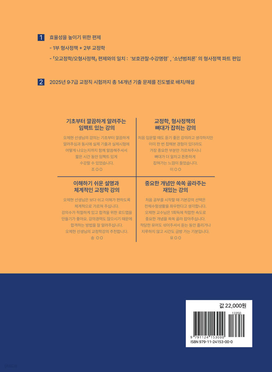 형사정책의 의의 2 범죄원인론 2 제1장 형사정책학의 연구방법과 범죄의 원인에 대한 여러 관점 2 제2장 고전학파; 억제이론 5 제3장 실증학파 9 제4장 미국의 범죄사회학파 12 제1절 사회구조이론 12 제2절 사회화(과정)이론 17 제3절 갈등이론 33 범죄실태론 35 제1장 실태조사와 범죄추세(犯罪趨勢)의 분석 35 제2장 환경인자의 범죄상관성 36 형사제재론 37 제1장 형벌론 37 제2장 보안처분론 50 제1절 보안처분의 의의 50 제2절 보호관찰 51 제3절 사회봉사명령과 수강명령 64 제4절 치료감호 등에 관한 법률상의 보안처분 68 제5절 성폭력범죄자의 성충동 약물치료에 관한 법률-치료명령 74 제6절 「전자장치 부착 등에 관한 법률」상의 보안처분; 전자감시제도 78 제7절 보안관찰법상의 보안처분 85 제8절 기타 특별법상의 보안처분 85 형사사법정책론 86 제1장 범죄예방과 범죄예측 86 제2장 범죄인유형론 88 제3장 범죄피해자론 88 제4장 형사정책의 새로운 경향 94 소년범죄론 96 제1장 개관 96 제2장 소년법 102 제1절 소년법 개관 102 제2절 소년사건의 처리 103 제3절 소년 보호사건 104 제4절 소년 형사사건 113 제3장 기타 우리나라의 소년보호 입법 116 제1절 보호소년 등의 처우에 관한 법률 116 제2절 아동?청소년의 성보호에 관한 법률 122 제3절 청소년보호법 122 제2부 교정학 교정학의 기초이론 126 제1장 교정과 교정학의 의의 126 제1절 교정의 의의 126 제2절 교정학의 의의 및 발전 126 제3절 서구교정의 역사 128 제4절 우리나라 교정의 역사 130 제5절 우리나라 교정기관의 조직과 교정공무원 135 제2장 교정처우의 기본원칙과 모델 139 제1절 범죄자 처우의 기본원칙 139 제2절 교정처우(행형처우) 모델 139 교정처우론 145 제1장 교정시설 145 제1절 교정시설의 의의 145 제2절 교정시설의 감독 148 제3절 과밀수용과 수용사고 150 제4절 교정시설의 민영화 153 제2장 수용자 구금제도와 교도소 사회론 157 제1절 수용자의 구금 157 제2절 교도소 사회론 161 제3장 시설 내 처우 164 제1절 형의 집행 및 수용자의 처우에 관한 법률 개관 164 제2절 수용자의 법적지위와 권리구제 166 제3절 수용자의 기본처우 176 제4절 수형자의 처우 248 제5절 안전과 질서 275 제6절 수용의 종료와 사망 297 제7절 미결수용제도 300 제4장 사회적 처우(개방처우) 305 제1절 개방처우의 개관 305 제2절 개방처우의 유형 307 제3절 교정참여제도: 사회내 유용자원의 동원에 의한 행형의 사회화 323 제4절 중간처우제도와 중간처벌제도 325 제5장 사회 내 처우(Community Treatment) 330 제1절 개관 330 제2절 가석방 336 제3절 갱생보호 343 제4절 지역사회교정 347 |