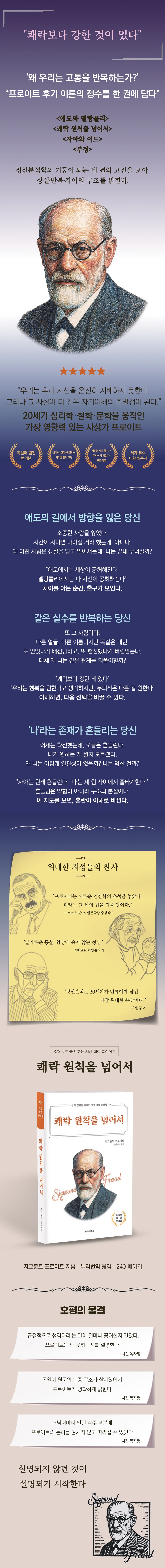 쾌락 원칙을 넘어서 제 1장 쾌락 원칙의 한계 제 2장 반복 강박의 관찰 제 3장 무의식적 반복의 의미 제 4장 생명체의 충동적 보수성 제 5장 삶의 충동과 죽음의 충동 제 6장 임상적 적용: 충동 이론의 확장 제 7장 충동 이론의 발전 자아와 이드 제 1장 의식과 무의식 제 2장 자아와 이드 제 3장 자아와 초자아 (자아이상) 제 4장 두 가지 충동유형 제 5장 자아의 의존성들 부정 |