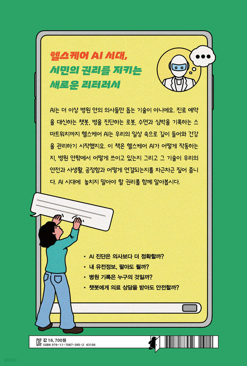 - 진단·치료·돌봄의 경계에서 열리는 의료의 미래 - 풍부한 사례로 만나는 헬스케어 AI 과거 병원에서만 가능했던 진단과 치료는 헬스케어 AI의 등장으로 일상 영역까지 확대되었다. 합리적인 규정과 규제 방안이 마련되지 않은 채 AI가 우리 삶에 보다 직접적으로 관여하기 시작한 것이다. 저자는 정답이 없는 의료 영역에서 기계 학습이 인간의 판단과 만나 발생할 수 있는 다양한 갈등 상황과 딜레마, 불확실성에 주목한다. 이러한 논점을 풀어냄에 있어 이 책은 어려운 의학 용어나 공학 개념을 나열하는 대신, 구체적이고 현실적인 사례를 제시해 독자가 AI와 건강의 관계를 쉽게 이해할 수 있도록 한다. 예컨대, AI 챗봇에게 여드름 상담을 받는 중학생 태윤, 스마트 장비로 일상생활을 지원받는 장애인 인수 등 풍부한 가상 사례를 담아 헬스케어 AI가 작동하는 실제 장면을 생생히 그려 낸다. 이 사례들은 단순한 기술 시연으로 끝나지 않고 ‘아플 때 병원에서 AI 적용 서비스를 고르는 것이 좋을지’, ‘이사를 갈 때 AI 시스템을 설치할 수 있는 집을 찾아야 할지’ 등 나의 삶과 연결되는 질문을 끌어낸다. 저자의 사려 깊은 시선을 따라 독자는 기술과 윤리, 사회가 교차하는 다소 낯선 문제를 ‘나의 이야기’로 쉽게 공감하며 찬찬히 고민해 볼 수 있다. 이렇듯 작은 질문에서 시작한 논의는 AI의 판단을 얼마나 신뢰할 수 있을지, 오류는 누가 책임져야 할지, 나아가 공정성을 어떻게 확보할 수 있을지 등 철학과 윤리를 넘나드는 다양한 주제로 이어진다. 책 곳곳에는 논점을 뒷받침하는 실험과 기술사적 맥락이 유기적으로 엮여 있어 청소년과 시민이 함께 읽고 토론하거나 논술 수업에 활용하기 좋다. 의료를 넘어, 기술 시대를 살아가는 우리에게 - 의공학 계열 진로 희망자를 위한 AI 시대 기술 윤리 - 내 건강을 지키기 위한 비판적 사고력 AI는 효율적이지만, 의료는 효율만으로 설명되지 않는다. 《AI에게 건강을 맡겨도 될까요?》는 AI가 만들어 낸 ‘확률 기반 의료’의 위험과 가능성을 함께 보여 준다. AI는 방대한 데이터를 학습해 진단을 내리지만, 그 확률의 의미는 의료진의 임상적 판단과는 다르다. AI가 병원 안에서뿐 아니라 일상과 개인의 스마트기기 속으로 확장될수록, 그 기술이 공정하고 안전하게 작동하기 위한 사회적 합의가 필요한 이유다. AI와 함께 살아가야 하는 세대에게 기술을 비판적으로 이해하고 스스로 판단할 힘을 기르는 것은 매우 중요하다. 《AI에게 건강을 맡겨도 될까요?》는 AI와 의료가 만나는 최전선에서 ‘기술과 인간의 공존’을 고민하는 청소년 교양서다. 저자는 “AI를 활용할 권리는 전문가에게만 있는 것이 아니다”라며, 모두가 헬스케어 AI의 작동 원리와 윤리적 기준을 이해해야 한다고 강조한다. 이 책이 제안하는 ‘AI 리터러시’는 단순한 기술 이해를 넘어, 건강한 판단과 책임 있는 선택을 위한 시민 교양이다. 의학·공학 계열 진로를 희망하는 청소년은 물론, AI와 의료의 관계를 이해하고자 하는 독자들에게 필수적인 출발점이 되어 줄 것이다. |