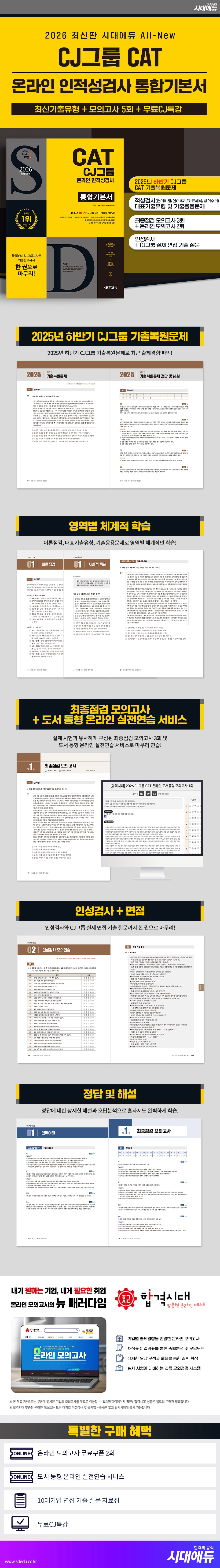 CJ그룹은 우수한 인재를 확보하고자 온라인 인적성검사를 통해 신입사원을 모집하고 있다. 이에 시대에듀에서는 수험생들이 CJ그룹 CAT 온라인 인적성검사에 대한 철저한 준비가 가능하도록 다음과 같은 특징을 가진 도서를 출간하였다.