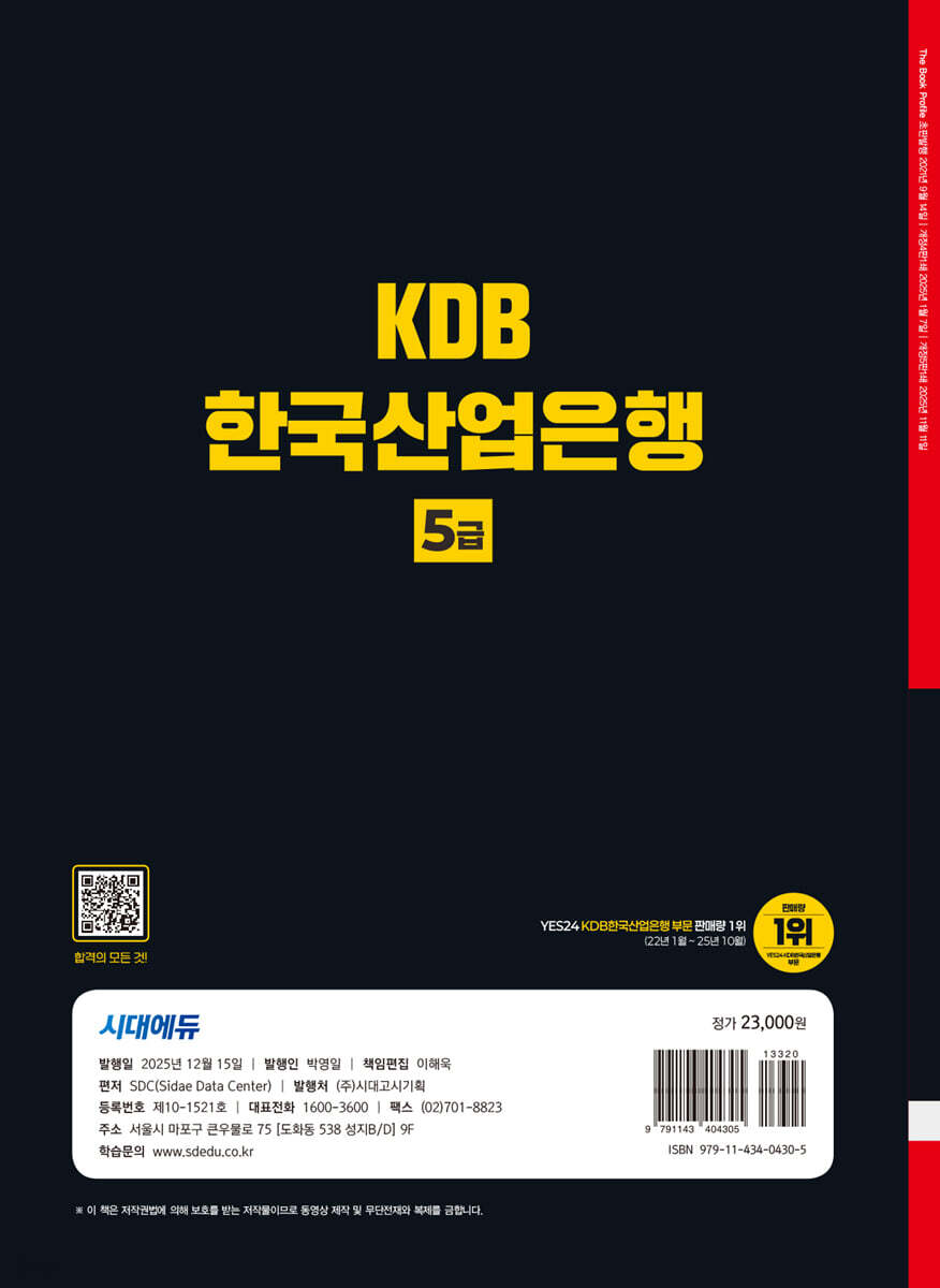 최근 출제경향을 분석하여 구성한 모의고사를 4회분 수록하여 시험 직전 자신의 실력을 최종 점검할 수 있도록 하였다. 논술 작성법과 KDB한국산업은행 논술 기출 및 면접 가이드와 주요 금융권 면접 기출을 수록하여 한 권으로 채용 전반에 대비할 수 있도록 하였다. 또한 KDB한국산업은행 온라인 모의고사 2회분과 NCS 통합 온라인 모의고사 1회분을 제공하여 마지막까지 완벽하게 준비할 수 있도록 하였다. 본서가 KDB한국산업은행 5급 신입행원 채용 필기시험을 준비하는 여러분 모두에게 합격의 기쁨을 전달하기를 진심으로 기원한다. |