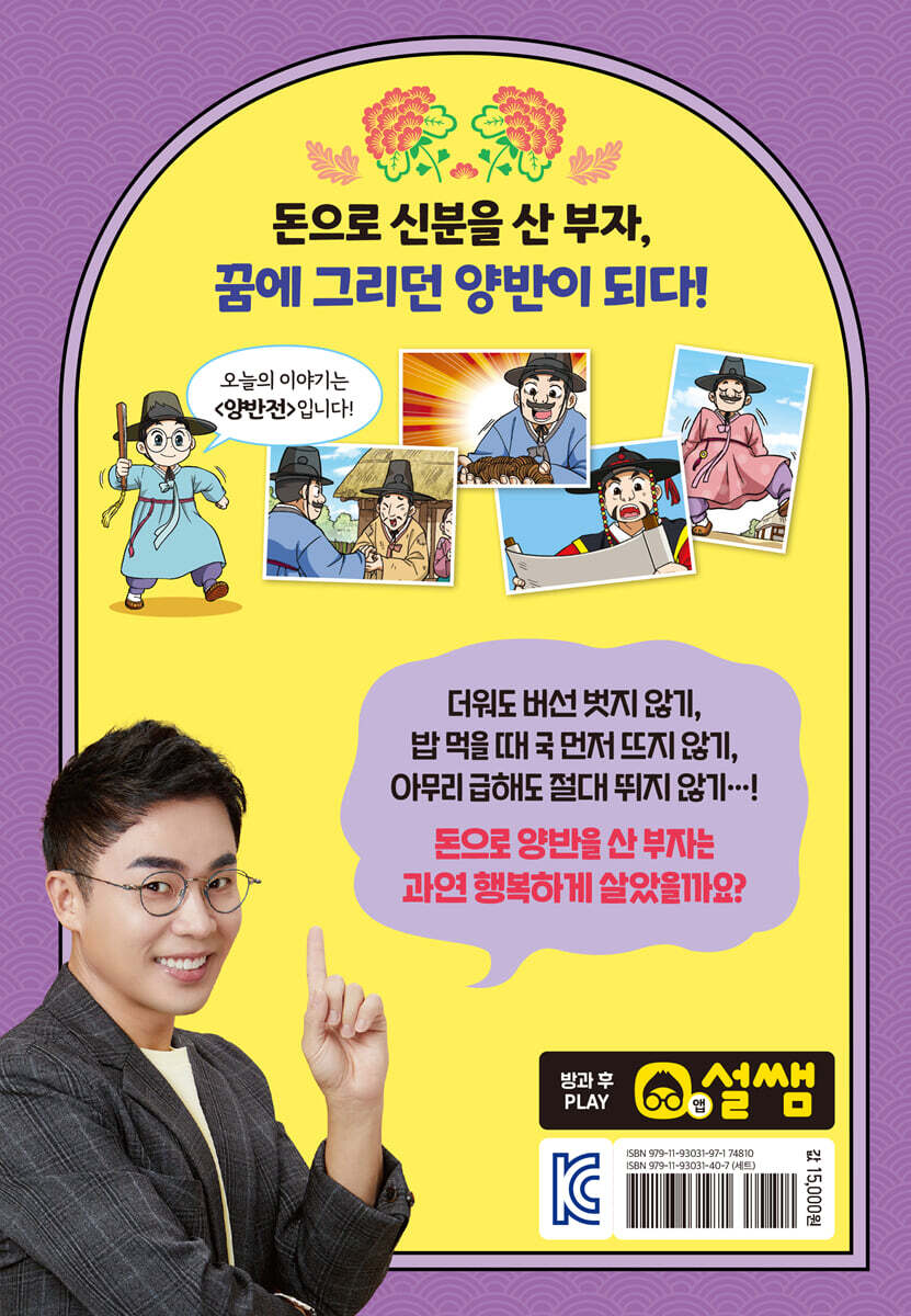 꿈에 그리던 양반이 되다! 남사당패의 공연으로 흥겨운 마을, 탈놀음을 보던 설쌤은 양반을 풍자하는 이야기인 〈양반전〉을 낭독하기로 합니다. 이야기 속 가난한 양반은 나라의 쌀을 천 석이나 빌려 먹고 갚지 못해 감옥에 갈 처지가 됩니다. 이때, 돈은 많지만 신분 때문에 무시당하던 부자가 나타나 양반의 빚을 대신 갚아 주고 신분을 사기로 합니다. 이 소식을 들은 군수가 양반 증서를 써 주는데...! 과연 큰돈을 주고 양반이 되려 했던 부자는 진정으로 행복해질 수 있었을까요? |
