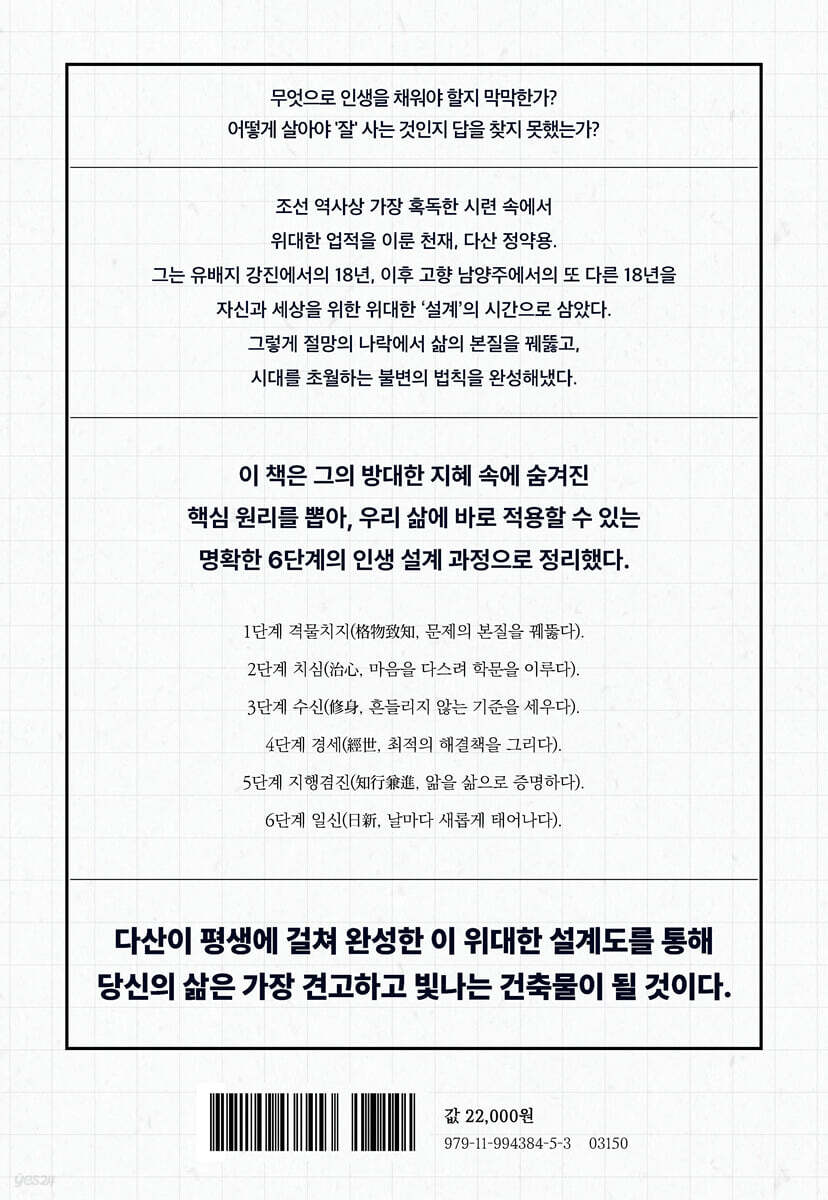 우리는 모두 '잘' 살기를 열망한다. 하지만 무엇으로 인생을 채워야 할지, 어떻게 살아야 '잘' 사는 것인지 명확한 답을 찾지 못한 채 막막함 속을 헤맨다. 견고한 설계도 없이 지어진 건축물이 위태롭듯, 삶의 명확한 지침이나 체계가 없는 인생은 작은 시련에도 쉽게 흔들리고 방향을 잃는다. 매일 노력하지만 삶이 나아지지 않는 것 같고, 공허한 위로는 더 이상 힘이 되지 않을 때, 우리에게 필요한 것은 감상적인 위안이 아니라 현실을 딛고 설 수 있는 구체적이고 견고한 '방법론'이다. 조선 최고의 현실주의자, 절망을 '설계'의 시간으로 바꾼 천재 여기, 조선 역사상 가장 혹독한 시련을 겪으면서도 가장 위대한 업적을 이룬 천재, 다산 정약용이 있다. 그는 18년간의 끔찍한 유배 생활과 그 이후의 삶을 절망과 한탄으로 보내지 않았다. 오히려 그는 그 절망의 나락에서 삶의 본질을 꿰뚫어 보았고, 자신과 세상을 위한 위대한 '설계'의 시간으로 삼았다. 그는 관념 속의 학자가 아닌, 현실의 문제를 해결하고자 했던 철저한 '현실주의자'이자 '설계자'였다. 그는 삶의 모든 요소를 면밀히 분석하고, 시대를 초월하는 불변의 법칙을 완성해냈다. 이 책은 바로 그가 평생에 걸쳐 완성한, 가장 현실적이고도 치밀한 인생의 '설계도'이다. 삶의 선순환을 이끄는 6단계 인생 설계 과정 『다산의 설계도』는 다산이 평생에 걸쳐 완성한 방대하고도 치밀한 지혜의 핵심 원리를 뽑아, 누구나 자신의 삶에 즉시 적용할 수 있도록 명확한 6단계의 인생 설계 과정으로 체계화한 책이다. 이 6단계는 개별적으로 존재하는 것이 아니라, 삶의 선순환을 이끄는 6개의 톱니바퀴(6륜)처럼 유기적으로 연결된다. 1단계 격물치지에서는 사물과 문제의 본질을 꿰뚫어보는 눈을 뜨고, 2단계 치심을 통해서는 배움의 토대가 되는 마음을 다스린다. 3단계 수신으로는 흔들리지 않는 내면의 견고한 기준을 세우고, 4단계 경세를 통해 현실에 적용할 최적의 해결책을 그린다. 5단계 지행겸진으로는 앎을 삶으로 증명하며 강력한 실천의 동력을 얻고, 마지막 6단계 일신으로 날마다 새롭게 태어나며 이 모든 과정을 지속 가능한 선순환의 고리로 완성한다. 이 책은 더 이상 막막함 속에서 헤매고 싶지 않은 이들에게, 삶의 주도권을 되찾고 자신만의 빛나는 건축물을 세우고 싶은 모든 독자에게 다산이 남긴 가장 위대하고도 실용적인 지도가 되어줄 것이다. |