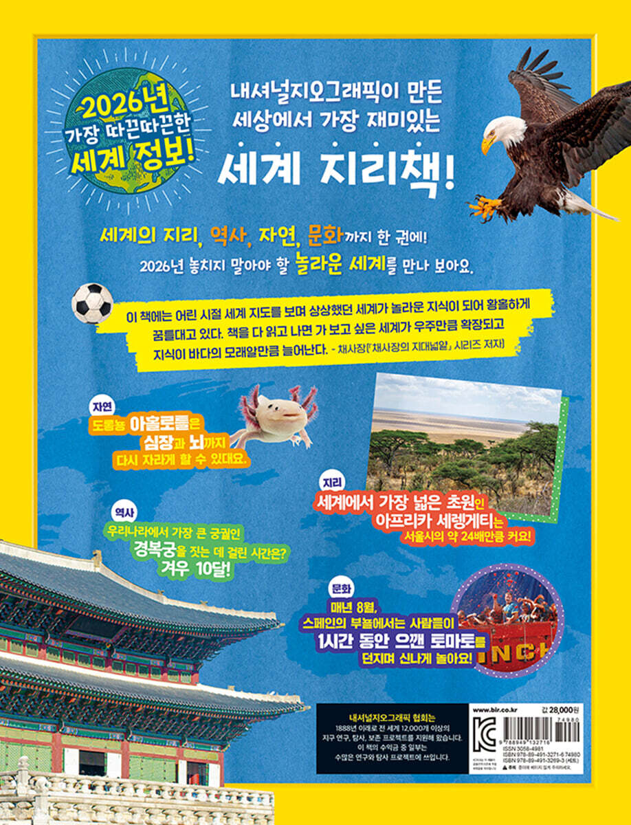 2026년판에는 이 해에만 만날 수 있는 세계 정보가 알차게 수록되어 있다. 인공 지능 서비스 챗GPT가 그린 지브리 스타일 그림을 비롯해 올해 전 세계를 뜨겁게 달군 뉴스, ‘매운 음식의 날’, ‘비닐봉지 없는 날’ 등 꼭 기억해야 할 2026년의 기념일, 그리고 숫자 26과 관련된 흥미로운 사실까지 2026년에 새롭게 주목받을 세계 소식을 누구보다 먼저 만나 보자. ■ 대륙별 지도로 살펴보는 세계의 지리, 자연, 문화, 역사! 초등 교과 연계하여 학교 공부가 쉬워지는 지식이 가득 이 책은 아시아부터 남극까지 7개 대륙을 기준으로 장을 구성하고, 각 장의 첫머리에 대륙 지도를 실어 주요 국가의 위치를 한눈에 익힐 수 있도록 했다. 이어서 대륙을 대표하는 동식물, 지형, 문화유산, 건축물, 축제 등을 소개한다. 고대 이집트의 왕과 왕비의 무덤인 피라미드, 무분별한 개발로 빠르게 훼손되고 있는 세계 최대 열대 우림 아마존, 지구 전체 물 중 우리가 마실 수 있는 물이 고작 2.5퍼센트도 안 된다는 사실 등 다양한 세계 지식이 초등 ■ 세계 속에서 만나는 우리나라 2026년판에는 우리나라의 역사·문화·자연·기술 분야를 더욱 폭넓게 조명했다. 두 번이나 허물어졌다가 다시 세워진 경복궁의 역사, 신라 시대의 정교한 과학 기술이 담긴 석굴암, 전쟁의 상처 속에서 우리나라 최대 야생 동물 서식지가 된 비무장 지대, 김치와 김장 문화를 체험할 수 있는 뮤지엄 김치간, 우리나라 달 탐사선 발사 기술의 발전 등을 소개한다. 어린이 독자들은 우리나라의 역사와 문화, 자연과 기술을 함께 살펴보며 대한민국의 과거와 현재, 그리고 앞으로의 모습을 이해할 수 있다. 더불어 우리나라가 어떤 길을 걸어왔고, 세계 속에서 어떤 가치를 지니고 있는지 생각해 볼 수 있다. ■ 내셔널지오그래픽 독점 고화질 사진 500컷 이상! 나와 어울리는 여행지를 찾아보는 퀴즈까지 이 책에는 내셔널지오그래픽 탐험가들이 촬영한 세계 최고 수준의 사진이 500컷 이상 실려 있다. 눈앞에서 살아 움직이는 듯한 동물, 지구의 역사를 품은 다양한 지형, 웅장한 고대 건축물과 세계 곳곳 축제의 장면 등 큼직하고 생생한 사진은 글 읽기가 부담스러운 아이도 사진을 중심으로 자연스레 끝까지 책을 펼치게 한다. 또한 각 장 말미에 ‘내 성격을 알아보는 QUIZ’를 수록하여 책 읽는 재미를 더했다. 좋아하는 음식, 계절, 색깔, 이야기 유형, 쉬는 날 하는 일 등을 선택하다 보면 나에게 꼭 맞는 세계 여행지를 추천받을 수 있다. *초등 교과 연계* 사회 3-1 일상에서 만나는 과거 3-2 사회 변화와 다양한 문화, 옛날과 오늘날의 생활 모습 4-1 우리 지역의 국가유산 4-2 다양한 환경과 삶의 모습 5-2 사회의 새로운 변화와 오늘날의 우리 6-2 세계 여러 나라의 자연과 문화 과학 3-1 동물의 생활, 식물의 생활, 생물의 한살이 3-2 지구와 바다 4-1 물의 상태 변화, 땅의 변화, 다양한 생물과 우리 생활 5-1 지층과 화석 6-1 지구의 운동 6-2 계절의 변화 |