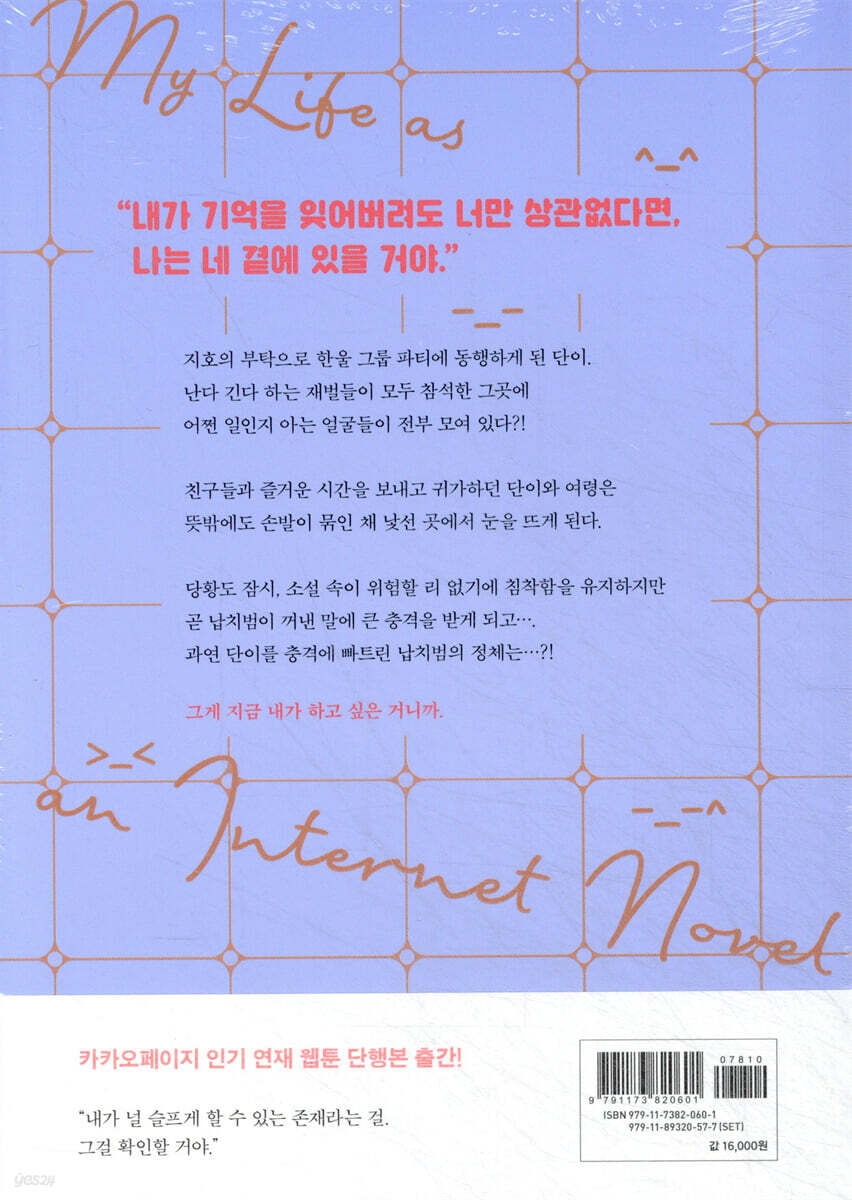 나는 네 곁에 있을 거야.” 사대천왕에 미녀 여주까지… 감당불가 인터넷 소설 세계에 빠져 버렸다! 카카오페이지 누적 1억 뷰! 탄탄한 스토리와 수려한 작화로 수많은 독자를 사로잡은 웹툰 「인소의 법칙」 소장본 8권이 출간되었다. 인터넷 소설 읽기가 취미였던 평범한 학생 함단이. 어느 날 자고 일어나니 옆집에는 엄청나게 예쁜 여학생이 살고, 학교에는 이름도 무시무시한 사대천왕이 떡하니 버티고 있다. 엄마도 우리 엄마, 집도 우리 집이 맞건만 이곳은 전혀 다른 소설 속 세상. 재벌가 외동아들 은지호, 냉미남 유천영, 모범생의 탈을 쓴 흑막(?) 권은형, 저세상 귀여움을 장착한 천재 우주인…. 학교에는 설정과다 사대천왕이 있고, 옆집에는 오직 나만 바라보는 순정파 초특급 미녀 반여령이 산다! 사대천왕이 존재하는 인터넷 소설 속에서 ‘미녀 여주의 절친1’로 살아가기가 얼마나 험난한지, 그간 섭렵한 무수한 인소를 통해 학습해 온 함단이는 반여령과 사대천왕을 멀리하기 위해 애쓰지만, 어째 점점 더 인소의 수렁으로 빠져드는 듯한 느낌은 무엇…?! |