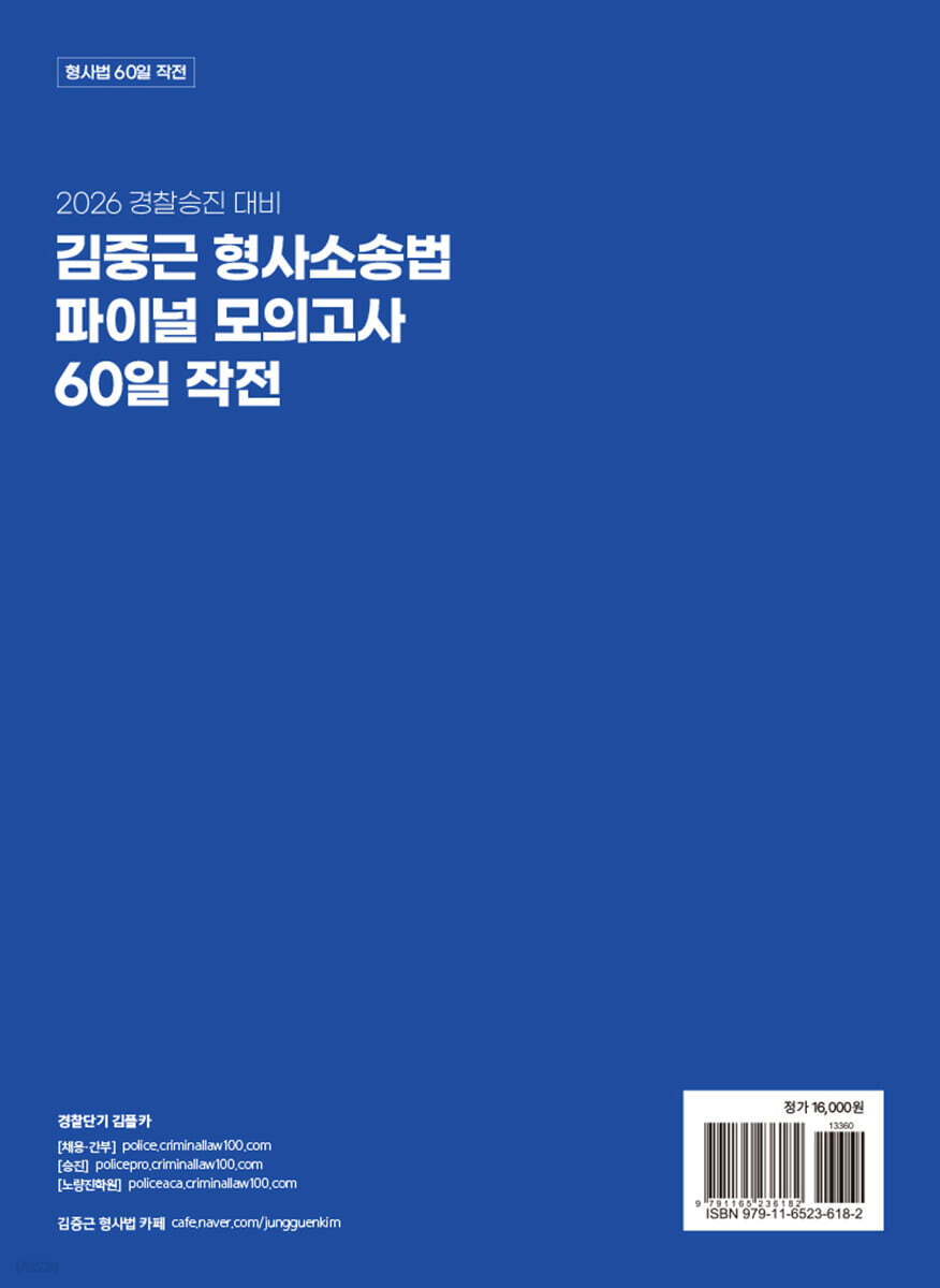 100% 적중 목표로 더 얇고, 더 강력해졌습니다. 합격을 위한 마지막 관문, 60일 파이널 도서와 함께하세요! 1. 100% 적중에 도전, 출제 0순위 문제로 구성 이미 높은 적중률로 입소문 난 경폴카 60일 파이널 모의고사! 이번에도 그 명성을 이어가고자, 출제 0순위 문제만을 엄선하여 구성하였습니다. 2. 시험 직전 제작, 최신 경향 100% 반영 매 시험 직전마다 새롭게 제작되어 출간되는 도서입니다. 최신 기출은 물론 출제 경향을 반영하는 부분에 있어서 그 어떤 도서도 60일 작전을 따라올 수 없습니다. 파이널 모의고사 60일 파이널 모의고사로 2026년 시험을 가장 완벽하게 대비하세요. 3. 단 시간 多회독 가능 과목별 특성에 맞게 진도별 문제풀이, 반범위 문제풀이, 모의고사 등 다양한 형태로 구성하였습니다. 전범위를 회독하면서 개개인의 취약점 위주로 학습을 진행, 짧은 시간에 회독수를 극대화할 수 있습니다. |