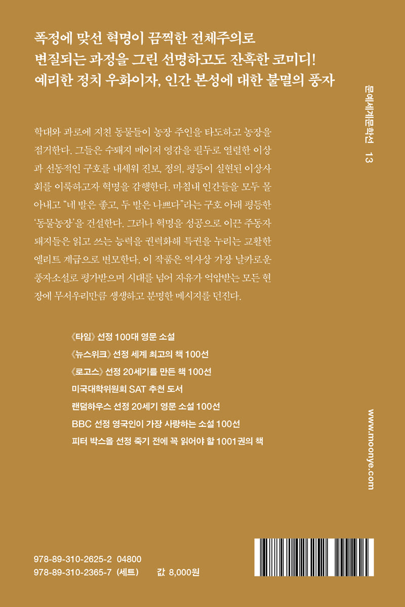 20세기 정치 풍자의 대표적 고전 《동물농장》, 권력과 혁명의 영원한 우화를 다시 읽는다 “모든 동물은 평등하다. 그러나 어떤 동물은 더 평등하다.” 역사상 가장 날카로운 풍자 소설의 무대를 마련하다 학대와 과로에 지친 동물들이 농장 주인을 타도하고 농장을 점거한다. 그들은 수퇘지 메이저 영감을 필두로 열렬한 이상과 선동적인 구호를 내세워 진보, 정의, 평등이 실현된 이상사회를 이룩하고자 혁명을 감행한다. 마침내 인간들을 모두 몰아내고 “네 발은 좋고, 두 발은 나쁘다”라는 구호 아래 평등한 ‘동물농장’이 건설된다. 그러나 혁명을 성공으로 이끈 주동자 돼지들은 읽고 쓰는 능력을 권력화해 특권을 누리는 교활한 엘리트 계급으로 변모한다. 그들은 인간의 악습을 되풀이하며 무자비한 통제와 공포정치, 혁명 이전보다 더 심한 착취를 일삼지만 다른 동물들은 그저 노예처럼 복종하며 절망과 고통스러운 삶을 인내할 뿐이다. 러시아 혁명과 스탈린 시대, 독재 권력이 타락하는 과정에 대한 신랄한 풍자와 예리한 통찰 1945년에 출간된 《동물농장》은 조지 오웰이 파시즘에 맞서기 위해 참여한 스페인 내전에서 좌익 정당 내부 권력투쟁을 목격하고 환멸을 느꼈던 경험을 그의 말년, 작은 시골 마을에서 농장을 경영하며 얻은 아이디어에 접목해 구성한 소설이다. 스페인에서 돌아온 뒤 나는 거의 모든 사람이 쉽게 이해할 수 있고 다른 나라 말로 번역하기도 쉬운 이야기를 써서 소련의 거짓을 폭로할 생각을 했다. 그러나 이 이야기를 실제로 어떻게 쓸 것인지 상세한 아이디어가 한동안 떠오르지 않다가 어느 날 아마 열 살쯤 된 것 같은 사내아이가 좁은 길에서 커다란 말이 끄는 짐마차를 몰면서 말이 방향을 바꾸려고 할 때마다 채찍을 휘두르는 것을 보았다. 그때 문득 만약 저런 동물들이 제게 힘이 있음을 깨닫는다면 우리는 녀석들에게 아무런 힘을 행사할 수 없을 것이라는 생각, 인간이 동물을 착취하는 방식과 부자가 프롤레타리아를 착취하는 방식이 아주 흡사하다는 생각이 들었다. (29쪽, 〈우크라이나어판 서문〉 중에서) 《동물농장》은 1917년 러시아 혁명부터 1943년 테헤란 회담에 이르기까지 실제로 일어난 역사적 사건들과 정치 문제를 다루고 있다. 출간 당시에도 이 작품은 소련의 스탈린 독재 체제를 겨냥해 강하게 비판한 작품으로 해석되었고 소설 속 등장인물과 사건이 실제로 누구를 가리키는지 쉽게 알아차릴 수 있었다. 예컨대 동물농장의 정신적 지주이자 예언자인 ‘메이저 영감’은 마르크스, 현실주의 독재자 ‘나폴레옹’은 스탈린이다. 스탈린에게 축출당한 트로츠키는 이 소설에서 이상주의자 ‘스노볼’로 등장한다. 메이저 영감이 예언한 봉기는 1917년 러시아 혁명이고, 이 혁명으로 멸망한 차르 정권의 니콜라스 2세는 ‘매너 농장’의 게으른 주인 ‘존스’이며, 근면하고 체제에 순종적인 ‘복서’는 프롤레타리아를 대표한다. 자본가는 ‘인간’으로, 노동자는 ‘동물’로 상징되며 ‘동물존중주의’는 곧 마르크스의 공산당 선언이다. 동물농장의 ‘풍차 건설 계획’은 수차례 실패를 반복한 경제 계획을 가리킨다. 봉기 이후 동물농장에서 벌어지는 일련의 사건들은 혁명 이후, 혁명의 이념과 명분이 사라져가고 새로운 지배계급이 자본주의 체제에 동화되어가던 소비에트의 타락 과정을 그대로 재현한다. 이처럼 소련과 사회주의 비판에 민감한 분위기 속에서 당시의 정치적 현실을 날카롭게 풍자한 이 작품은 대부분의 출판사에서 출간을 꺼려 어려움을 겪기도 했다. ‘정치적 작가’ 조지 오웰의 문제작 《동물농장》, 오웰이 그려낸 불협화음의 울림은 여전하다 암울한 시대를 밝히는 양심적 언론인이자 ‘정치적 작가’로 20세기 영문학사에서 독보적인 지위를 갖는 조지 오웰은 영국의 식민 지배를 받던 인도에서 총독부 관리의 아들로 태어나 영국 명문 이튼칼리지에서 교육받은 엘리트였다. 그러나 대학 진학을 포기하고 인도 제국 경찰로 복무하며 제국주의 식민 통치를 경험하고, 파리와 런던의 빈민가에서 극빈자의 삶을 자처하며 사회적 약자들에 공감했다. 프랑코 파시즘에 맞서 싸우기 위해 스페인 내전에 참전하기도 했다. 이러한 경험들은 그가 작가로 살기로 결심하면서 문학의 사회 비판적 책임을 강하게 의식하고 정치적 글쓰기를 지향하는 데 큰 영향을 미친다. 오웰은 에세이 〈나는 왜 글을 쓰는가〉에서 “《동물농장》은 내가 정치적 목적과 예술적 목적을 하나로 융합하려고 온전히 의식적으로 노력한 첫 번째 작품이다”라고 말한 바 있다. 《동물농장》은 그만큼 오웰이 작가로서 추구한 이상과 신념이 오롯이 담겨 있는 작품이라 할 수 있다. 최고의 정치 풍자소설로 손꼽히는 이 선명하고 잔혹한 코미디를 통해 오웰이 궁극적으로 이야기하고자 한 바는 무엇이었을까. 그가 주목한 것은 단순히 사회주의 혁명의 실패가 아니었다. 그는 폭정에 맞선 혁명이 폭정만큼이나 끔찍한 전체주의로 변질해가는 과정을 기록하며 권력만을 추구하는 혁명은 그 권력의 주체만 바뀔 뿐 필연적으로 부패와 타락의 길을 걷게 되고 결국