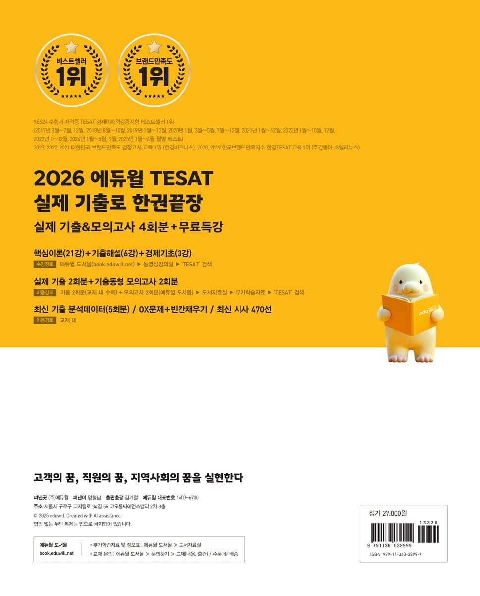 - TESAT 실제 기출문제 2회분+모의고사 2회분(PDF) - 기출해설 특강 6강+경제기초 3강+핵심이론 21강 - 고득점을 위한 금융/경영/시사상식 470선 - [특별부록] OX문제+빈칸 채우기 이 책의 구성 [핵심이론] 상세하고 친절한 이론과 내용 정리로 경제 초보도 빠르게 이해 가능! - 핵심용어 설명과 친절한 ‘읽는 강의’로 경제 초보도 쉽고 빠르게 TESAT 고등급 마스터 - ‘기출로 확인하기’ & ‘매스컴 시사 이슈‘를 통해 핵심이론의 실전 적용 바로 체크! - 최근 5회분 기출 분석 토대로 각 이론별 출제빈도 및 중요도 제공하여 최신 출제경향 확인 및 효율적 학습 가능! [기출동형 연습문제] 실제 기출과 동일한 유형으로 탄탄한 실전 마스터! - 문항별 난이도 표시로 현재 실력 확인 가능 - 상세한 이론 설명으로 이론 점검과 문제 분석이 가능한 오답피하기 - S등급 고난도 문제로 심화 학습까지 가능 [금융/경영/시사상식] 최신 기출 바탕으로 정리한 470선의 상식 용어 - 최신 시사 470선을 담아 시사경제 영역 완벽 대비 가능! - 3회독 체크로 가능한 확실한 복습! [실제 기출 2회분] 최신 출제 경향 파악! 실제 기출로 실전 감각 UP! - 시장유일 단독수록! 기출문제로 차별화된 실전 다지기 가능! - 친절한 기출해설 특강과 상세한 해설로 완벽 마무리! |