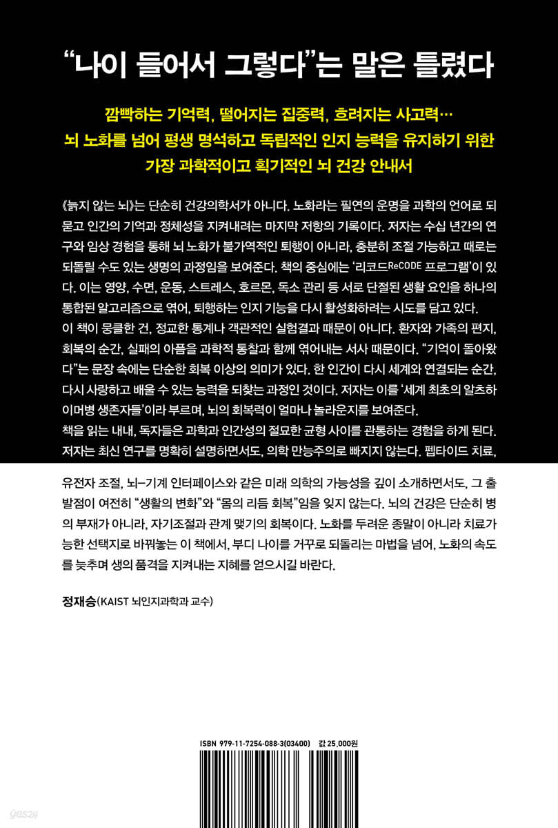 《늙지 않는 뇌》는 단순히 건강의학서가 아니다. 노화라는 필연의 운명을 과학의 언어로 되묻고 인간의 기억과 정체성을 지켜내려는 마지막 저항의 기록이다. 저자는 수십 년간의 연구와 임상 경험을 통해 뇌 노화가 불가역적인 퇴행이 아니라, 충분히 조절가능하고 때로는 되돌릴 수도 있는 생명의 과정임을 보여준다. 책의 중심에는 ‘리코드(ReCODE) 프로그램’이 있다. 이는 영양, 수면, 운동, 스트레스, 호르몬, 독소 관리 등 서로 단절된 생활 요인을 하나의 통합된 알고리즘으로 엮어, 퇴행하는 인지 기능을 다시 활성화하려는 시도를 담고 있다.