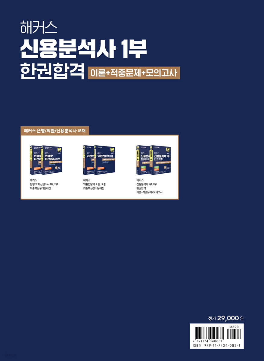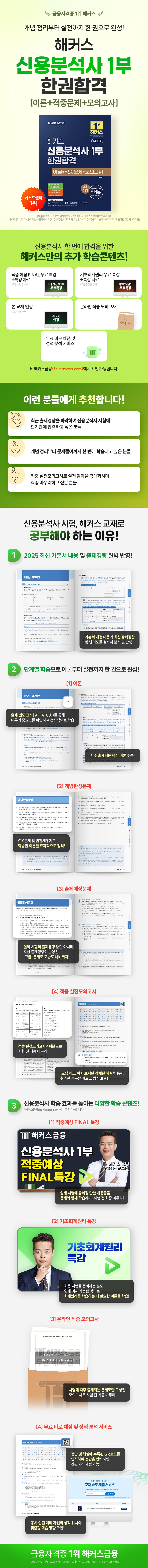 주간동아 선정 2022 올해의 교육 브랜드 파워 온·오프라인 금융자격증 부문 1위 개념 정리부터 실전까지 신용분석사 대비, 한 권으로 완성! [이런 분들에게 추천합니다] 1. 최근 출제경향을 파악하여 신용분석사 시험에 단기간에 합격하고 싶은 분들 2. 개념 정리부터 문제풀이까지 한 번에 학습하고 싶은 분들 3. 적중 실전모의고사로 실전 감각을 극대화하며 최종 마무리하고 싶은 분들 [해커스 교재만의 특장점] 1. 2025 최신 기본서 내용 및 출제경향을 철저하게 분석 반영! 기본서 개정 내용과 최신 출제경향 및 난이도를 철저히 분석하여 모든 문제에 반영했습니다. 2. 단계별 학습으로 이론부터 실전까지 한 권으로 완성! 1) 이론 - 자주 출제되는 핵심이론을 수록하여 기본서 없이도 중요 개념 학습이 가능합니다. - 최근 출제경향을 철저히 분석하여 출제 빈도(★~★★★)를 표시하였으며, 이를 통해 이론의 중요도를 확인하고 전략적으로 학습할 수 있습니다. 2) 개념완성문제 - OX 문제 및 빈칸 채우기 문제로 구성된 '개념완성문제'를 통해 앞서 학습한 이론을 효과적으로 정리하고, 취약한 개념을 빠르게 보완할 수 있습니다. 3) 출제예상문제 - '출제예상문제'를 통해 실제 시험의 출제유형을 확실하게 파악할 수 있으며, 최신 출제경향이 반영된 '고급' 문제를 통해 고난도 문제까지 대비할 수 있습니다. 4) 적중 실전모의고사 - 교재에 수록된 OMR답안지를 이용해 실제 시험과 동일한 구성의 '적중 실전모의고사' 4회분을 풀어보며, 시험 전 철저하게 최종 마무리를 할 수 있습니다. - 정답과 오답에 대한 상세한 해설로 취약한 부분을 빠르고 쉽게 보완할 수 있습니다. 3. 신용분석사 학습 효과를 높이는 다양한 학습 콘텐츠! 1) 적중예상 FINAL 특강 - 최근 출제경향을 반영한 '적중예상 FINAL 특강'으로 실제 시험에 출제될 만한 내용들을 문제와 함께 학습하고, 시험 전 최종 마무리로 학습한 내용들을 정리해볼 수 있습니다. 2) 기초회계원리 특강 - 처음 시험을 준비하는 분들도 쉽게 이해 가능한 '기초회계원리 특강'을 통해, 회계원리를 학습하는 데에 필요한 이론들을 학습하고, 신용분석사 1부 시험을 효과적으로 준비할 수 있습니다. 3) 온라인 적중 모의고사 - 시험에 자주 출제되는 문제로만 구성된 '온라인 적중 모의고사'를 통해, 신용분석사 1부 시험 전 추가로 실전 대비와 최종 마무리를 할 수 있습니다. 4) 무료 바로 채점 및 성적 분석 서비스 - 정답 및 해설에 수록된 QR코드를 인식하여 정답을 입력하면 간편하게 채점할 수 있는 것은 물론, 응시 인원 대비 자신의 성적 위치와 맞춤형 학습방향을 확인할 수 있습니다. [신용분석사 합격을 위한 해커스만의 추가 학습 콘텐츠 - 해커스금융(fn.Hackers.com)] 1. 무료 특강 - 적중예상 FINAL 특강+특강 자료(교재 내 7일 수강권 수록) - 기초회계원리 특강+특강 자료(교재 내 7일 수강권 수록) 2. 본 교재 인강(교재 내 할인쿠폰 수록) 3. 온라인 적중 모의고사 4. 무료 바로 채점 및 성적 분석 서비스 |