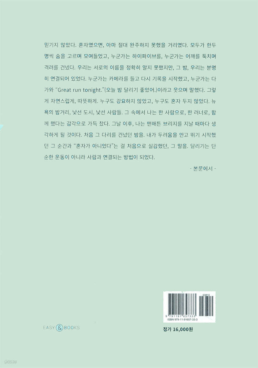 “허드슨 강에서 다시 뛰기 시작한 시계” Start Line - 낯선 도시의 출발선 “뉴욕에 도착했을 뿐인데, 나의 인생은 오히려 멈춘 것 같았다.” 01. 뉴욕에서의 시작, 낯선 언어 속에서 언어 장벽, 고립감과 주눅 듦 02. 여전히 움직이지 못한 날들 상실감과 외로움 속에서 멈춰 선 나날들 03. 83개 박스 너머의 뉴욕 집과 공간의 낯섦, 문화 충돌, 새 보금자리를 정리하며 찾은 안정감 04. 밤의 러닝화, 아침의 스타트라인 상처와 회복, 그리고 다시 시작된 달리기 Pace & Crew - 내 리듬, 우리의 발걸음 “달리는 발걸음 속에서, 나를 찾고 세상과 연결되다.” 05. 우리 동네, West Village에서의 아침 혼자 달리며 내 리듬을 찾기 시작하다 06. PS41 Run Club, 건강한 삶을 가르치고 배우는 학교 달리기를 통해 함께 자라나는 아이와 어른 07. 나의 첫 달리기 친구들, Bridge Runners 도시의 밤을 달리며 공동체를 만나다 08. 여성 러너들의 연대와 자매애, Girls Run NYC 함께 달리는 여성들, 서로의 이름을 불러주던 밤 09. 브루클린의 수요일 밤, 달리며 이어진 마음들 함께 달리며 일상과 마음이 연결되다 10. 서로의 삶을 지키는 달리기 공동체가 서로를 지탱하는 방식 11. 뉴욕, 달리기의 축제 '기록은 잊어도, 환호는 남는다.' 도시와 러너가 함께 호흡하는 축제의 시간 12. Bridge The Gap, 도시와 사람 사이를 달리는 일 언어·국적을 넘어 확장되는 연결 Long Run - 삶을 품고 달리다 “달리기를 통해 도시와 삶을 사랑하게 되었다.” 13. 사계절을 달리고, 살고, 커피 한 잔 도시 속 사계절과 카페, 일상의 확장 14. Run, Family, Run! 우리 가족, 센트럴파크를 달리다. 가족과 함께 달리며 쌓은 유대 15. 한 발, 한 마디. 관계를 향해 달리다. 관계 맺기, 언어와 연결 16. 가능성의 트랙 위에서 나의 새로운 가능성 탐색 Finish Line - 다정한 이별 “사랑한다는 말을 준비하며, 천천히 안녕을 연습했다.” 조금씩, 다정하게, 이별을 준비하며 정든 일상과 공동체와의 작별 18. 뉴욕을 떠나는 날 마지막 풍경과 공항, 결승선 같은 순간 Epilogue - Cool Down “다시 한국 땅에서, 뉴욕의 긴 레이스를 돌아보다.” |