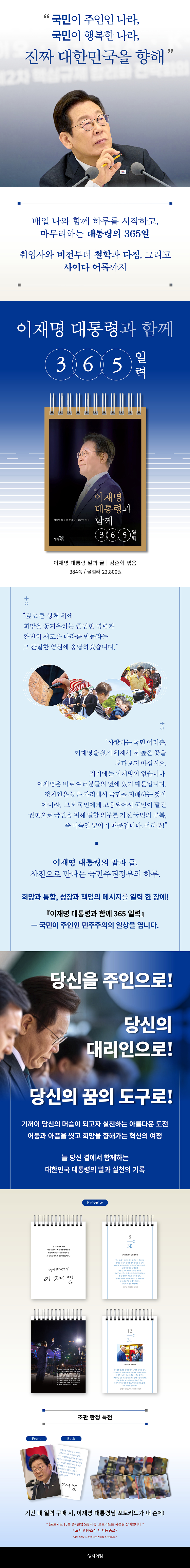하루 한 장, 이재명 대통령의 말과 글, 사진으로 만나는 국민주권정부의 약속과 실천. 『이재명 대통령과 함께 365 일력』은 이재명 대통령의 말과 글, 그리고 공식 사진을 담은 국민주권정부의 철학과 다짐, 생생한 실천 모습과 이야기를 담고 있는 일력이다. “깊고 큰 상처 위에 희망을 꽃피우라는 준엄한 명령과 완전히 새로운 나라를 만들라는 그 간절한 염원에 응답하겠습니다.” 취임 첫날의 이 선언처럼, 이 일력에는 희망과 통합, 성장과 책임에 대한 대통령의 메시지가 담겨 있다. 이재명 대통령만의 리더십과 인간미, 통찰력, 비전, 고뇌, 도전 의지가 살아 있다. 이 대통령은 또한 이렇게 말했다. “한없이 무거운 책임감과 한없이 뜨거운 감사함으로 이 자리에 섰습니다. 5,200만 국민이 보내주신 5,200만 가지 열망과 소망을 품고, 오늘부터 대한민국의 21대 대통령으로서 첫발을 내딛습니다.” 이 책은 바로 그 한 걸음, 한 걸음의 기록을 국민이 함께하는 365일의 여정으로 옮겨 엮은 것이다.