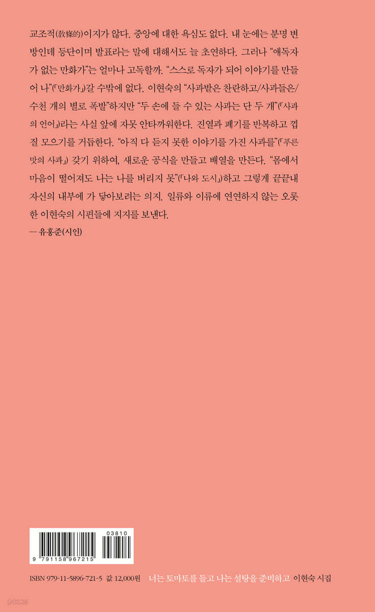 교조적(敎條的)이지가 않다. 중앙에 대한 욕심도 없다. 내 눈에는 분명 변방인데 등단이며 발표라는 말에 대해서도 늘 초연하다. 그러나 “애독자가 없는 만화가”는 얼마나 고독할까. “스스로 독자가 되어 이야기를 만들어 나”(「만화가」)갈 수밖에 없다. 이현숙의 “사과밭은 찬란하고/사과들은/수천 개의 별로 폭발”하지만 “두 손에 들 수 있는 사과는 단 두 개”(「사과의 언어」)라는 사실 앞에 자못 안타까워한다. 진열과 폐기를 반복하고 껍질 모으기를 거듭한다. “아직 다 듣지 못한 이야기를 가진 사과를”(「푸른 맛의 사과」) 갖기 위하여, 새로운 공식을 만들고 배열을 만든다. “몸에서 마음이 떨어져도 나는 나를 버리지 못”(「나와 도시」)하고 그렇게 끝끝내 자신의 내부에 가 닿아보려는 의지. 일류와 이류에 연연하지 않는 오롯한 이현숙의 시편들에 지지를 보낸다. - 유홍준 (시인)