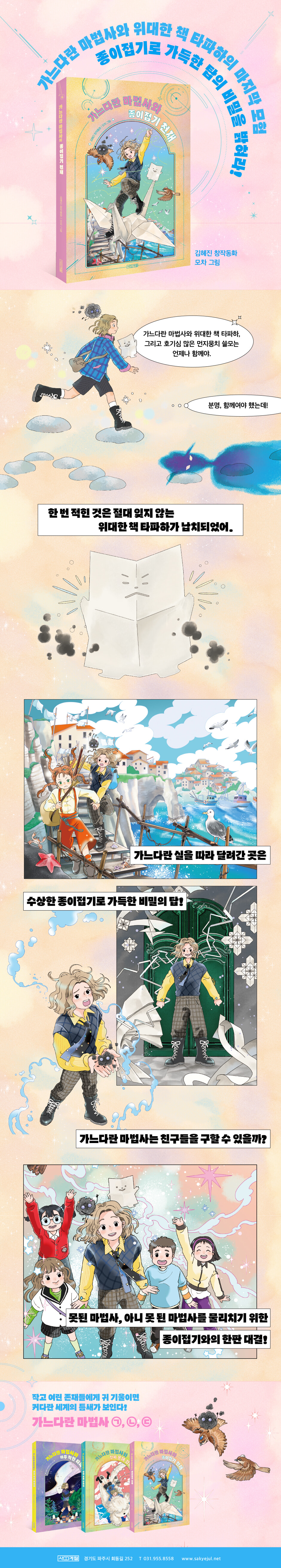 가느다란 마법사는 가느다란 마법을 쓴다. 특이하기는 해도 쓸데는 없어 보인다. 가느다란 마법사 자신도 그렇게 생각했다. ‘잠자리 날개 고쳐 주기’나 ‘손바닥에 박힌 가시를 빼는 일’이 과연 세상에 도움이 될까? 그런데 마법 학교를 졸업한 뒤 가느다란 마법사는 굉장히 바쁜 날들을 보냈다. 세상에는 사람들이 무심코 지나치는 가느다란 존재들도, 가느다란 마법이 필요한 곳도 정말 많았기 때문이다. (가느다란 마법사의 지난 활약이 궁금하다면 〈가느다란 마법사〉 시리즈 ㉠과 ㉡을 읽어 보시길 바란다.) 그사이 친구도 생겼다. 궁금한 게 많은 먼지뭉치 ‘쓸모’, 종이 한 장짜리 책 ‘타파하’와는 늘 함께다. 특히 마법 학교 도서관에서 누군가 읽어 주기를 기다리다 그만 자존심이 상해 탈출한 타파하는 특유의 수많은 지식으로 이제껏 위기 때마다 마법사를 도왔다. 동네 아이들 허지, 이예, 유호, 김서도 빼놓을 수 없다. 친구끼리는 이름을 줄여 부르는 아이들이 마법사를 ‘가느다’라고 부르는 걸 보면, 아이들도 마법사를 친구로 여기는 게 틀림없다. 얇은 실도 여러 가닥을 합하면 끊기 어렵듯, 친구들이 많아질수록 가느다란 마법사가 강해지는 것은 당연한 일이다. 툭하면 학교로 돌아갈 궁리를 하던 어린 마법사는 이 커다란 세상에도 가느다란 마법이 꼭 필요하다는 사실을 깨달으면서 조금씩 성장했다. 『㉢ 가느다란 마법사와 종이접기 천재』는 앞서 발표된 두 권의 책에 켜켜이 쌓여 있던 소중한 인연, 김혜진 작가가 이야기 틈새에 꼭꼭 숨겨 두었던 실마리들이 모여 거대한 모험을 이루는 짜릿한 완결편이다. 한번 책장을 펼치면 멈출 수 없고, 다 읽고 나면 첫 권부터 복습하고 싶어지는 재미! 시리즈 완결편의 미덕을 오롯이 갖춘 작품이다. 위대한 종이-책 타파하가 납치됐다 걱정 많은 사람 앞에 나타나는 ‘못해 강아지’가 동네에 나타났을 때, 가느다란 마법사는 가느다란 빗으로 강아지의 털에 엉킨 걱정을 빗어 주었다. 그러나 못해 강아지인 척했던 정체불명의 검은 덩어리는 그 틈에 마법의 힘을 빼앗고, 종이얼굴 인간과 함께 사라졌다. 처음부터 힘을 훔치러 왔던 것이다. 가느다란 마법사는 검은 덩어리를 잡기 위해 마법 학교와 친구인 가벼운 마법사, 뜨거운 마법사에게 도움을 청했다. 그런데 그가 잠시 자리를 비운 사이, 타파하가 납치된다. 쓸모와 가느다란 마법사는 초록 실 마법으로 범인의 뒤를 쫓는다. 실을 따라가 도착한 곳은 바닷가에 자리한 장인 마을. 그곳에서 만난 망치잡이는 ‘종이-책’을 찾는다는 마법사에게 ‘접이꾼’ 이야기를 들려준다. 절벽 위 높은 탑에 사는 접이꾼이 어찌나 종이를 잘 접는지, 그가 만든 종이 바퀴는 진짜 바퀴보다 빠르게 구를 정도라는 것이다. 접이꾼이 종이접기에 마법의 힘을 불어넣고 있음을 직감한 가느다란 마법사는 탑의 지하로 숨어든다. 한편 납치된 타파하는 탑 꼭대기에서 범인인 접이꾼과 마주한다. 그런데 놀랍게도 타파하와 접이꾼은 아는 사이인 듯하다! 종이 한 장짜리 책과 종이접기 천재 사이의 해묵은 인연이 밝혀지고, 언젠가 타파하와 한 권의 책으로 묶여 있었다는 또 한 장의 종이-책이 등장하면서 접이꾼의 음모가 조금씩 드러난다. 종이와 먹에서 탄생한 마법은? 탑의 지하에는 오래된 벽돌에 종이를 잇대어 만든 미로가 있다. 미로 곳곳의 종이 함정들은 정교하고 날카롭다. 종이에 손끝만 베여도 얼마나 아픈가를 상상하면, 종이 갈고리에 긁히고 뾰족한 종이 턱에 걸려 넘어지는 가느다란 마법사를 아슬아슬한 마음으로 지켜보게 된다. 오소리 보부상의 도움으로 마법사를 구하러 온 김서, 허지, 이예, 유호 덕분에 가까스로 미로를 빠져나오지만, 이번에는 종이접기로 만든 동물들이 공격해 온다. 종이로 접은 사슴과 공작새, 뱀이 마치 살아 있는 것처럼 마법사와 아이들을 위기에 빠뜨린다. 종이접기로 탄생한 존재들과의 대결은 사뭇 흥미진진하다. 게다가 동네 아이들과 접이꾼의 대결 방법은 바로 ‘동서남북’이다! 어린이라면 누구나 한 번쯤 해 보았을 법한 손 놀이인 동서남북에 운명을 건 내기는 볼수록 비장해서 더욱 웃음이 나온다. 종이는 얇고, 잘 찢어지고, 구겨진다. 접이꾼은 “누가 구겨 쓰레기 봉투에 넣으면 스스로 나올 수도 없는” 신세라고 타파하를 비웃는다. 그렇다고 종이를 약하다 할 수 있을까? 종이에는 그림이나 글자를 적어 남길 수 있고, 그렇게 만들어진 책은 수백 년을 살기도 한다, 먹종이처럼 무언가를 옮겨 적을 수도 있고, 접어서 전혀 다른 모양을 낼 수 있다. 여러 장을 겹치면 쉽게 찢을 수 없는 힘을 낸다. 〈가느다란 마법사〉 시리즈는 ‘가느다란 것은 약한 것’이라는 편견을 번번이, 즐겁게 깨뜨려 왔다. 이번 이야기에서는 종이가 가진 다양한 면모가 재미와 마법의 원천이 된다. 모든 힘을 가질 수 있다면? 가느다란 마법사는 ‘가느다란 힘’을 알아볼 수 있기에 마법을 쓸 수 있었다. 접이꾼은 세상 모든 힘을 볼 수는 있지만 쓸 수는 없는 존재다. 그래서 더욱 모든 힘을 가지고 싶어 했고, 비극이 시작되었다. 접이꾼은 거대한 탑에 스스로를 가두고 다른 마