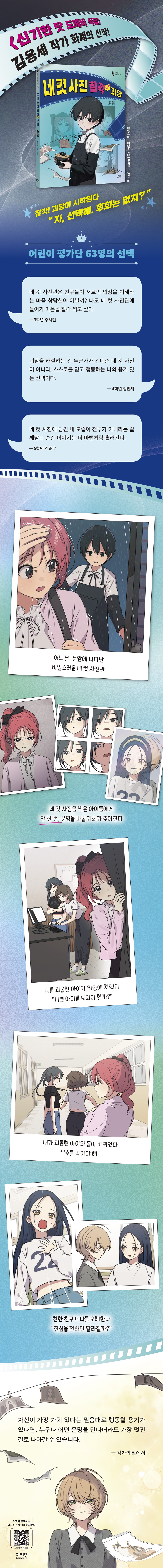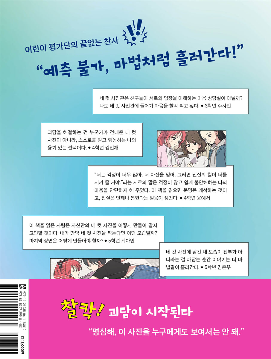 오싹하고 신비한 네 컷 사진관 한순간의 선택이 불러온 폭풍 같은 결과 「방송부 괴담」의 주인공 혜윤이는 그토록 꿈꿨던 방송부 아나운서로 합격했지만 걱정이 이만저만이 아니다. 학교에서 제일 잘 나가는 인주 무리도 방송부에 합격했기 때문이다. 혜윤이의 예상대로 인주 무리는 마치 6학년 선배라도 된 양 혜윤이를 맘껏 부리며 심술궂게 행동한다. 심지어 중요한 버스킹 행사에서 혜윤이를 곤경에 빠뜨리는 바람에 혜윤이는 수습 부원 자리에서 잘릴 위험에 처한다. 그런 혜윤이 앞에 마법처럼 등장한 네 컷 사진관, 그리고 정체를 알 수 없는 사진관 주인 시로. 혜윤이는 탁자 위에 놓인 마스크 팩을 홀린 듯 집어 사진을 찍는다. 시로는 네 컷 사진 속에 혜윤이의 문제를 해결할 단서가 들어 있다며, 한 컷을 고르라고 말한다. 망설이던 혜윤이는 끝내 서글픈 눈물이 흐르는 사진 한 컷을 고른다. “넌 너무 걱정이 많아. 너 자신을 믿어. 그러면 진실의 힘이 너를 지켜 줄 거야.” _본문에서 시야가 반전되더니 익숙한 방송실 풍경이 펼쳐진다. 그곳에서 혜윤이는 인주 무리가 버스킹 행사 전날 자신을 모함하는 계획을 세우는 현장을 목격한다. 배신감과 고통으로 혼란스러워하는 혜윤이 귓가에 스스로를 믿고 진실하게 다가가라는 마음의 소리가 들려온다. 용기를 내 아이들에게 다가간 혜윤이. 그런데 아이들의 반응이 평소와 다르다. 혜윤이가 꺼내는 말마다 편을 들어 줄 뿐만 아니라 인주를 제치고 메인 아나운서로 추천까지 한다. 마치 혜윤이가 인주가 된 것처럼 말이다. 네 컷 사진 속 마스크 팩 덕분인지, 마음의 소리를 따라 내 안에 있는 진정한 나를 찾았기 때문인지 알 수는 없지만, 혜윤이는 반짝반짝 빛을 발하는 방송부 에이스 아나운서가 되어 매끄럽게 방송해 나간다. 어떤 상황에서든 나 자신을 믿고 사랑하는 일은 쉽지 않다. 비난하는 말이 가슴 아프게 찔러 오는 순간, 누구든 주눅이 들 수밖에 없다. 『네 컷 사진 찰칵! 괴담』은 스스로가 작아지는 바로 그때, 짧고 강렬한 셔터 소리처럼 어린이 독자의 귓가에 나 자신을 믿으라는 메시지를 전한다. 진짜 나를 마주하는 단 한 장의 사진 현실과 환상을 넘나드는 세 편의 이야기 「뒤바뀐 영혼」은 앞서 혜윤이를 괴롭혔던 인주가 혜윤이와 몸이 바뀌면서 벌어지는 이야기이다. 늘 자신을 추종하는 아이들을 거느리며 남을 괴롭히던 인주가 자기와 정반대 처지인 혜윤이가 되어 역지사지를 경험한다. 한순간에 서열이 뒤바뀐 혜윤이는 인주에게 복수하고 싶은 마음과 네 컷 사진에 갇힐 운명인 인주를 도우려는 마음 사이에서 갈등한다. 인주 역시 과거의 자신이 벌려 놓은 위험한 계획에서 혜윤이의 몸을 지키기 위해 노력하며 새로운 관계로 나아가기 위해 발돋움한다. 마지막 이야기 「전학생」은 키우던 고양이 치즈를 잃고 친구들과 관계가 뒤틀린 윤지가 신비로운 전학생 민아를 만나면서 시작된다. 화를 냈다가 슬퍼했다가 하루에도 몇 번씩 감정이 오락가락하는 윤지는 “진실은 언제나 큰 힘이 있는 법”이라는 시로의 말을 따라 용기를 내 진심을 전한다. 어린이 평가단은 민아의 정체를 이 책의 가장 큰 재미 요소로 꼽기도 했다. ‘용기 있는 선택이 쌓여 우리를 만든다’ 자신만의 길을 만들어 가는 모두를 향한 응원 김용세 작가는 무언가를 선택해야 하는 곤란한 상황이 마치 괴담을 들을 때 등골이 서늘해지고 긴장되는 감각과 비슷한 데서 이 이야기를 떠올렸다. 거기에 어린이에게 친숙한 네 컷 사진이라는 놀이를 더해 익숙함과 신비로움이 공존하는 독특한 판타지 동화를 탄생시켰다. 삽화를 맡은 김연우 작가의 뛰어난 연출과 웹툰을 보는 듯한 속도감이 작품에 스릴을 더한다. 괴담 뒤에 숨은 따듯한 이야기를 효과적으로 끌어낸 삽화 덕분에 괴담을 무서워하는 어린이도 안심하고 볼 수 있다. 사진관 주인 시로가 건네는 단 한 번의 기회, 그 선택으로 내 운명이 거침없이 뒤바뀐다면 어떨까. 분명 쉬운 선택은 아닐 것이다. 그러나 이야기 중간중간 들려오는 마음의 소리에 귀 기울인 독자들이라면 한순간의 선택이 결과를 만드는 게 아니라, 그 이후 나의 행동이 결과를 만든다는 사실을 발견할 것이다. 선택은 출발선에 불과하다. 출발 신호가 울리고 달리기를 시작하고 나면 어느새 첫발을 어떻게 디뎠는지는 생각조차 나지 않는다. 달리기에서 중요한 것은 오직 내딛는 발과 발의 연결이다. 네 컷 사진이 누군가의 운명을 불행으로 내몰자 한때 선택을 후회했지만, 결국 아름다운 결과를 만들어 낸 혜윤이와 인주처럼 이 책의 독자들도 스스로를 믿고 행동하면 끝내 자신이 원하는 곳에 도착할 수 있을 것이다. |