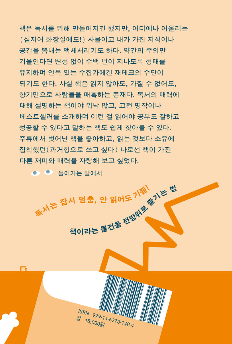 책이라는 물건을 전방위로 즐기는 법 책으로 누릴 수 있는 재미가 과연 ‘읽는 재미’뿐일까요? 책 사는 속도가 읽는 속도를 추월해 버린 애서가 분들이라면, 책으로 노는 방법이 무궁무진하다는 사실에 공감하실 겁니다. 표지 질감을 손으로 느껴보기도 하고 은은한 종이 냄새도 맡아 보고, 마음에 드는 책갈피도 모아보고. 책이라는 매체 그 자체가 가지는 매력은 그 오랜 역사만큼 두텁습니다. 또 책이 만들어 낸 문화는 얼마나 풍성한가요. 다양한 매력을 뽐내는 서점과 도서관을 찾아다니고, 사랑하는 작가의 기념관을 찾아가고 이따금씩 북페스티벌에 들려 책을 보는 재미도 빠트릴 수 없겠죠. 서평을 쓰거나 마음에 드는 문장을 필사하는 재미도, 누군가에게 선물할 책을 심사숙고하며 고르는 재미도, 애써 초판본을 구해보거나 채우지 못한 시리즈를 하나씩 모으는 재미도 있을 겁니다. 오탈자를 찾아내고 우쭐하는 사소한 재미거리도 있고요. 독서를 잠시 멈추고 돌이켜 보면, 책과 함께한 기쁨의 순간이 오롯합니다. 그 누구보다 책이라는 물건 그 자체를 사랑하는 조경국 작가가, 책과 놀던 순간들을 이 책에 모아 담았습니다. 10여 년간 헌책방을 꾸려오며 수많은 책을 만지고 나누고 이야기하며 누린 스무 가지 재미를 한데 모아본 것이지요. 꿈꾸던 서점에 가기 위해 오토바이로 유라시아를 횡단하고 패스트푸드 포장 종이로 책을 단단히 싸매는 조경국 작가의 책 이야기에는, 책 좋아하는 사람이라면 고개를 끄덕거릴 애서가의 즐거움이 가득합니다. 책을 멀게 느끼셨던 분들이라도, 어서 한번 책으로 놀아보고 싶을 만큼 매혹적인 책의 전방위적 매력이 담겼습니다. “안 봐도 책이다!” 이모저모 뜯어보며 즐기는, 책에 숨겨진 재미 온라인으로 손쉽게 책을 구입하고는 하는 시대이지만, 직접 보고 만져 보아야 느껴지는 책의 매력이 분명 있지요. 무게와 질감, 색감과 냄새. 즐겁게 읽어낸 책의 내용이 책의 물성과 딱 맞닿는 그 순간은 종이책을 읽는 큰 즐거움 중에 하나일 거예요. 책등, 책배, 책머리 등으로 불리는 책의 각 부위들은 마치 책이 하나의 몸인 것처럼 그 매력을 슬며시 뽐내고 있습니다. 이 책에도 책 그 자체를 즐길 수 있는 재미가 곳곳에 숨어 있어요. 때로는 거추장스럽게 느껴지기도 하는 띠지는 툭 잘라 책갈피로 쓸 수 있습니다. 종종 띠지를 책갈피로 만들어 쓴다는 조경국 작가의 말대로, 책갈피로 만들 수 있는 ‘책갈피용 띠지’를 둘렀습니다. 또 책의 앞날개에는 하나의 선이 더 숨어 있어요. 날개를 본문에 끼우는 것처럼 접으면, 선이 접히며 책배가 완전히 덮입니다. 고양이가 가지고 노는 책의 가름끈을 닮은 그림이 스르륵 나타나지요. 바로 그 고양이는, 책의 왼쪽 페이지 하단에서도 확인하실 수 있어요. 어릴 적 종이뭉치를 휘리릭 넘기면 나타나는 플립북 애니메이션을 기억하시나요? 책을 넘기면 고양이가 책탑을 툭툭 치다가 무너트리는 재미있는 애니메이션을 즐기실 수 있어요. 책을 이모저모 뜯어보는 재미를 따라가다 보면, 책의 무궁무진한 매력에 조금씩 마음이 동하실 거예요. 조경국 작가는 이렇게 말합니다. “이 책을 쓴 목적은 단 하나, 책방으로 사람들을 이끌어 책을 사게 만드는 것이다. 읽지 않아도 사서 집에 쟁여 놓고 싶게 하는 많은 재미를 알려주고 싶었다.” 읽는 재미는 잠시 접어두고, 책과 함께 같이 놀아봅시다! |