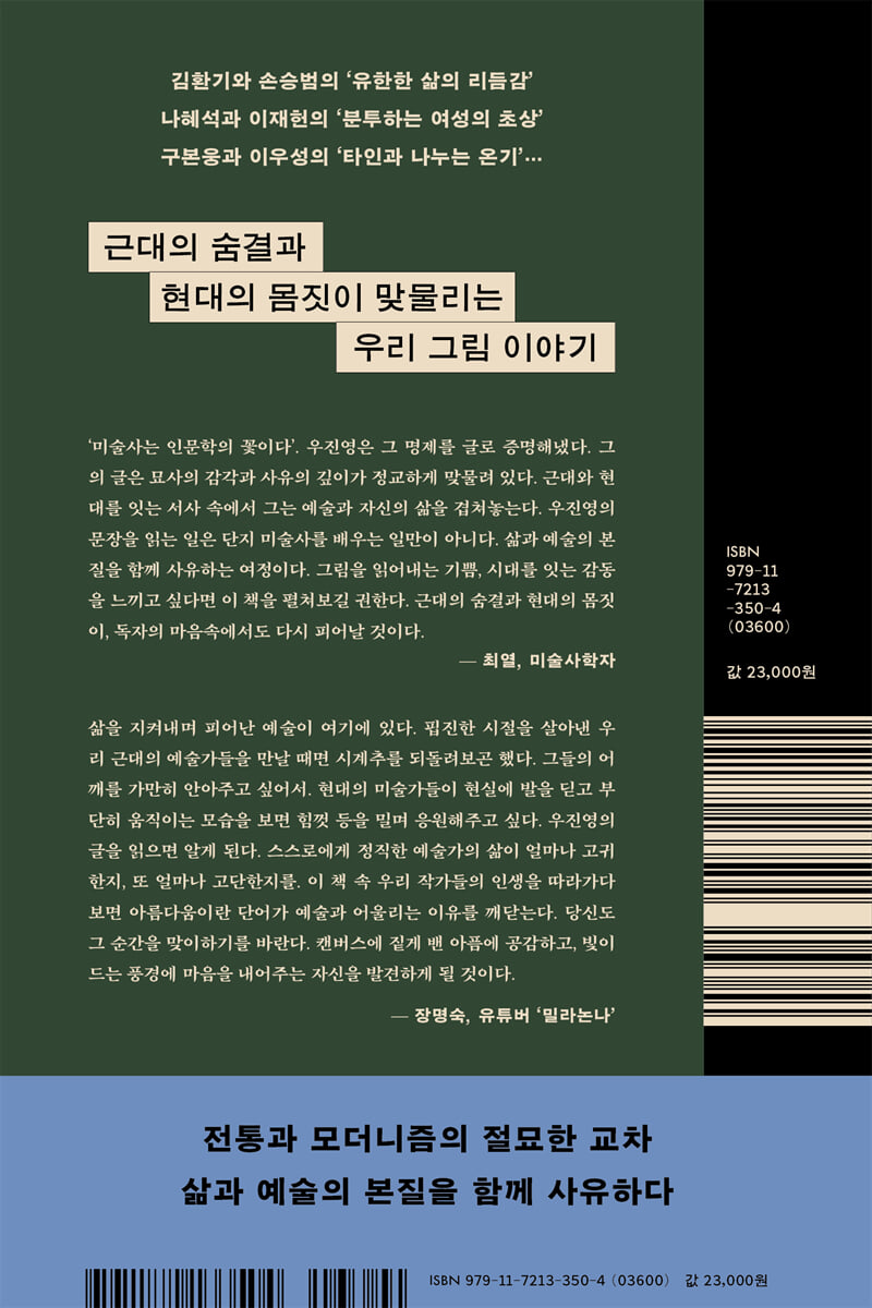 삶을 지켜내며 피어난 예술이 여기에 있다. 우진영의 미술 칼럼을 처음 읽었던 때가 떠오른다. 핍진한 시절을 살아낸 우리 근대의 예술가들을 만날 때면 시계추를 되돌려 보곤 했다. 그들의 어깨를 가만히 안아주고 싶어서다. 현대의 미술가들이 현실에 발을 딛고 부단히 움직이는 모습을 보면 힘껏 등을 밀며 응원해주고 싶다. 그녀의 글을 읽으면 알게 된다. 스스로에게 정직한 예술가의 삶이 얼마나 고귀한지, 또한 얼마나 고단한지를.