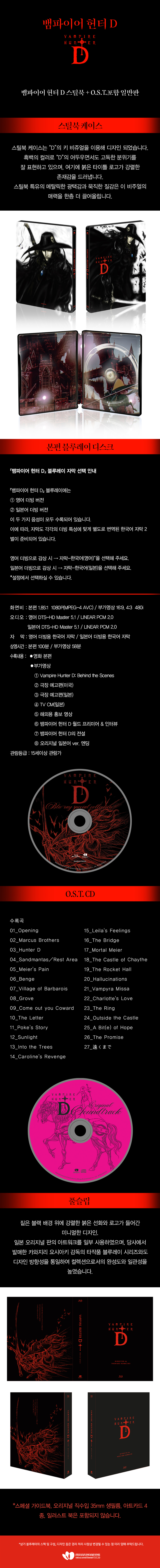 Disc.1 - 본 편 - SUPPLEMENT(부가영상) ①Vampire Hunter D: Behind the Scenes ②극장 예고편(미국) ③극장 예고편(일본) ④TV CM(일본) ⑤해외용 홍보 영상 ⑥뱀파이어 헌터 D 월드 프리미어 & 인터뷰 ⑦뱀파이어 헌터 D의 전설 ⑧오리지널 일본어 ver. 엔딩 [본편 블루레이 디스크] 『뱀파이어 헌터 D』 블루레이 자막 선택 안내 『뱀파이어 헌터 D』 블루레이에는 ① 영어 더빙 버전 ② 일본어 더빙 버전 이 두 가지 음성이 모두 수록되어 있습니다. 이에 따라, 자막도 각각의 더빙 특성에 맞게 별도로 번역된 한국어 자막 2벌이 준비되어 있습니다. 영어 더빙으로 감상 시 → 자막-한국어(영어)을 선택해 주세요. 일본어 더빙으로 감상 시 → 자막-한국어(일본)을 선택해 주세요. *설정에서 선택하실 수 있습니다. Disc.2 - [O.S.T. CD] 수록곡 01_Opening 02_Marcus Brothers 03_Hunter D 04_Sandmantas/Rest Area 05_Meier's Pain 06_Benge 07_Village of Barbarois 08_Grove 09_Come out you Coward 10_The Letter 11_Poke's Story 12_Sunlight 13_Into the Trees 14_Caroline's Revenge 15_Leila's Feelings 16_The Bridge 17_Mortal Meier 18_The Castle of Chaythe 19_The Rocket Hall 20_Hallucinations 21_Vampyra Missa 22_Charlotte's Love 23_The Ring 24_Outside the Castle 25_A Bit(e) of Hope 26_The Promise 27_遠くまで PACKAGE - [스틸북 2disc 케이스] 스틸북 케이스는 “D”의 키 비쥬얼을 이용해 디자인 되었습니다. 흑백의 컬러로 “D”의 어두우면서도 고독한 분위기를 잘 표현하고 있으며, 여기에 디보싱된 붉은 타이틀 로고가 강렬한 존재감을 드러냅니다. 스틸북 특유의 메탈릭한 광택감과 묵직한 질감은 이 비주얼의 매력을 한층 더 끌어올립니다. - [풀슬립] 짙은 블랙 배경 위에 강렬한 붉은 선화와 로고가 들어간 미니멀한 디자인. 일본 오리지널 판의 아트워크를 사용하였으며, 당사에서 발매한 카와지리 요시아키 감독의 다른 작품 블루레이 시리즈와 디자인 방향성을 통일하여 컬렉션으로서의 완성도와 일관성을 높였습니다. ***스페셜 가이드북, 오리지널 직수입 35mm 생필름, 아트카드 4종, 일러스트 북은 포함되지 않습니다. |