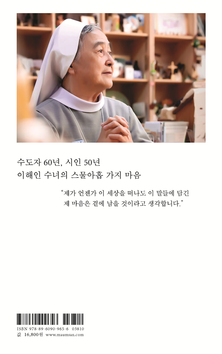 1 수도자와 시인 두 존재 두 역할 속에서 2 작은 향기와 몫으로 시의 꽃을 3 넓을 광에 편안할 안 4 정직하고 겸손하게 목소리를 내기 5 인생의 사계절을 거쳐 익은 열매 6 당신 앞에 책이 되는 순간 7 사랑 애보다 어질 인이 좋아요 8 수십 년 전 작은 아이가 했던 말 9 큰 나무가 다 쓰러져도 작은 꽃들은 살아남아 10 그때만 표현할 수 있는 노래가 있기에 11 글방의 서랍 속에 차곡차곡 12 소망을 이어받아 기도하는 심부름꾼 13 넓어져라 깊어져라 순해져라 14 먼지 묻은 신발을 깨끗이 닦아주는 마음으로 15 의식적으로 깨어 있기 16 내가 아니면 누가, 지금 아니면 언제 17 깨끗한 말, 따뜻한 말, 겸허한 말, 진실한 말 18 절로 시인이 되지 않을 수가 19 내 안의 마음은 내가 만들어야 하는 것 20 제맛을 낼 때까지 인내 속에서 21 남몰래 흘린 눈물이 진주가 되어 22 아픔도 이제는 친구 23 모든 것이 좋았다고 모든 것에 감사했다고 24 함께 산다는 사실이 힘과 용기를 25 읽고 쓰는 수도자로 살아온 지 60년 26 독자들은 언제나 선물 같아요 27 책들에게 고맙다는 인사를 28 민들레 솜털처럼 좋은 씨를 뿌렸구나 29 제게 보내진 마음들을 생각하며 |