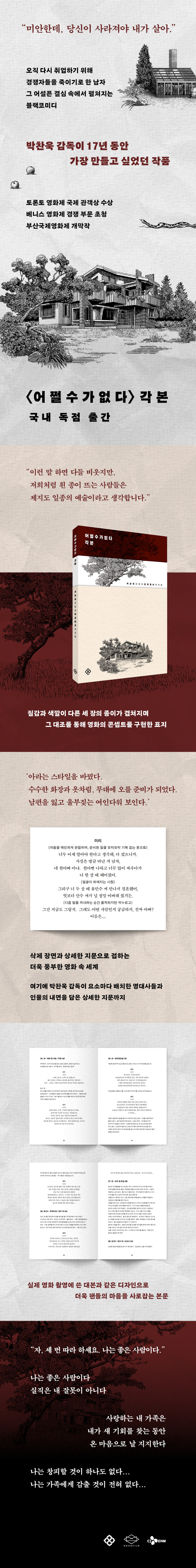 노동자의 자부심은 어떤 형태여야 하는가?서글픈 웃음이 우리에게 던지는 질문특히 이 영화의 코미디에 동력을 제공하는 배경이 정리해고와 실직 문제라는 점은 관객에게 복잡한 심경을 안겨 준다. 그 소재가 친숙하기 때문이다. 이 영화를 보는 ‘나’ 역시 주인공 만수가 처한 위기를 겪을 수도 있다는 두려움은 가장 큰 웃음을 터뜨려야 할 순간마다 그림자를 드리운다. 나라면 그 상황에서 ‘어쩔수가없다’고 말하지 않을 수 있을까? 다른 해결책을 마련할 수도 있을까? 사실 이 영화에서 ‘어쩔수가없다’고 말하는 사람들은 전통적인 가장 역할을 수행해 온 중장년 남성들이다. 그들은 쉽사리 다른 직업을 택하지 못한다. 직종 자체에 귀천이 있어서가 아니라, 자신이 애정과 시간을―사실상 노동자로서의 거의 전 생애를―퍼부은 자기만의 금자탑이 존재하기 때문이다. 그것은 노동자들만이 가질 수 있는 자부심이지만, 그 자부심을 키우고 지키기 위해서 때로는 예기치 못했던 대가를 치러야 한다는 사실을 알려 주는 이야기는 보기 드물다. 「어쩔수가없다」는 그 사실을 알려 주면서 관객을 망설임 속으로 몰아넣는다. 이 망설임을 여운이라고 부를 수 있다면, 「어쩔수가없다」는 이상하리만치 긴 여운을 남기는 블랙코미디 영화다.영화를 더욱 확장하는 각본의 디테일과작품의 콘셉트를 형상화한 책 디자인『어쩔수가없다 각본』은 이 독특한 여운을 더욱 풍부하게 담고 있다. 특히 박찬욱 감독 특유의 상세한 지문은 등장인물들의 내면을 있는 그대로 보여 주면서 영화를 더욱 잘 이해하도록 돕는다. 또한 이 지문들은 작은 몸짓이나 시각적 요소들까지 담고 있어서 관람 중에는 미처 포착하지 못했던 요소들을 재확인하는 기회를 제공하기도 한다. 물론 많은 팬이 가장 기대하고 궁금해하는 요소인 삭제 장면들도 여럿 담겨 있다. 「어쩔수가없다」를 인상적으로 본 관객은 이 각본으로만 만나볼 수 있는 디테일을 통해 영화의 세계를 더욱 확장하는 즐거움을 만끽할 수 있다.게다가 각본의 표지 역시 영화의 콘셉트를 충실히 따르고 있다. 표지 위에 높이가 다른 두 장의 띠지를 겹쳐 놓아 총 세 장의 종이를 드러내 보이는 것이다. 이 세 종이는 코팅 유무와 두께, 질감이 서로 다른 감촉과 빛깔을 내보이는데, 이러한 대조는 제지업계에 몸담아 온 인물들의 혼전을 나타낸다. 「어쩔수가없다」를 마음 깊이 받아들인 관객이라면 작품의 콘셉트를 감각적으로 재현한 이 각본을 소장할 수밖에 없을 것이다.