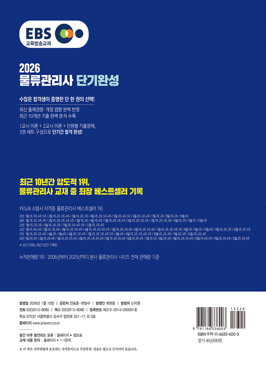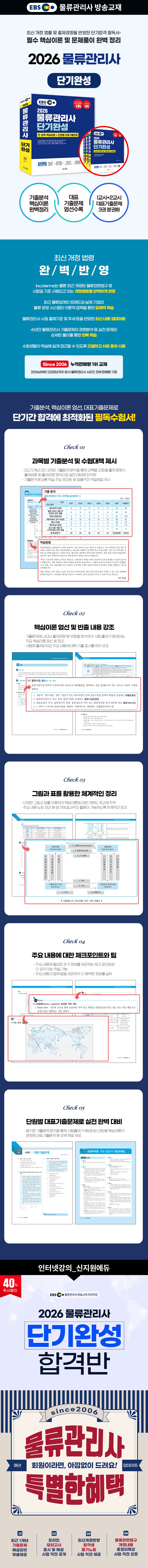 [1과목 물류관리론] CHAPTER 01 물류관리 일반 CHAPTER 02 물류시스템 구축 CHAPTER 03 SCM과 녹색물류 [2과목 화물운송론] CHAPTER 01 화물운송의 기초이론 CHAPTER 02 화물자동차운송 CHAPTER 03 수·배송시스템의 합리화 CHAPTER 04 철도운송 CHAPTER 05 항공운송 CHAPTER 06 해상운송(국제 및 연안운송) CHAPTER 07 국제복합운송 CHAPTER 08 단위적재운송시스템(ULS) [3과목 국제물류론] CHAPTER 01 국제물류관리 CHAPTER 02 무역실무 CHAPTER 03 해상운송 CHAPTER 04 해상보험 CHAPTER 05 항공운송 CHAPTER 06 컨테이너 운송 CHAPTER 07 복합운송 2교시 보관하역론 | 물류관련법규 [4과목 보관하역론] CHAPTER 01 보관론 CHAPTER 02 하역론 [5과목 물류관련법규] CHAPTER 01 물류정책기본법 CHAPTER 02 물류시설의 개발 및 운영에 관한 법률 CHAPTER 03 유통산업발전법 CHAPTER 04 화물자동차 운수사업법 CHAPTER 05 철도사업법 CHAPTER 06 항만운송사업법 CHAPTER 07 농수산물 유통 및 가격안정에 관한 법률 단원별 대표 기출문제 제1과목 물류관리론 * 대표 기출문제 정답& 해설 제2과목 화물운송론 * 대표 기출문제 정답& 해설 제3과목 국제물류론 * 대표 기출문제 정답& 해설 제4과목 보관하역론 * 대표 기출문제 정답& 해설 제5과목 물류관련법규 * 대표 기출문제 정답& 해설 |