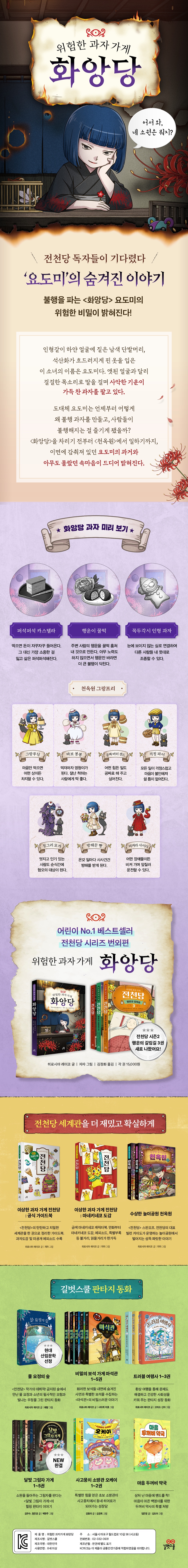 인형처럼 하얀 얼굴에 짙은 남색 단발머리, 붉은 석산화가 흐드러지게 핀 옷을 입은 소녀. 앳된 외모와 달리 걸걸한 목소리로 사람을 홀리는 이 소녀의 이름은 ‘요도미’다. 요도미는 〈전천당〉의 주인 베니코를 눈엣가시처럼 여기며, 사람들에게 악의가 가득 담긴 과자를 파는 〈화앙당〉의 주인이다. 도대체 요도미는 왜 베니코를 그토록 미워하게 된 걸까? 그리고 어떻게 ‘악의 과자 명인’이 되었을까? 이 책은 〈화앙당〉을 차리기 전의 과거부터, 베니코와의 악연, 그리고 무시무시한 놀이공원 〈천옥원〉에서 일하게 되기까지 요도미의 숨겨진 이야기를 다룬다. 사악하지만 어딘가 가여운, 못된 짓만 골라 하지만 어딘가 맘이 쓰이는, 베일에 싸여 있던 요도미의 진짜 모습과 속마음이 드디어 밝혀진다.