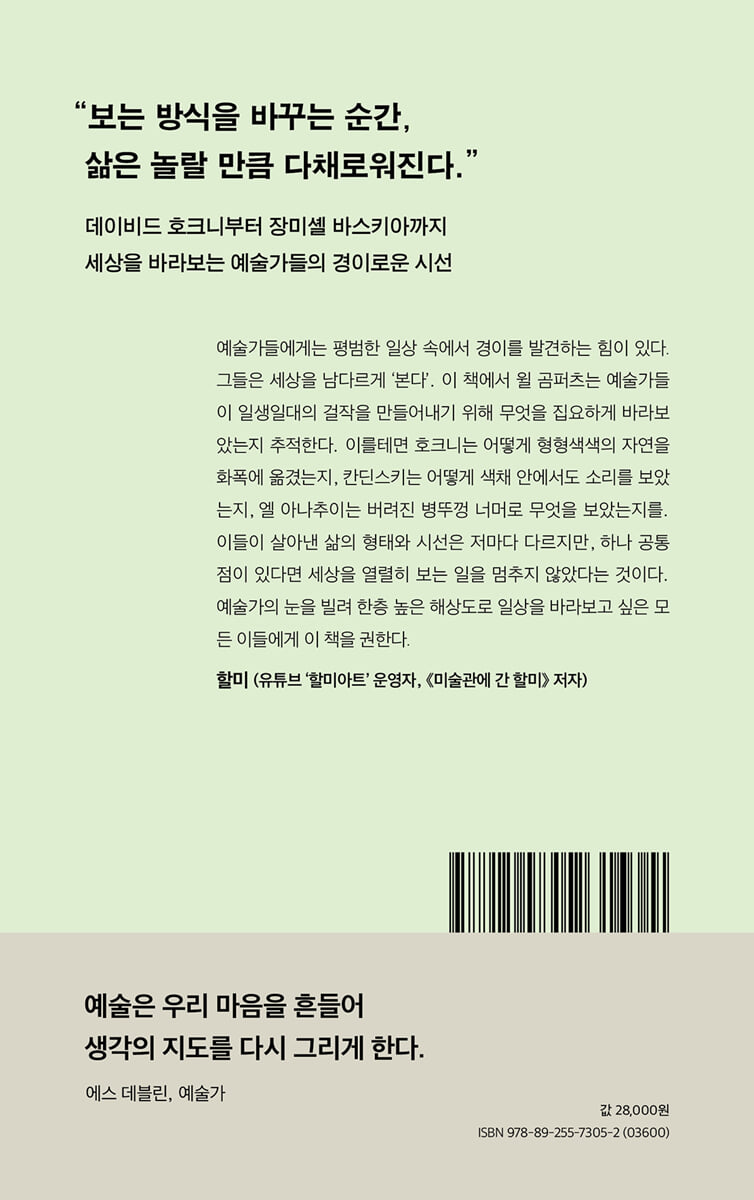 예술가들에게는 평범한 일상 속에서 경이를 발견하는 힘이 있다. 그들은 세상을 남다르게 ‘본다’. 이 책에서 윌 곰퍼츠는 예술가들이 일생일대의 걸작을 만들어내기 위해 무엇을 집요하게 바라보았는지 추적한다. 이를테면 호크니는 어떻게 형형색색의 자연을 화폭에 옮겼는지, 칸딘스키는 어떻게 색채 안에서도 소리를 보았는지, 엘 아나추이는 버려진 병뚜껑 너머로 무엇을 보았는지를. 이들이 살아낸 삶의 형태와 시선은 저마다 다르지만, 하나 공통점이 있다면 세상을 열렬히 보는 일을 멈추지 않았다는 것이다. 예술가의 눈을 빌려 한층 높은 해상도로 일상을 바라보고 싶은 모든 이들에게 이 책을 권한다. - 할미 (유튜브 ‘할미아트’ 운영자, 《미술관에 간 할미》 저자)