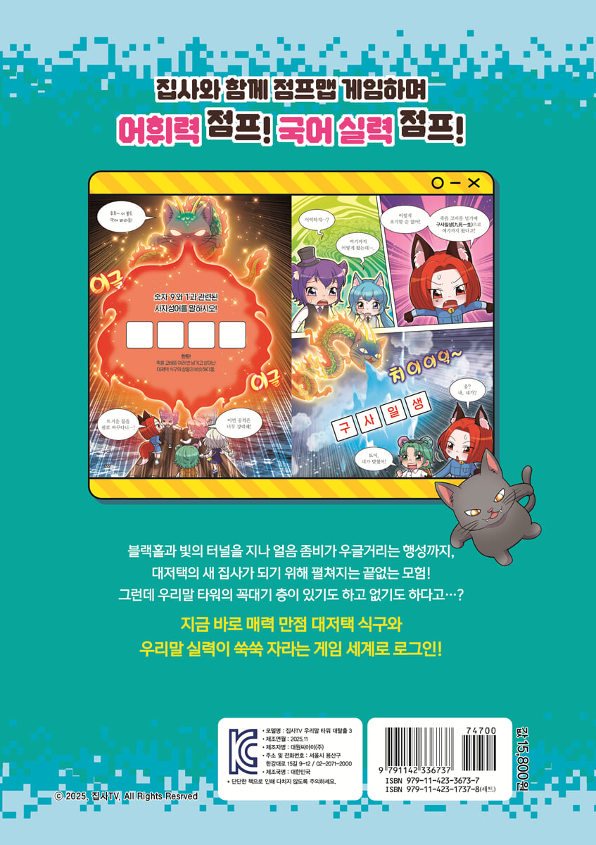 꿩 먹고 알 먹는 엉뚱이의 점프맵 게임 속으로 GO GO! 어린이 구독자의 사랑을 듬뿍 받고 있는 유튜브 채널 〈집사TV〉의 첫 국어 학습만화 『집사TV 우리말 타워 대탈출』 3권이 출간되었어요! 이 책에서 악마 집사가 이끄는 대저택 식구 로희, 료미, 멜로우, 현이머, 또이는 의문의 고양이 ‘엉뚱’이와의 내기로 점프맵 게임 세계에 들어가게 되지요. 점프맵 속 우리말 타워의 꼭대기 층에 가장 먼저 올라간 식구에게는 대저택의 두 번째 집사가 될 수 있는 자격이 주어진대요! 과연 집사와 대저택 식구는 점프맵 속 우리말 타워의 꼭대기 층까지 무사히 올라갈 수 있을까요? 그리고 그중 가장 먼저 꼭대기 층에 올라 대저택의 두 번째 집사가 될 주인공은 누구일까요? 어린이 베스트셀러의 주인공 악마 집사가 이끄는 대저택 식구와 함께 점프맵 게임을 즐기며 신나게 우리말 실력을 키워 보세요. 만화 속 우리말 문제의 정답과 대저택 식구가 알려 주는 해설로 구성된 ‘점프! 집사TV 우리말 상식’ 코너로 더욱 심도 있는 우리말 공부를 할 수 있답니다. 책의 마지막 장을 덮을 때면 어느새 어휘력은 물론 국어 실력이 쑥쑥! 자라 있을 거예요. 투니버스, 애니맥스 어린이 프로그램 BEST 10에 빛나는 70만 구독자 인기 유튜브 채널 〈집사TV〉! 누구로부터인지 언제인지도 모르게 나타난 대저택! 〈집사TV〉는 대저택을 관리하는 악마 집사와 매력 넘치는 대저택 크루 또이, 료미, 멜로우, 푸딩제리, 로희, 현이머의 즐거운 게임 속 이야기를 그린 영상을 제작하는 유튜브 채널입니다. 투니버스와 애니맥스 등 방송사 채널에서 방영되어 어린이 프로그램 BEST 10에 오르기도 한 인기 유튜브 채널이랍니다. 어떤 게임이든 꿀잼 보장! 리더십 넘치는 악마 집사가 이끄는 대저택 크루와 함께 신나는 게임 세계로 떠나요. |