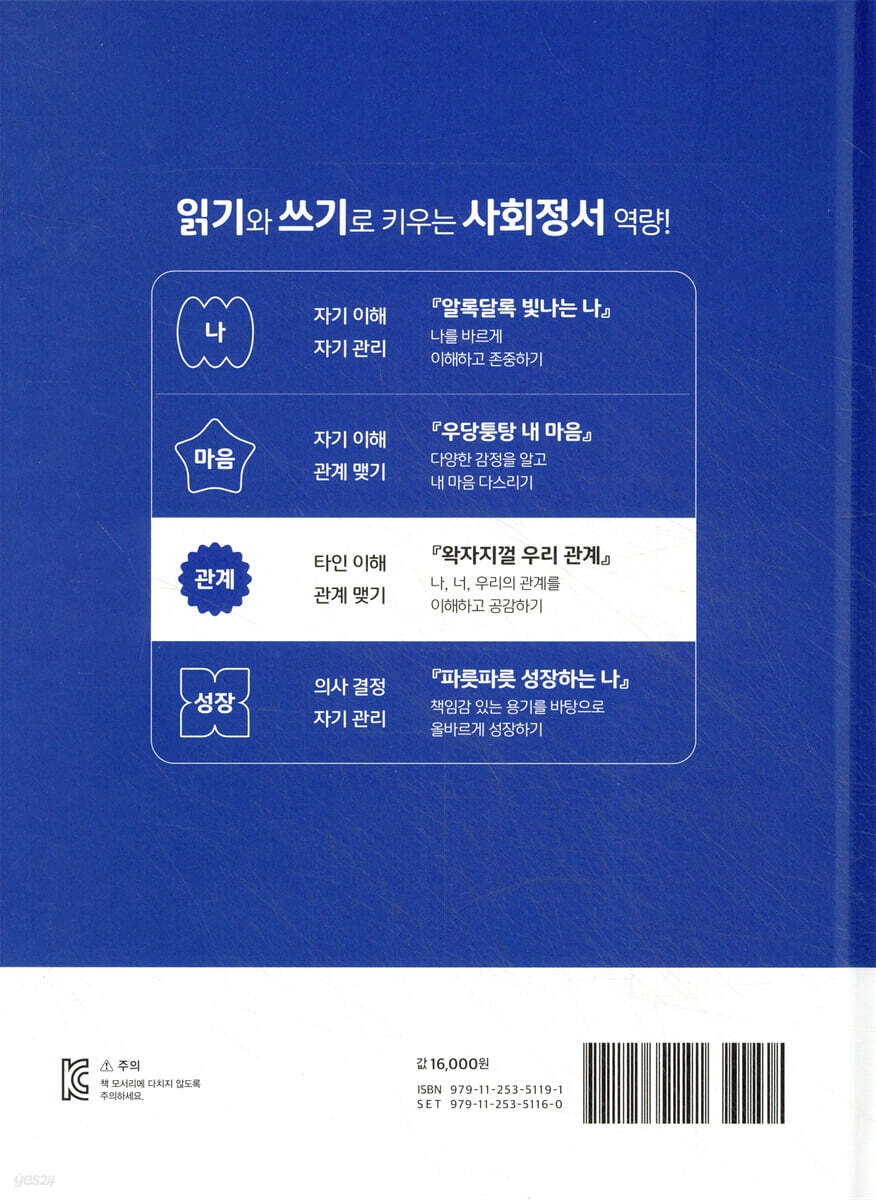 - 자기 이해, 자기 관리, 타인 이해, 대인 관계, 책임 있는 의사 결정의 사회정서교육 5대 핵심 역량을 아이들의 일상 속 이야기로 풀어내 공감하며 배우고, 스스로 생각할 수 있도록 도움. 2. ‘나’, ‘마음’,‘관계’,‘성장’의 네 가지 주제 구성 - 아이들이 자신을 이해하고, 감정을 표현하며, 타인과의 관계를 배우고, 한 단계씩 성장해 나가도록 주제를 선정해 구성함. - 각 권별로 관심 있는 핵심 역량을 중심으로 선택 학습이 가능하며, 전 권을 통해 사회정서 역량을 통합적으로 익힐 수 있음. 3. 생활 속 공감 이야기로 배우는 인성 교육 - 아이들이 실제로 겪을 수 있는 상황을 담은 생활 밀착형 동화를 통해 인성과 사회정서 핵심 역량을 자연스럽게 체득함. - 또래 관계 속 고민이나 갈등 상황에 공감하며 스스로 바람직한 선택과 행동을 고민하고 바르게 성장하도록 도와줌. 4. 읽기와 쓰기를 함께 키우는 통합형 학습 구성 - 따뜻한 동화를 읽으며 문해력과 사고력을 기름. - 주제를 담은 문장을 원고지에 직접 따라 쓰며 올바른 쓰기 습관과 표현력을 함께 키움. - ‘따라쓰기’를 통해 생각을 정리하고 마음에 새기는 경험을 제공함. 5. 낱말놀이를 통한 어휘력 확장 - 이야기 속에서 익힌 어휘를 바탕으로 사다리 타기, 선 잇기, 길 찾기 등의 재미있는 언어 활동을 담은 ‘낱말 놀이’를 통해 즐겁게 어휘력을 확장할 수 있음. |