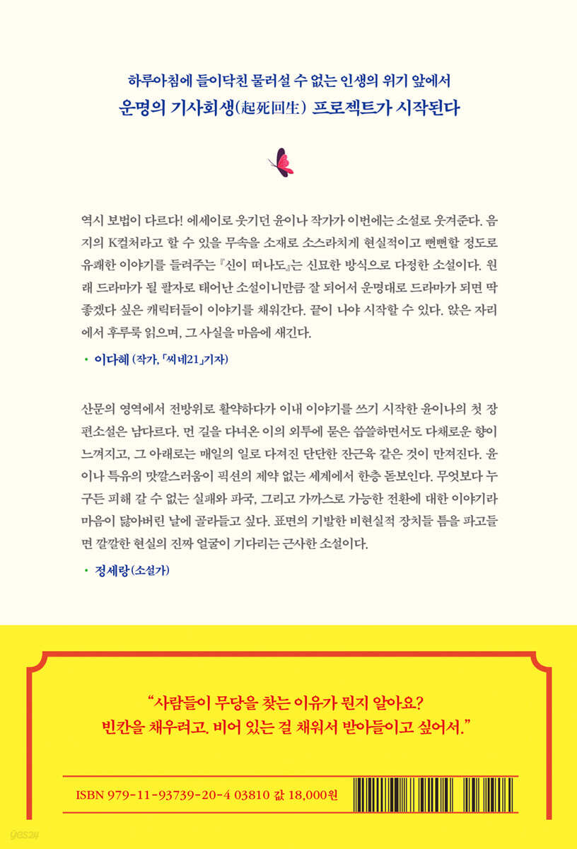 역시 보법이 다르다! 에세이로 웃기던 윤이나 작가가 이번에는 소설로 웃겨준다. 음지의 K컬처라고 할 수 있을 무속을 소재로 소스라치게 현실적이고 뻔뻔할 정도로 유쾌한 이야기를 들려주는 『신이 떠나도』는 신묘한 방식으로 다정한 소설이다. 원래 드라마가 될 팔자로 태어난 소설이니만큼 잘 되어서 운명대로 드라마가 되면 딱 좋겠다 싶은 캐릭터들이 이야기를 채워간다. 끝이 나야 시작할 수 있다. 앉은 자리에서 후루룩 읽으며, 그 사실을 마음에 새긴다. - 이다혜 (기자, 북칼럼니스트, 작가, 「씨네21」기자)