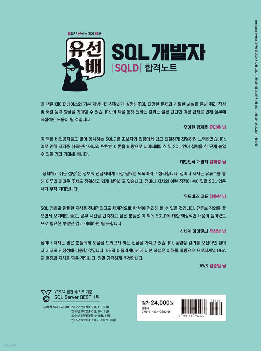 이 책은 데이터베이스에 대한 기본 지식은 없지만 자격증을 취득해보기로 마음을 먹은 용감한 초보자들을 위한 책입니다. 기술 서적의 경우 전공자를 대상으로 쓰인 책이 많기 때문에 초보자들이 술술 읽기에는 조금 무리가 있습니다. 그래서 저자는 데이터베이스에 대한 이해도가 전혀 없었던 대학교 1학년 시절의 본인에게 설명해준다는 생각으로 이 책을 집필하였습니다. 기초 지식이 없는 비전공자들도 『유선배 SQL개발자 합격노트』와 함께 합격의 길에 도달하시길 바랍니다. 시대에듀는 SQL개발자(SQLD) 시험에 도전하는 모든 분의 합격을 진심으로 기원합니다.
