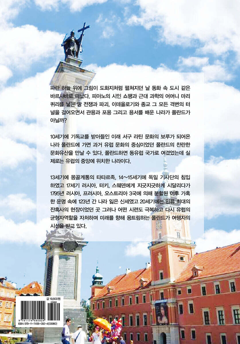 파란 하늘 위에 그림이 도화지처럼 펼쳐지던 날 동화 속 도시 같은 바르샤바로 떠났다. 피아노의 시인 쇼팽과 근대 과학의 어머니 마리퀴리를 낳은 땅 전쟁과 파괴, 이데올로기와 종교 그 모든 격변의 터널을 걸어오면서 관용과 포용 그리고 용서를 배운 나라가 폴란드가 아닐까? 10세기에 기독교를 받아들인 이래 서구 라틴 문화의 보루가 되어온 나라 폴란드에 가면 과거 유럽 문화의 중심이었던 폴란드의 찬란한 문화유산을 만날 수 있다. 폴란드하면 동유럽 국가로 여겼었는데 실제로는 유럽의 중앙에 위치한 나라이다. 13세기에 몽골계통의 타타르족, 14~15세기에 독일 기사단의 침입하였고 17세기 러시아, 터키, 스웨덴에게 지긋지긋하게 시달리다가 1795년 러시아, 프러시아, 오스트리아 3국에 의해 분할된 이후 가혹한 운명 속에 123년 간 나라 잃은 신세였고 20세기에는 인류 최대의 잔혹사의 현장이었던 곳 그러나 어떤 시련도 극복하고 다시 유럽의 균형자역할을 자처하며 미래를 향해 용트림하는 폴란드가 여행자의 시선을 받고 있다. 여행길의 피로를 풀어주는 것은 안락한 호사스러움 보다 늘 이렇게 복작이는 사람소리, 웃음소리, 노래소라라는 생각이 든다. 여행길을 편안하게 만들어 주는 진실함이 묻어나는 폴란드는 120여 년간 지도 위에서 사라진 나라 폴란드 바르샤바는 폐허를 딛고 일어선 대지 위에 평화의 벽돌을 쌓아 올렸다. 구시가지에는 즐거운 음악 소리가 끊이지 않는다. 여행길에 마주쳤던 풍경들을 그림으로 만나는 일은 즐거운 일이다. 토박이 시민들에게도 이방인 여행자들에게도 공평한 휴식과 즐거움을 나눠주는 곳 바르샤바에도 유럽의 여느 도시와 마찬가지로 누구에게나 호의적인 인사를 건네는 평화로운 광장이 있다. 해시태그 시리즈와 함께 폴란드 여행을 떠나요! 저렴한 물가 한동안 폴란드를 여행하는 여행자는 많지 않았다. 그러나 동유럽의 다른 유럽 건축물과 풍경이 여행객의 마음을 훔치면서 체코를 비롯해 오스트리아, 크로아티아까지 인기를 얻더니 지금은 폴란드에도 동유럽을 여행하면서 여행코스로 포함해 여행하는 관광객이 늘어나고 있다. 특히 폴란드는 매우 저렴한 물가로 여행자의 부담을 줄여준다. 잘 보존된 중세 도시 폴란드의 옛 수도였던 크라쿠프는 폴란드가 얼마나 관광지가 많고 보존이 잘되어 있는지를 판단할 수 있는 대표적인 도시이다. 슬픈 역사의 자취 나치 독일은 제2차 세계대전 동안 유대 인과 다른 민족들을 학살하는 만행을 저질렀다. 이것을 홀로코스트라고 한다. 1933년~1945년까지 나치 독일은 600만 명이 넘는 유대 인들을 죽였다. 이 가운데 110만 명이 폴란드의 아우슈비츠 집단 수용소에서 죽었고 그 중에는 폴란드 인들도 있었다. 인류 역사에서 다시는 일어나지 말아야 할 비극의 현장이 폴란드 남부의 도시 ‘오스비에침’과 ‘비르케나우라’에 보존되어 있다. |
