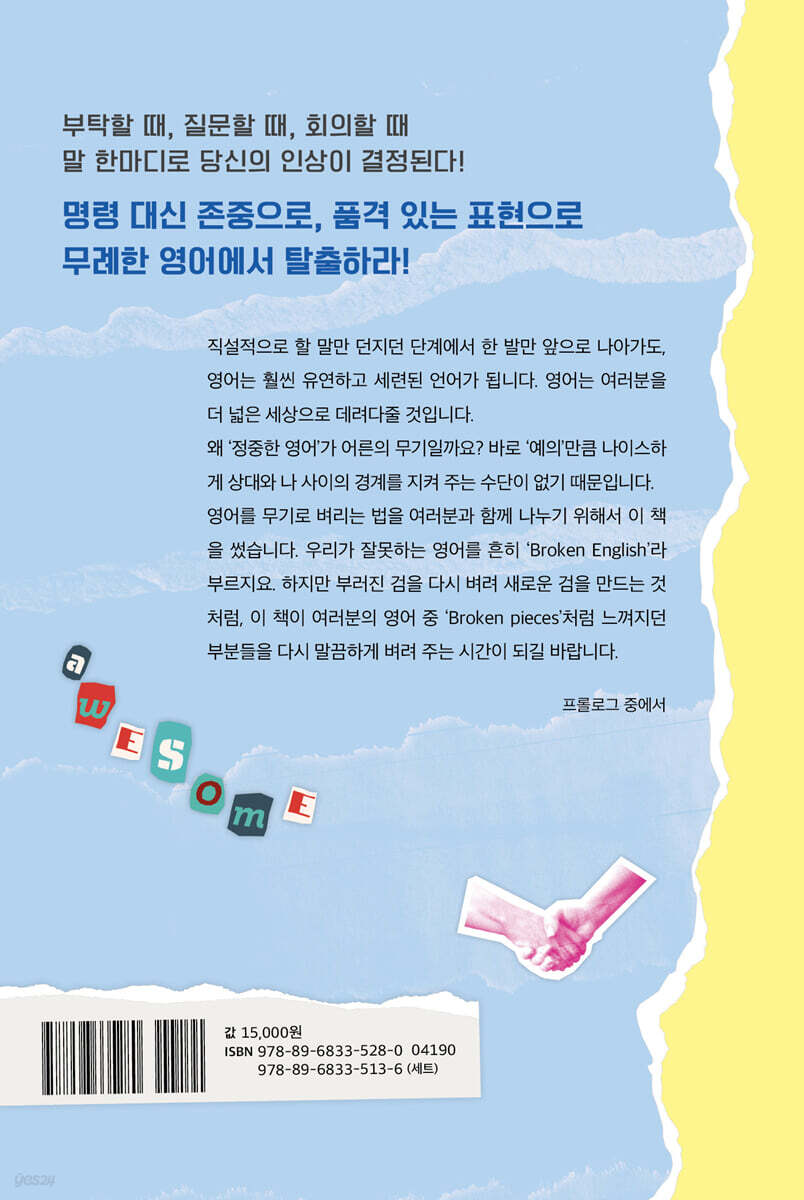 문화 차이와 뉘앙스를 읽는 감각이 진짜 실력이다 영어는 한국어와 달리 존댓말이 없다. 영어권 사람들의 대화 장면을 언뜻 보면 모두가 격의 없는 사이처럼 느껴지기도 한다. 하지만 존댓말이 없다고 해서 각기 다른 사람, 다른 상황에 전부 똑같은 표현으로 말을 건네선 안 된다. 영어에 존댓말은 없지만, 예의 있는 표현은 분명 존재하기 때문이다. 특히 예의 있게 말하기 위해선 언어를 구성하는 4스킬(듣기, 읽기, 말하기, 쓰기) 외에도 5번째 스킬인 ‘문화 인식(Cultural awareness)’을 제대로 갖추어야 한다. 문화 인식을 갖추어야만 생각이 확장될 수 있고, 열린 사고를 할 수 있을 때 상대방을 배려하는 공손한 의사소통이 가능해지기 때문이다. 영어도 한국어와 마찬가지로 매너 있는 표현이 중요하며, 어른의 품격이란 단어 선택에서 고스란히 드러난다. 그것은 진짜 어른이라면 반드시 알아야 할 ‘품격의 기술’이다. 이 책은 다양한 현장에서 30년 넘게 영어를 가르쳐 온 저자가 전문적인 내용을 영어 초심자 눈높이에 맞춰 쉽고 친절하게 가르쳐 주는 영어학습서다. 단지 예의 바른 표현만 소개하는 것이 아니라 근본적인 문화 차이를 이해하고 이야기에 몰입할 수 있도록 저자의 유학 당시 경험과 직접 겪은 에피소드를 본문 곳곳에 수록했다. 뻔한 예문이 아닌 해당 표현이 쓰일 수 있는 상황과 적절한 예시를 구체적으로 소개해 실전 회화에서의 활용도를 높였다. ’Please’로는 부족한 세상, 영어에도 눈치가 필요하다! 오해를 만드는 영어에서, 이해를 부르는 영어로 거듭나자 일반 영어 학습서는 크기가 크고 분량이 많아 일상에서 틈틈이 보기보다는 각 잡고 본격적으로 공부해야 하는 경우가 많다. 늘 바쁘고 시간이 부족한 직장인들, 나 자신과 가족을 먹여 살리는 것만으로도 버거운 어른들에게는 자칫 부담으로 다가올 수 있다. 이 책은 일상에서 가볍게 꺼내 읽을 수 있는 ‘내 주머니 속’ 영어학습서이다. 내용도 어렵지 않아 직장인뿐만 아니라 세대 구분 없이 영어에 관심 있는 모든 이에게 적합한 도서다. 우리가 기본이라 여겼지만 실제로는 정확히 모르거나, 더 다양한 의미가 담겨 있는 기초 영어 표현들의 핵심만을 선별해 짧고 굵게 알려 준다. 실전 영어회화에서 다채롭게 사용할 수 있는 표현을 선별해 넣었기에 활용도가 높으면서도 예의 있는 사람이라는 인상까지 얻을 수 있어 일거양득의 효과가 있다. 외국어를 잘 모를수록 자신이 원하는 바를 상대에게 직설적으로 요구하게 된다. 그 과정에서 실수로 무례를 범하기 일쑤다. 생존 영어(Survival English)를 할 때는 듣는 이들이 양해하며 들어 주지만, 언제까지 그런 배려에 의지할 수만은 없다. 우리에게는 그보다 더 깊이 있는 의사소통을 하고 싶다는 욕구가 존재하기 때문이다. 한 발만 앞으로 나아가도 영어는 훨씬 더 유연하고 세련된 언어가 된다. 이 책을 통해 공손하고 매너 있는 영어를 익혀 보자. 품격 있는 영어는 우리를 더 넓은 세상으로 데려다줄 것이다. 지금 갖추지 않으면 늦습니다. ‘어른의 무기 시리즈’ 두 번째 책 《무례한 영어에서 탈출하기》는 ‘어른의 무기 시리즈’의 두 번째 책이다. 이 시리즈는 30~40대가 진짜 어른, 단단한 어른이 되기 위해 반드시 채워야 할 지식과 교양을 담았다. 각 권마다 나를 성장시키는 창, 나의 미래를 지키는 방패 등 삶에 유용한 도구를 전한다. 아담한 크기, 부담 없는 분량으로 가볍게 지니고 다니며 틈틈이 읽기 좋다. ‘지금 이 순간 당신은 어떤 무기를 갖추고 있는가?’ ‘영어로 대화할 때 매너 있는 어른의 모습으로 다가갈 준비가 되어 있는가?’ 이 책은 출퇴근길이나 점심시간에 틈틈이 영어를 공부하고 싶은 직장인, 좀 더 디테일한 학습으로 영어 실력을 한 단계 끌어올리고 싶은 사람, 자기계발 목적으로 영어 공부 중인 모든 사람을 위한 가볍고 재미있는 영어학습서이다. 무례한 영어에서 벗어나 정중한 어른의 언어를 익히는 것, 그것이 오늘날 우리에게 필요한 또 하나의 ‘어른의 무기’다. |