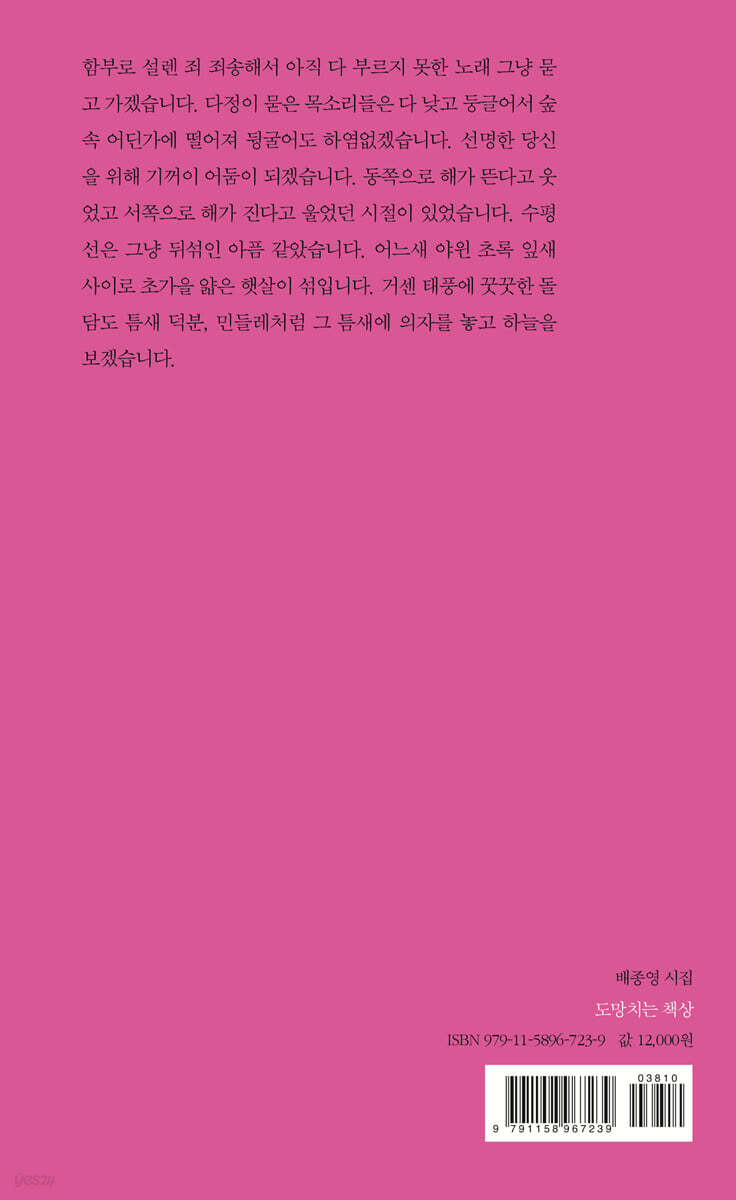 낙타의 빈 등을 보면 어딘가에 짐 부려놓고 홀가분하게 돌아가는 길 같다. 그 빈 등에 힘겨웠던 발목 고이 태우고 헐렁헐렁 걷는다. 마침, 밤하늘엔 움푹 등이 비워진 초저녁달이 보름쯤에 있다는 만월을 실으러 가고 있다. 그러니 헐거워진 그 빈 등, 또 다른 짐을 위해 잠시 비워둔 자리일 뿐이다. …(중략)… 낙타나 사람이나 돌아가는 길은 다 내려놓고 가는 길이라면 언제부턴가 나도 모르게 돌아가고 있는 그 길이 꼭 무거운 길만은 아닌 것 같다. 모든 길은 어두워지면 쉬고 빈 등에 얹힌 달빛, 밤은 낙타들의 등이 눕는 편안한 우리다. 만월을 실어 나르느라 고단한 달의 잔등에도 거뭇한 굳은살 박여 있다. - 「빈 등」 부분 이 시의 매력은 메시지에 있지 않다. 이 시의 매혹은 낙타와 달과 사람의 삶을 관통하는 공통된 코드의 발견에 있다. 낙타의 “빈 등”에서 “움푹 등이 비워진 초저녁달”로 미끄러지는 상상력은 얼마나 기발한가. 이 순간적인 시선의 이동으로 낙타와 달은 동일한 궤도를 함께 도는 친밀한 관계가 된다. 낙타는 무거운 짐을 내린 채 빈 등으로 “헐렁헐렁” 걷고 있고, 마침 그것을 내려다보던 초저녁달은 이제 “만월을 실으러 가고 있다”는 낯설고 이질적인 두 존재를 끈끈한 친족 관계로 만든다. 마치 동종 업종의 형과 아우처럼 초저녁달의 빈 등이 만월을 지러 가면 금방이라도 낙타의 빈 등 역시 다시 무거운 짐을 지러 갈 것이다. 시인은 이 친밀한 궤도에 사람의 운명까지 합세시킨다. “낙타나 사람이나 돌아가는 길은 다 내려놓고 가는 길”이라는 표현이 바로 그것이다. 이것들은 모두 같은 길을 가는 같은 운명의 존재들이므로 자신이나 세계, 그 어느 곳으로부터도 소외되어 있지 않다. 이들은 서로에게 제 몸처럼 매우 친숙하다. 무거운 짐을 실어 나르느라 생긴 “굳은살”은 마치 오래된 농경 공동체의 구성원들처럼 달의 잔등에도, 낙타의 잔등에도, 그리고 사람의 잔등에도 똑같이 박여 있다. 근대 이후의 주체들은 세계가 원래 이토록 아름다운 친화의 내밀한 풍경을 가지고 있다는 사실을 잘 기억하지 못한다. 시인은 이제는 거의 신화가 되어버린 풍경을 마치 그동안 아무 일 없었다는 듯 다시 불러냄으로써 사막 같은 불모의 밤을 따뜻하게 위로한다. “모든 길은 어두워지면 쉬고/빈 등에 얹힌 달빛,/밤은 낙타들의 등이 눕는 편안한 우리”라는 문법이 가동되는 풍경이야말로 분열, 소외, 갈등, 그리고 불화에 지친 존재들이 진정으로 돌아가고 싶은 곳이 아닐까. - 오민석(문학평론가·단국대 명예교수) 시인의 산문 함부로 설렌 죄 죄송해서 아직 다 부르지 못한 노래 그냥 묻고 가겠습니다. 다정이 묻은 목소리들은 다 낮고 둥글어서 숲속 어딘가에 떨어져 뒹굴어도 하염없겠습니다. 선명한 당신을 위해 기꺼이 어둠이 되겠습니다. 동쪽으로 해가 뜬다고 웃었고 서쪽으로 해가 진다고 울었던 시절이 있었습니다. 수평선은 그냥 뒤섞인 아픔 같았습니다. 어느새 야윈 초록 잎새 사이로 초가을 얇은 햇살이 섞입니다. 거센 태풍에 꿋꿋한 돌담도 틈새 덕분, 민들레처럼 그 틈새에 의자를 놓고 하늘을 보겠습니다. 시인의 말 부덕을 뒤져 가까스로 찾은 덕(德) 한 올로 시를 짓는 사람이 되었다. 비 온 뒤 바닥에 고인 물과 납작 엎드린 눈 위의 바퀴 자국으로부터도 쓴소리를 듣고 싶었지만 책상은 자꾸 도망치려고만 했다. 세 번째 민낯을 상재한다. 아마도 주름이 몇 개쯤은 더 는 시편들이겠다. 처음과 같이 이제 와 항상 영원히, 베로니카와 손주 준우에게 이 책을 바친다. 2025년 11월 배종영 |
