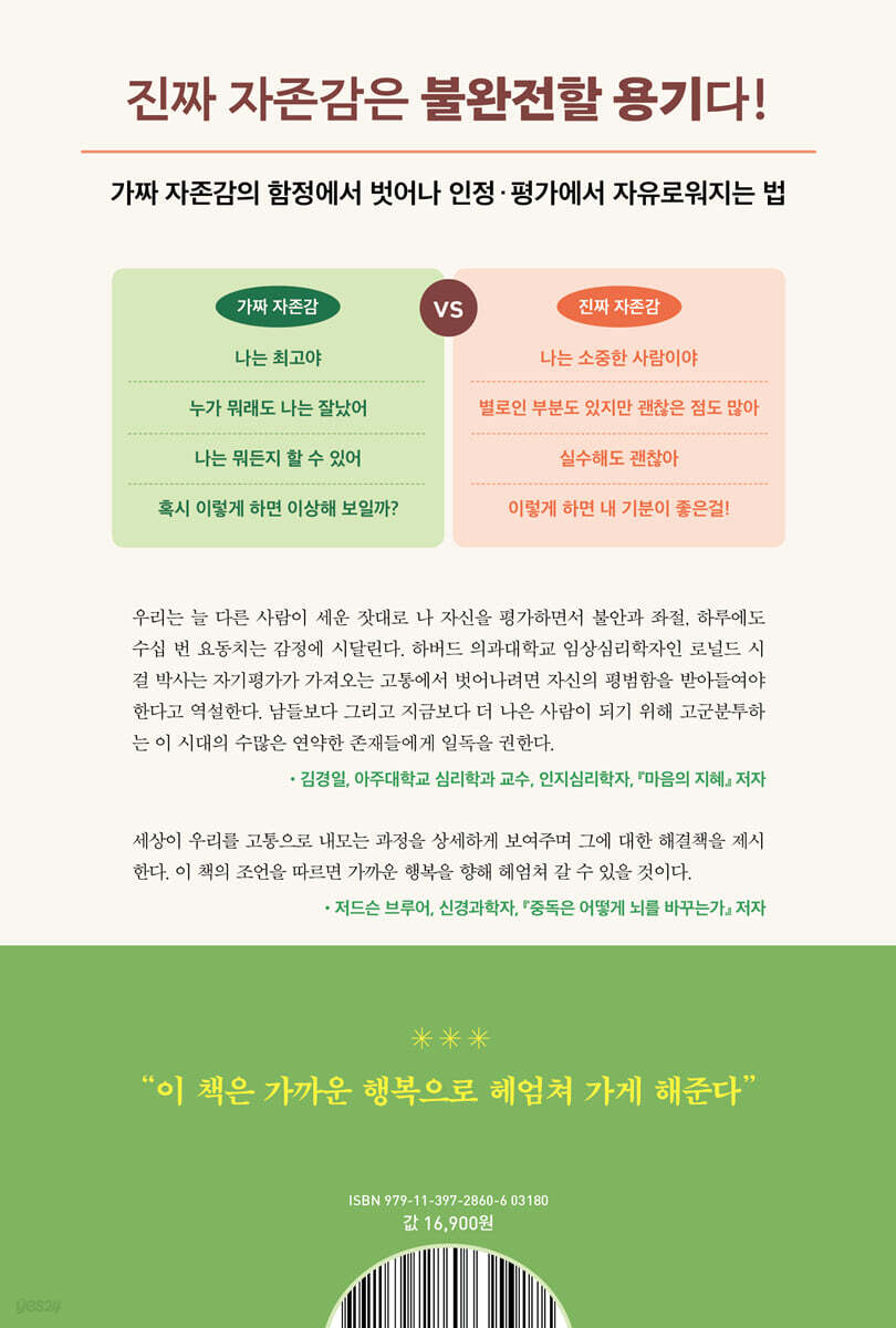 들어가며 1부 언제까지 남과 비교하며 살아야 할까? 1장 아무리 노력해도 행복할 수 없는 이유 ‘지금의 나’에 만족하는 날은 영원히 오지 않는다 │ 두려움과 분노의 진정한 원인 │ 자존감의 기준은 모두 다르다 │ 긍정적인 자아상이 행복에 필수적이다? │ “번뇌는 깨달음의 거름이다” 2장 우리 안에서 상충하는 두 가지 본능 경쟁은 동물의 본성이다 │ 우리를 살아남게 한 이타적 본능 │ 내가 먹이를 주는 늑대가 이긴다 2부 나를 믿고 앞으로 나아가는 법 3장 마음챙김이 찾아주는 진정한 자유 강아지를 대하듯 마음을 돌보기 │ 현재의 경험에 집중하라 │ 마음챙김에도 연습이 필요하다 4장 ‘나’라는 환상에서 벗어나자 ‘하나의 자아’는 존재하지 않는다 │ 내 안의 그림자를 받아들여라 │ 우리는 생각하는 대로 세상을 본다 │ 버거운 감정과 직면하는 법 │ 우물에서 나가 더 넓은 세상을 경험하기 3부 나를 비판하는 습관 점검하기 5장 얼마나 성공해야 만족할 수 있을까? 성취감이 오래가지 않는 이유 │ 의미 있는 목표 찾는 법 │ 평균보다 더 낫다는 착각 │ 우리는 특별해질 필요가 없다 6장 나를 증명해야 한다는 압박감을 떨쳐내는 법 과도한 자존감은 부족한 것만 못하다 │ 우리가 소셜미디어에 올리는 거짓말들 │ 자존감보다 자제력에 집중하라 │ 평범함 속에서 평안을 찾기 7장 보여지는 모습에 집착하지 말라 우리가 쓸데없는 자랑에 집착하는 이유 │ 열등감을 솔직하게 인정하라 │ 최신 유행이라는 함정을 피하는 법 │ 사소한 일에도 품위가 있다 │ 경쟁 본능에서 자유로워지는 길 8장 우리가 소셜미디어를 끊지 못하는 이유 중독의 신경생물학적 메커니즘 │ 남보다 뛰어나지 않아도 호감을 사는 사람의 비밀 │ 나의 중독 행동 인식하기 │ 촉발 요인을 피하라 │ 고통을 외면할 때 중독이 찾아온다 │ 지속 가능한 즐거움을 누리는 비법 4부 분노와 불안에서 벗어나 가까운 행복 찾기 9장 깊은 관계 속에 구원이 있다 연애와 자존감의 상관관계 │ 자기중심적 사랑에는 한계가 있다 │ 솔직한 태도로 상대방을 존중하라 │ 경쟁심이 박탈감을 부른다 │ 분노의 색안경을 벗고 있는 그대로 보기 │ 자만심을 버리고 팀 플레이어 되기 │ 열등감에서 벗어나 내 안의 그림자 탐색하기 │ 공통점을 찾으면 유대감이 생겨난다 10장 우리를 자유롭게 하는 연민의 힘 다른 사람을 보살피는 본능의 기원 │ 연민을 기르는 자애명상의 힘 │ “내가 그 사람이었다면 다르게 행동할 수 있었을까?” │ 먼저 나를 포옹해야 한다 │ 나를 받아들여야 다른 사람과도 잘 지낼 수 있다 11장 고통을 온전히 느껴야만 치유할 수 있다 감정을 다스리려면 먼저 이름을 붙여라 │ 우리는 왜 수치심을 느낄까 │ 부끄러움 권하는 사회 │ 죄책감과 수치심을 분리하기 │ 나를 비판하는 내 안의 목소리와 대화하라 │ 애정 어린 어른의 시선으로 나를 돌아보기 12장 나 자신과 행위를 분리하기 우리가 스스로를 가혹하게 비난하는 이유 │ “네가 나쁜 게 아니라 네 행동이 부적절한 거야” │ 일부러 완벽하지 않게 행동해보기 │ ‘진정한 나’라는 실체는 존재하지 않는다 │ 나와 세계의 경계는 어디일까 13장 평범함이 가장 귀한 것이다 특별함의 저주 │ 스스로에게 너그러워지는 법 │ 노화와 죽음 앞에서 │ 무의미를 받아들이면 행복이 찾아온다 14장 나를 넘어 행복으로 가는 길 우리는 모두 연결되어 있다 │ “이기적으로 행동하세요. 서로 사랑하세요.” │ 지금이 고통스러울 때 가장 좋은 약은 감사다 │ 다시 상처받을 위험을 감수하는 용기 │ 실패는 성장의 기회다 감사의 글 참고문헌 |