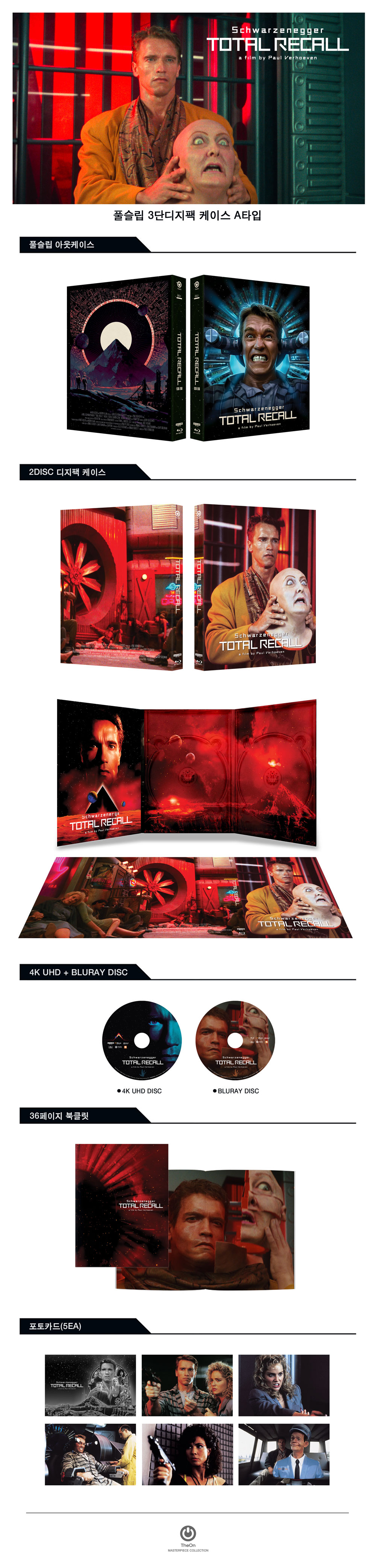본편 (113분) 영상: 2160p 4K 24f h.265/HEVC, 1.85:1 Dolby Vision, HDR10 음성: 영어 Dolby Atmos /DTS-HD MA 2.0 자막 : 한국어, 영어 부가영상(91분) 1. Total Excess: How Carolco Changed Hollywood (59:22) 2. Open Your Mind: Scoring Total Recall (21:24) 3. Dreamers Within the Dream: Developing Total Recall (08:26) 4. Trailer (01:30) BD 본편 (113분) 영상: 1080p HD 24f h.264/AVC, 1.85:1 음성: 영어 Dolby Atmos /DTS-HD MA 2.0 자막: 한국어, 영어 부가영상(93분) 1. Open Your Mind: Scoring Total Recall (21:24) 2. Dreamers Within the Dream: Developing Total Recall (08:26) 3. Total Recall: The Special Effects (23:15) 4. Making of (08:03) 5. "Imagining Total Recall" Featurette (30:12) 6. Trailer (01:30) |