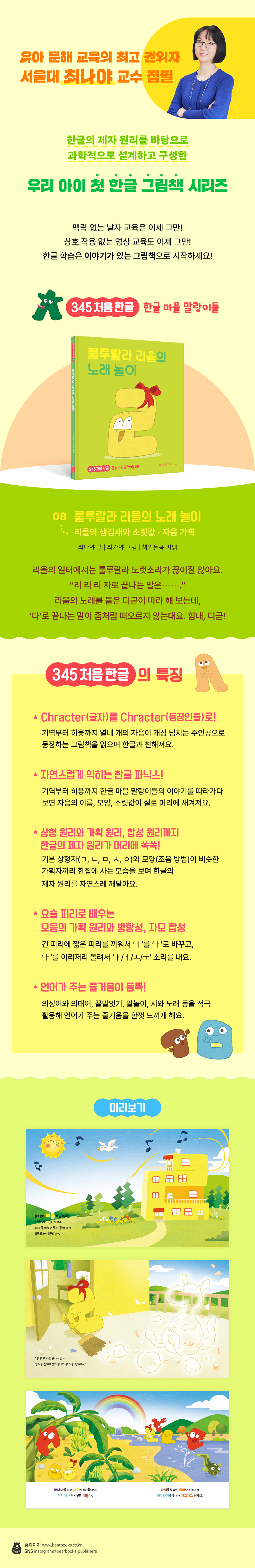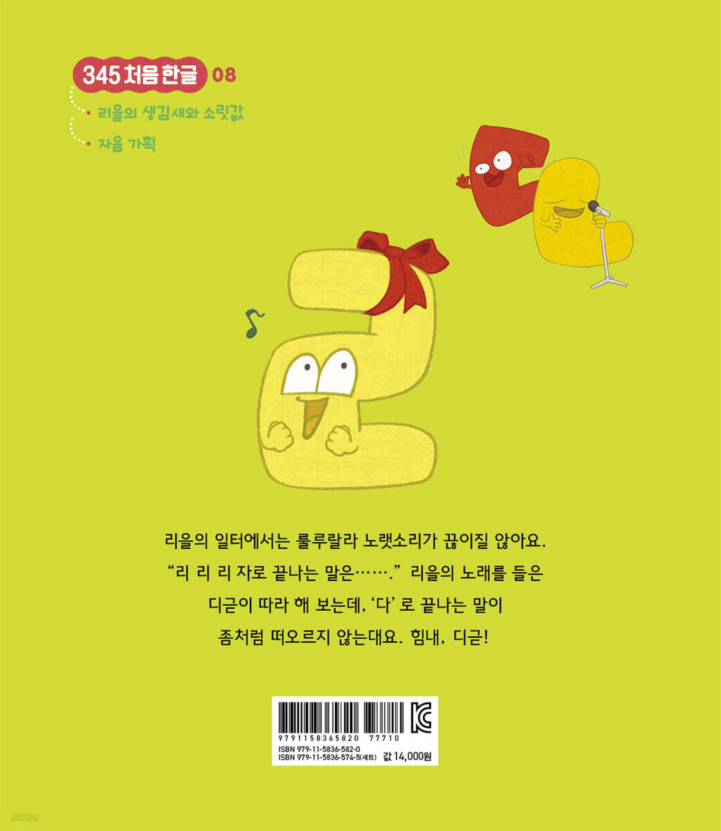 한글의 제자 원리를 바탕으로 과학적으로 설계하고 구성한 우리 아이 첫 한글 그림책 시리즈 맥락 없는 낱자 교육은 이제 그만! 상호 작용 없는 영상 교육도 이제 그만! 한글 학습은 이야기가 있는 그림책으로 시작하세요! 〈345 처음 한글〉 시리즈 여덟 번째 이야기 《룰루랄라 리을의 노래 놀이》 리을은 한글 마을의 의상 디자이너예요. 늘 룰루랄라 노래를 부르며 즐겁게 일하지요. “리 리 리 자로 끝나는 말은 개구리 코끼리 잠자리 병아리 오리너구리-. 루 루 루 자로 끝나는 말은 캥거루 신기루 밀가루 꽃가루 마루 빗자루-.” 리을의 꼬리따기 노래를 들은 니은은 리을을 흉내 내어 ‘나’로 끝나는 꼬리따기 노래를 멋지게 완성하지요. 하지만 디귿은 ‘다’로 끝나는 낱말을 제대로 떠올리지 못해 우스꽝스러운 노래를 만들고 마비다. “아이, 디귿아. 아무 말이나 하면 안 돼.” 리을이 나무라는 바람에 디귿이 잔뜩 풀이 죽지요. 그러자 리을과 니은은 디귿을 위해 함께 낱말 찾기 탐험을 떠나기로 합니다. ‘바나나-나무-무지개-개울가’ 하고 끝말잇기를 하면서 말이지요. 이윽고 친구들의 눈앞에 드넓은 바다가 펼쳐집니다. 그 순간 디귿의 머릿속에 멋진 꼬리따기 노래가 떠오르지요. 세 친구는 디귿이 만든 꼬리따기 노래를 부르며 집으로 돌아옵니다. 친구들의 마음을 사로잡은 디귿의 꼬리따기 노래, 궁금하지 않나요? 최고의 한글 학습 교재는 그림책 유아 문해 교육의 전문가인 최나야 교수가 최고의 유아 한글 학습 교재로 꼽는 것은 다름 아닌 그림책입니다. 유아의 어휘력과 문해력을 기르는 데는 양육자와 유아가 그림책을 함께 보고 함께 나누는 ‘대화’만 한 것이 없다고 하지요. 그런 만큼 〈345 처음 한글〉(전15권) 시리즈도 유아에게 친숙한 ‘이야기 그림책’으로 구성되어 있습니다. 각 권의 주인공은 14개의 자음입니다. 글자의 생김새를 그대로 살려 만든 개성 넘치는 주인공들의 이야기를 따라가다 보면 자음의 이름, 모양, 소릿값이 저절로 머릿속에 새겨지지요. 14개의 자음 친구, 그러니까 말랑이들은 이름과 별명, 색깔까지 모두 초성이 같습니다. 개구쟁이 기역은 갈색, 느림보 니은은 노란색, 덜렁이 디귿은 다홍색이지요. ‘ㄱ/그/, 기역’ 하고 애써 외우려 하지 않아도 저절로 외워질 수밖에 없습니다. 〈345 처음 한글〉은 기역에서 히읗까지 자음 순서대로 구성하지 않았습니다. 한글의 기본 상형자인 기역, 니은, 미음, 시옷, 이응 편을 먼저 읽고 나면 이응이 요정에게 선물 받은 요술 피리로 모음을 배우게 되지요. 요술 피리는 부는 방향을 달리 하거나 구멍이 세 개인 긴 부분에 짧은 부분을 조합해 다양한 소리를 낼 수 있습니다. 어떤 자음이 피리를 부느냐에 따라 각기 다른 소리가 나면서 마법이 일어나지요. 자음과 모음을 합쳐 음절을 만들어 내는 ‘자모 합성’ 원리를 직관적으로 알려주고 있는 것입니다. 그 밖에도 〈345 처음 한글〉의 세계관 속에는 한글의 제자 원리가 자연스럽게 녹아 있습니다. 한글 마을에서는 기역과 키읔(어금닛소리), 니은과 디귿과 티읕과 리을(혓소리), 미음과 비읍과 피읖(입술소리), 시옷과 지읒과 치읓(잇소리), 이응과 히읗(목구멍소리)처럼 조음 원리가 같은 친구들끼리 한집에 삽니다. 한집에 사는 친구들의 이름을 소리 내어 읽고 생김새를 비교해 보며 자음의 상형 원리와 가획 원리를 자연스럽게 익힐 수 있지요. 첫소리가 같은 자음을 반복해 리듬감과 운율을 만드는 두운법, 의성어와 의태어, 끝말잇기, 시와 노래 들을 적극적으로 활용해 언어가 주는 즐거움을 한껏 느껴볼 수 있도록 구성한 점도 빼놓을 수 없습니다. 저자들이 오랜 시간 연구하고 궁리해 만든 〈345 처음 한글〉 시리즈가, 유아들이 인간의 기본권이자 평생 학습의 기반이 되는 ‘문해’의 문턱을 사뿐히 즐겁게 넘어서는데 작으나마 보탬이 되기를 바라 봅니다. |