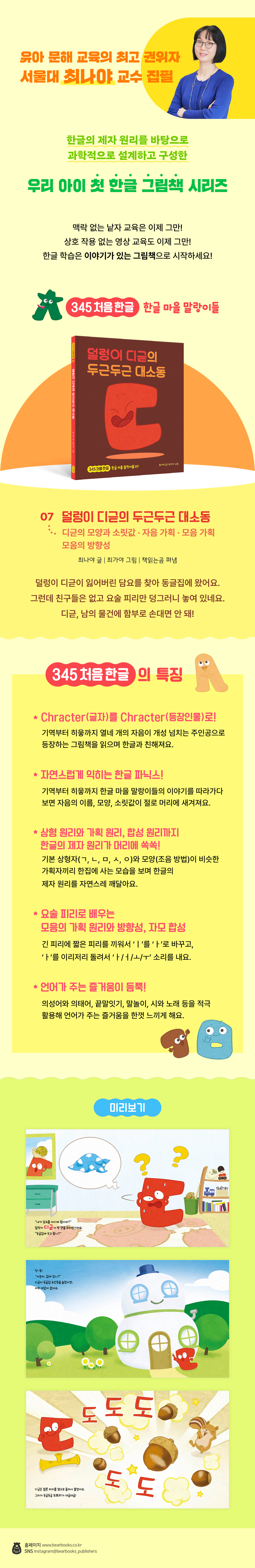 한글의 제자 원리를 바탕으로 과학적으로 설계하고 구성한 우리 아이 첫 한글 그림책 시리즈 맥락 없는 낱자 교육은 이제 그만! 상호 작용 없는 영상 교육도 이제 그만! 한글 학습은 이야기가 있는 그림책으로 시작하세요! 〈345 처음 한글〉 시리즈 일곱 번째 이야기 《덜렁이 디귿의 두근두근 대소동》 덜렁이 디귿이 잃어버린 담요를 찾아 동글집에 갔는데, 이응과 히읗은 안 보이고 빈 거실에 요술 피리만 덩그러니 놓여 있는 게 아니겠어요. 디귿은 지난번에 요술 피리로 불러냈던 다람쥐를 다시 보고 싶은 욕심에 슬그머니 요술 피리를 집어 듭니다. 주인인 이응에게 허락도 받지 않고 말이지요. 디귿이 요술 피리를 다- 다- 다- 불자 귀여운 다람쥐가 나타납니다. 디귿은 다람쥐에게 도토리를 주고 싶어 다시 요술 피리를 도- 도- 도- 붑니다. 그런데 도토리가 너무 많이 생겼지 뭐예요. 디귿은 다람쥐를 더 불러낼 생각에 요술 피리를 들었지만 실수로 두더지를 불러내고 맙니다. 다람쥐와 도토리, 두더지로 난장판이 된 동글집을 어쩌면 좋을까요? 이응과 히읗이 돌아와 이 꼴을 보면 뭐라고 할까요? ‘다/더/도/두’로 시작하는 ‘다람쥐/도토리/두더지/더’라는 낱말이 일으키는 대소동을 통해 모음의 소리와 형태에 집중하게 하는 이야기입니다. 디귿의 모양과 소릿값이 머릿속에 쏙쏙 새겨지는 것은 말할 것도 없지요. 최고의 한글 학습 교재는 그림책 유아 문해 교육의 전문가인 최나야 교수가 최고의 유아 한글 학습 교재로 꼽는 것은 다름 아닌 그림책입니다. 유아의 어휘력과 문해력을 기르는 데는 양육자와 유아가 그림책을 함께 보고 함께 나누는 ‘대화’만 한 것이 없다고 하지요. 그런 만큼 〈345 처음 한글〉(전15권) 시리즈도 유아에게 친숙한 ‘이야기 그림책’으로 구성되어 있습니다. 각 권의 주인공은 14개의 자음입니다. 글자의 생김새를 그대로 살려 만든 개성 넘치는 주인공들의 이야기를 따라가다 보면 자음의 이름, 모양, 소릿값이 저절로 머릿속에 새겨지지요. 14개의 자음 친구, 그러니까 말랑이들은 이름과 별명, 색깔까지 모두 초성이 같습니다. 개구쟁이 기역은 갈색, 느림보 니은은 노란색, 덜렁이 디귿은 다홍색이지요. ‘ㄱ/그/, 기역’ 하고 애써 외우려 하지 않아도 저절로 외워질 수밖에 없습니다. 〈345 처음 한글〉은 기역에서 히읗까지 자음 순서대로 구성하지 않았습니다. 한글의 기본 상형자인 기역, 니은, 미음, 시옷, 이응 편을 먼저 읽고 나면 이응이 요정에게 선물 받은 요술 피리로 모음을 배우게 되지요. 요술 피리는 부는 방향을 달리 하거나 구멍이 세 개인 긴 부분에 짧은 부분을 조합해 다양한 소리를 낼 수 있습니다. 어떤 자음이 피리를 부느냐에 따라 각기 다른 소리가 나면서 마법이 일어나지요. 자음과 모음을 합쳐 음절을 만들어 내는 ‘자모 합성’ 원리를 직관적으로 알려주고 있는 것입니다. 그 밖에도 〈345 처음 한글〉의 세계관 속에는 한글의 제자 원리가 자연스럽게 녹아 있습니다. 한글 마을에서는 기역과 키읔(어금닛소리), 니은과 디귿과 티읕과 리을(혓소리), 미음과 비읍과 피읖(입술소리), 시옷과 지읒과 치읓(잇소리), 이응과 히읗(목구멍소리)처럼 조음 원리가 같은 친구들끼리 한집에 삽니다. 한집에 사는 친구들의 이름을 소리 내어 읽고 생김새를 비교해 보며 자음의 상형 원리와 가획 원리를 자연스럽게 익힐 수 있지요. 첫소리가 같은 자음을 반복해 리듬감과 운율을 만드는 두운법, 의성어와 의태어, 끝말잇기, 시와 노래 들을 적극적으로 활용해 언어가 주는 즐거움을 한껏 느껴볼 수 있도록 구성한 점도 빼놓을 수 없습니다. 저자들이 오랜 시간 연구하고 궁리해 만든 〈345 처음 한글〉 시리즈가, 유아들이 인간의 기본권이자 평생 학습의 기반이 되는 ‘문해’의 문턱을 사뿐히 즐겁게 넘어서는데 작으나마 보탬이 되기를 바라 봅니다. |
