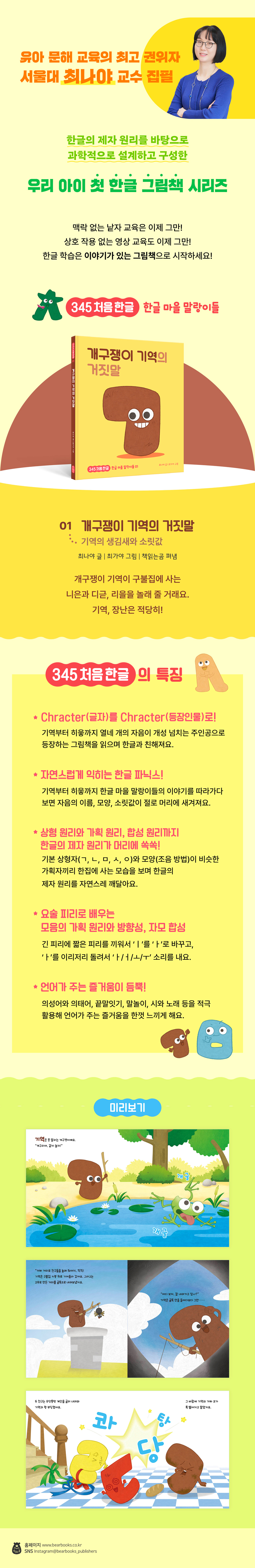 한글의 제자 원리를 바탕으로 과학적으로 설계하고 구성한 우리 아이 첫 한글 그림책 시리즈 맥락 없는 낱자 교육은 이제 그만! 상호 작용 없는 영상 교육도 이제 그만! 한글 학습은 이야기가 있는 그림책으로 시작하세요! 〈345 처음 한글〉 시리즈 첫 번째 이야기 《개구쟁이 기역의 거짓말》 기역은 못 말리는 개구쟁이예요. 온종일 장난칠 궁리밖에 하지 않지요. 오늘은 구불집 굴뚝으로 장난감 거미를 내려보내 친구들을 놀래 줄 작정이에요. 그런데 거미가 잘 내려가고 있는지 들여다보다 그만 굴뚝 속으로 굴러떨어졌지 뭐예요. 그을음투성이가 된 기역이 벽난로에서 기어 나오자, 마침 부엌에서 나오던 니은이 깜짝 놀라 묻습니다. “너, 넌 누구니?” 장난기가 발동한 기역은 천연덕스럽게 말하지요. “안녕? 나는 니은이야?” 자기가 니은이라고 주장하는 이 이상한 녀석이 귀신이라고 생각한 니은은 멀리멀리 달아나 버립니다. 이 소동에 구불집에 사는 또 다른 친구 디귿과 리을이 위층에서 내려오는 소리가 들리자(농부인 티읕은 밭을 돌보러 나가고 없나 봐요), 리을은 재빨리 니은이 떨어뜨리고 간 빵을 코에 달고 키읔 흉내를 내요. 그런데 디귿과 리을도 니은처럼 기역의 거짓말에 속아 넘어가 줄까요? 최고의 한글 학습 교재는 그림책 유아 문해 교육의 전문가인 최나야 교수가 최고의 유아 한글 학습 교재로 꼽는 것은 다름 아닌 그림책입니다. 유아의 어휘력과 문해력을 기르는 데는 양육자와 유아가 그림책을 함께 보고 함께 나누는 ‘대화’만 한 것이 없다고 하지요. 그런 만큼 〈345 처음 한글〉(전15권) 시리즈도 유아에게 친숙한 ‘이야기 그림책’으로 구성되어 있습니다. 각 권의 주인공은 14개의 자음입니다. 글자의 생김새를 그대로 살려 만든 개성 넘치는 주인공들의 이야기를 따라가다 보면 자음의 이름, 모양, 소릿값이 저절로 머릿속에 새겨지지요. 14개의 자음 친구, 그러니까 말랑이들은 이름과 별명, 색깔까지 모두 초성이 같습니다. 개구쟁이 기역은 갈색, 느림보 니은은 노란색, 덜렁이 디귿은 다홍색이지요. ‘ㄱ/그/, 기역’ 하고 애써 외우려 하지 않아도 저절로 외워질 수밖에 없습니다. 〈345 처음 한글〉은 기역에서 히읗까지 자음 순서대로 구성하지 않았습니다. 한글의 기본 상형자인 기역, 니은, 미음, 시옷, 이응 편을 먼저 읽고 나면 이응이 요정에게 선물 받은 요술 피리로 모음을 배우게 되지요. 요술 피리는 부는 방향을 달리 하거나 구멍이 세 개인 긴 부분에 짧은 부분을 조합해 다양한 소리를 낼 수 있습니다. 어떤 자음이 피리를 부느냐에 따라 각기 다른 소리가 나면서 마법이 일어나지요. 자음과 모음을 합쳐 음절을 만들어 내는 ‘자모 합성’ 원리를 직관적으로 알려주고 있는 것입니다. 그 밖에도 〈345 처음 한글〉의 세계관 속에는 한글의 제자 원리가 자연스럽게 녹아 있습니다. 한글 마을에서는 기역과 키읔(어금닛소리), 니은과 디귿과 티읕과 리을(혓소리), 미음과 비읍과 피읖(입술소리), 시옷과 지읒과 치읓(잇소리), 이응과 히읗(목구멍소리)처럼 조음 원리가 같은 친구들끼리 한집에 삽니다. 한집에 사는 친구들의 이름을 소리 내어 읽고 생김새를 비교해 보며 자음의 상형 원리와 가획 원리를 자연스럽게 익힐 수 있지요. 첫소리가 같은 자음을 반복해 리듬감과 운율을 만드는 두운법, 의성어와 의태어, 끝말잇기, 시와 노래 들을 적극적으로 활용해 언어가 주는 즐거움을 한껏 느껴볼 수 있도록 구성한 점도 빼놓을 수 없습니다. 저자들이 오랜 시간 연구하고 궁리해 만든 〈345 처음 한글〉 시리즈가, 유아들이 인간의 기본권이자 평생 학습의 기반이 되는 ‘문해’의 문턱을 사뿐히 즐겁게 넘어서는데 작으나마 보탬이 되기를 바라 봅니다. |