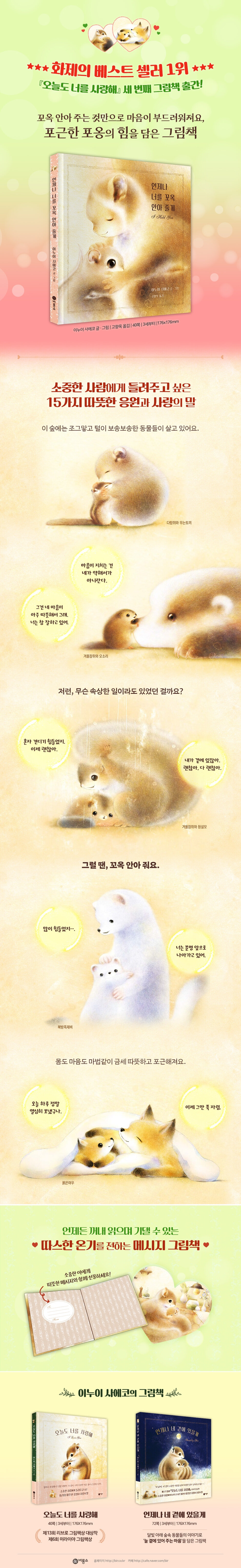 ‘꼬옥 안아 주는 것만으로 몸도 마음도 따뜻해진단다. 사랑해.’ 『언제나 너를 꼬옥 안아 줄게』는 속상한 마음을 말로 표현하기 어려운 아이들이 부모의 품에 안긴 채 천천히 감정을 풀어 갈 수 있도록 돕는 그림책이다. “잘하고 있어”, “괜찮아” 같은 부드러운 위로와 응원의 말을 차분히 읽어 주면, 아이의 속상했던 마음이 조금씩 누그러진다. 책장을 넘길 때마다 등장하는 동물들의 따뜻한 눈빛과 서로를 꼭 안아 주는 모습은 마치 아이 곁으로 다가와 “괜찮아, 네 마음을 알고 있어.”라고 말해 주는 것 같다. 이 위로는 아이에게만 머무르지 않고, 일상에 지치고 힘든 모든 이들에게 잠시 기대어 숨 고를 수 있는 시간을 내어 주며 마음을 차분하게 가라앉혀 준다. 부모와 아이는 물론, 연인·부부·친구 등 서로에게 마음을 건네고 싶은 사람들과 함께 나누기 좋은 그림책이다. ■ 언제든 꺼내 읽으며 기댈 수 있는, 따스한 온기를 전하는 그림책 『언제나 너를 꼬옥 안아 줄게』는 마음을 전하는 작고 소중한 선물 같은 그림책이다. 표지에서부터 질감이 느껴지는 따뜻한 미색 바탕의 배경에 한 올 한 올 촘촘하고도 세밀하게 그려낸 작고 보송보송한 동물들은 그림만으로도 다정한 기운과 따스한 온기가 느껴진다. 속상한 일이 있어 눈물이 그렁그렁 맺힌 작은 동물, 그리고 그 곁을 지키며 꼬옥 안아 주는 큰 동물이 서로 몸을 맞대고 온기를 나누는 모습에 보는 이의 마음까지 포근해진다. 또 각 페이지 밑에는 등장 동물들의 명칭이 표기되어 있어 두더지와 다람쥐 같은 익숙한 동물의 이름은 물론이고 우는토끼, 겨울잠쥐, 북방족제비와 같은 다소 생소할 수 있는 다양한 동물까지 새롭게 알아갈 수 있다. 책의 커버 재킷부터 면지까지는 예쁜 포장지가 연상되는 문양의 빈티지 패턴으로 구성되어 있고, 뒷면지에는 짧은 편지를 쓸 수 있는 작은 메모 공간이 있어 소중한 이에게 마음을 담아 선물하기에도 제격이다. 손에 쥐기 좋은 작은 판형까지 더해져, 부담 없이 건네고 오래 곁에 둘 수 있는 그림책이다. |