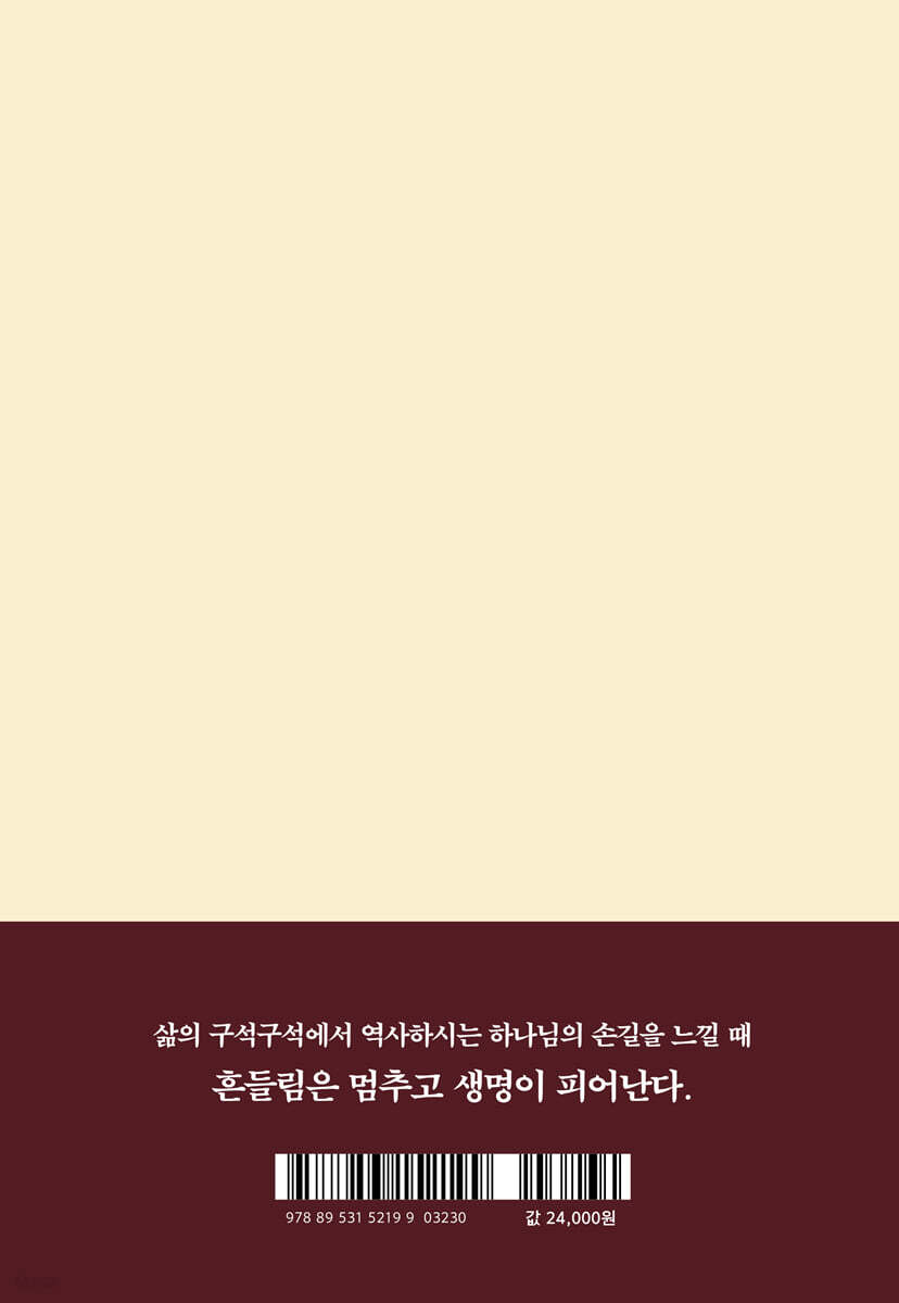 선택의 고통에 맞닥뜨렸다면, 인생에서 제거해야 할 것을 제거하고 더해야 할 것을 더해야 한다는 뜻입니다. 하나님 앞에서 자신을 돌아보아 회개하고 결단하는 것이 뺄셈이요, 고통을 타개할 잠재력을 발견하여 분출하는 것이 덧셈입니다. 그러면 고통 속에서 하나님과 새로운 관계를 맺게 됩니다. 이것이 새로운 축복으로 나아가는 길입니다. --- 본문 중에서 어떤 마음과 태도로 살아가느냐가 미래를 결정합니다. 성령을 위하여 심으면 영생을 거둡니다. 성령을 위해 심는다는 것은 영원한 가치를 추구하는 삶의 태도입니다. 세상에는 영속하는 기업도, 영속하는 교회도 없습니다. 태도는 배의 돛과 같습니다. 돛의 방향에 따라 여정이 달라짐을 기억하십시오. --- 본문 중에서 당신 안에도 ‘부족감’이라는 신 레몬이 있지 않습니까? ‘레몬‘ 하면 먼저 상큼함이 떠오를 것입니다. 그런데 레몬 자체는 너무 셔서 별로 매력이 없습니다. 그런데도 레몬을 보면, 산뜻하고 시원한 맛을 떠올리게 되는 것은, 레몬이 다른 재료와 어우러져 내는 맛이 기가 막히기 때문입니다. 학교나 직장에서 새로운 일을 시작해야 할 때 자신의 부족함 때문에 당황해 본 적이 있을 것입니다. ‘내가 이 일을 감당할 수 있을까?’ 하는 부족감이 발걸음을 주춤하게 만들고, 우리 삶과 사역을 위축시키곤 합니다. 그러나 걱정하지 마십시오. 하나님은 신 레몬과 같은 부족감을 레모네이드로 바꾸어 주기를 원하십니다. --- 본문 중에서 믿음 있는 사람만이 쉴 수 있습니다. 우리 인생에 오아시스가 필요한 것을 모르는 사람이 누가 있겠습니까? 그런데도 쉬지 못하는 것은 조급함과 경쟁심 때문입니다. 엘리야는 로뎀나무 아래에서 쉬며 하나님의 공급을 받고, 그 힘으로 40일 밤낮을 걸어 하나님의 산 호렙에 이르렀습니다. 우리에게 쉼은 단순히 체력을 회복하는 시간이 아니라, 하나님을 만나고 그분의 음성을 듣는 거룩한 시간입니다. 오아시스에서 힘을 얻어야만 우리는 주어진 사명의 길을 다시금 힘차게 걸어갈 수 있습니다. --- 본문 중에서 선박에 Load line(적재 한계선)이 있듯이 영혼에도 Lord line(신앙의 선)이 있습니다. 로드 라인(Load line)이 배의 안전을 위해 짐을 실은 선체가 물속에 잠기는 한도를 나타내듯이 영혼의 로드 라인(Lord line)은 멍에의 무게로 영혼이 가라앉는 한도를 나타냅니다. 영혼의 로드 라인(Lord line)을 깊이 내려 잡아 멍에를 주께 많이 맡길수록 우리 인생의 짐이 가벼워짐을 느낄 수 있습니다. 마찬가지로 인생에서 구원과 상관없는 것을 비워 내야만 십자가를 능히 질 수 있습니다. 영혼의 로드 라인 지키기를 습관화하려면, 인내를 훈련해야 합니다. 몸에 밴 습관을 고치거나 버리기는 쉽지 않습니다. 오래 밴 습관일수록 더욱 힘든 법입니다. 세상이 주는 “무거운 멍에”(왕상 12:11)의 습관을 버리고, 절제로써 영혼의 로드 라인을 지키기까지 인내하십시오. --- 본문 중에서 |
