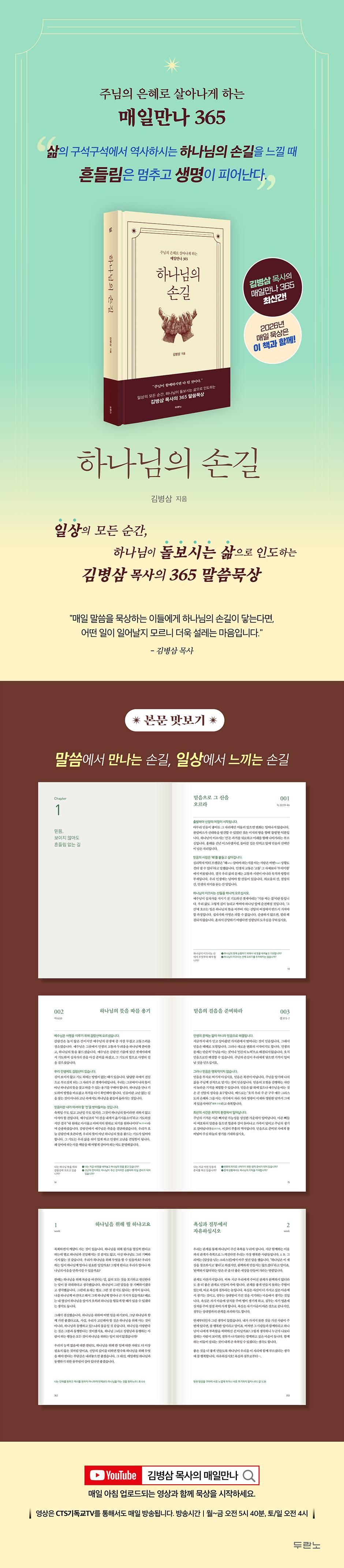 1부 [말씀 묵상] 말씀에서 만나는 손길 1 - 만져 주시는 손길, 믿음으로 발견하다 01 믿음, 보이지 않아도 흔들림 없는 길 02 태도, 삶의 여정을 결정하는 돛 03 기도, 하늘과 땅을 잇는 능력 2 - 붙들어 주시는 손길, 견딤으로 맺는 회복과 변화 04 회복, 무너진 자리에서 다시 일어서는 힘 05 인내, 기다림 속에서 자라는 깊은 뿌리 06 변화, 빚어지며 발견하는 참모습 3 - 빚어 가시는 손길, 성숙으로의 동행 07 순종, 내 뜻을 내려놓을 때 열리는 문 08 은혜, 사소한 순간에도 스며드는 빛 09 감사, 평범한 하루에 숨겨진 선물 4 - 사명으로 이끄는 손길, 삶으로 증거하다 10 사랑, 끝까지 품어 주시는 따스한 품 11 능력, 부르심에 합당하게 행할 힘 12 찬양, 모든 것을 주님께 돌려 드리는 노래 2부 [신앙 에세이] 일상에서 느끼는 손길 1-53 week |