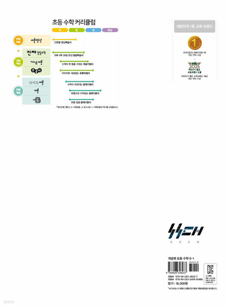 수학의 기초가 되는 것은 바로 개념을 익히는 것입니다. 기초부터 단계를 차근차근 밟아나가야 단단하게 실력을 키울 수 있습니다. 〈개념쎈〉은 개념북으로 개념을 쉽고 빠르게 이해하고, 워크북으로 다시 한번 확인하며 개념을 다질 수 있도록 하였습니다. 개념북+워크북 반복 학습 시스템을 통해 개념을 완벽하게 이해하고 완전히 자기 것으로 만들 수 있습니다. 〈개념쎈〉은 수학 실력을 쌓기 위한 첫 번째 개념기본서입니다. |