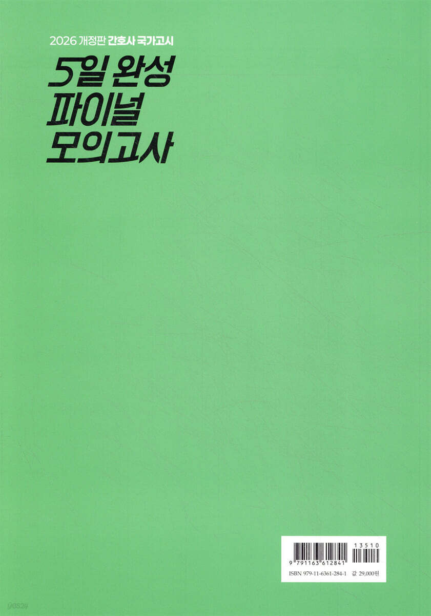 출제 비중이 높았던 핵심 문제들을 다각도로 분석해 완벽하게 수록하여 모의고사를 풀면서 핵심 개념뿐만 아니라 관련 개념까지 확실하게 학습할 수 있다. 2) 최신 출제 경향을 완벽하게 분석하여 정확하게 반영 2025 간호사 국가고시 포함 최신 간호사 국가고시의 출제 경향을 완벽하게 분석, 반영하여 출제하였다. 특히 사례형 및 긍정형의 문제 유형에 익숙해질 수 있도록 다수 출제하였으며, 시험 출제 가능성이 높은 다양한 유형의 문제들을 수록하여 간호사 국가고시 대비를 완벽하게 할 수 있다. 3) 중복되는 문제없이 전 과목, 전 영역 빠짐없이 출제 총 5회의 모의고사에 최대한 중복 없이 다양한 개념들을 출제하여 단시간에 국가고시 전 과목, 전 영역의 주요 핵심 내용과 개념들을 빠짐없이 학습할 수 있다. 4) 문제만큼 공들여 제작한 자세하고 명쾌한 해설 해설집이 모의고사와 분리되어 있어 답안 체크 및 오답 정리에 유용하다. 또한, 단순히 정답에 대한 설명뿐만 아니라 오답 풀이도 상세하게 되어있으며 수험생들의 체감 난도가 높은 과목들의 주요 개념 및 핵심 내용이 표/ 그림으로 도식화되어 있어 한눈에 파악하고 쉽게 이해할 수 있다. · 구매 혜택 -10일 완성! 온라인 스터디 제공 -모의고사 해설 동영상 강의 무료 제공 ※ 25년 12월 중 운영 예정이며 출판사 사정에 따라 운영 회차 및 기간은 변경될 수 있습니다. ※ 구매 혜택에 대한 자세한 내용은 www.ganjunmo.com에서 확인하세요. 2026년 국가고시 시험일까지 제공됩니다. |