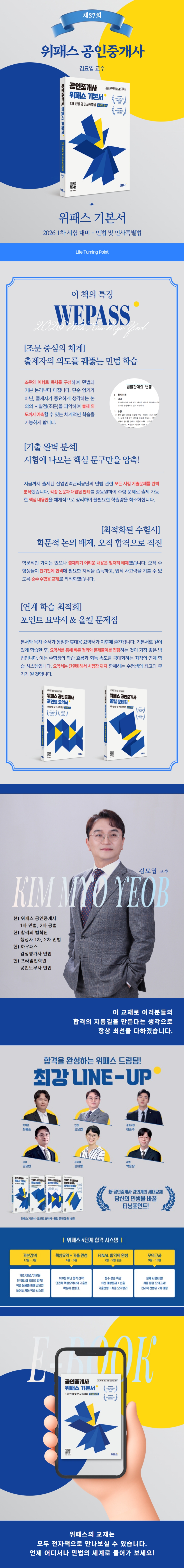 "두려움을 극복하고 합격으로 가는 터닝 포인트! 민법의 신(神) 김묘엽 교수가 설계한 가장 체계적인 민법 로드맵"민법은 단순히 외워야 할 과목이 아니라, 논리적이고 체계적인 사고를 훈련하는 핵심 과목입니다. 『위패스 공인중개사 민법 기본서』는 수많은 수험생들의 불안감과 두려움을 흥분과 쾌감으로 바꾸고자 하는 김묘엽 교수의 강한 소명 의식에서 탄생했습니다.본서는 '법적 분쟁 예방'과 '논리적 사고 함양'이라는 법 공부의 근본 목표에 충실하며, 출제자의 의도를 파악하는 민법 학습이라는 혁신적인 방법을 제시합니다. 기출 문구와 조문 중심의 체계적인 구성은 수험생들이 방대한 민법 속에서 길을 잃지 않고 합격이라는 명확한 터닝 포인트를 향해 나아갈 수 있도록 돕습니다.김묘엽 교수의 '논리적 사고'와 '체계적인 정리 습관'이 집약된 이 교재는, 여러분이 겪는 수험의 모든 과정을 가장 효율적이고 값진 성취로 만들 것입니다. 지금 이 순간, 새로운 도전을 시작하는 모든 수험생에게 이 책을 강력히 추천합니다.